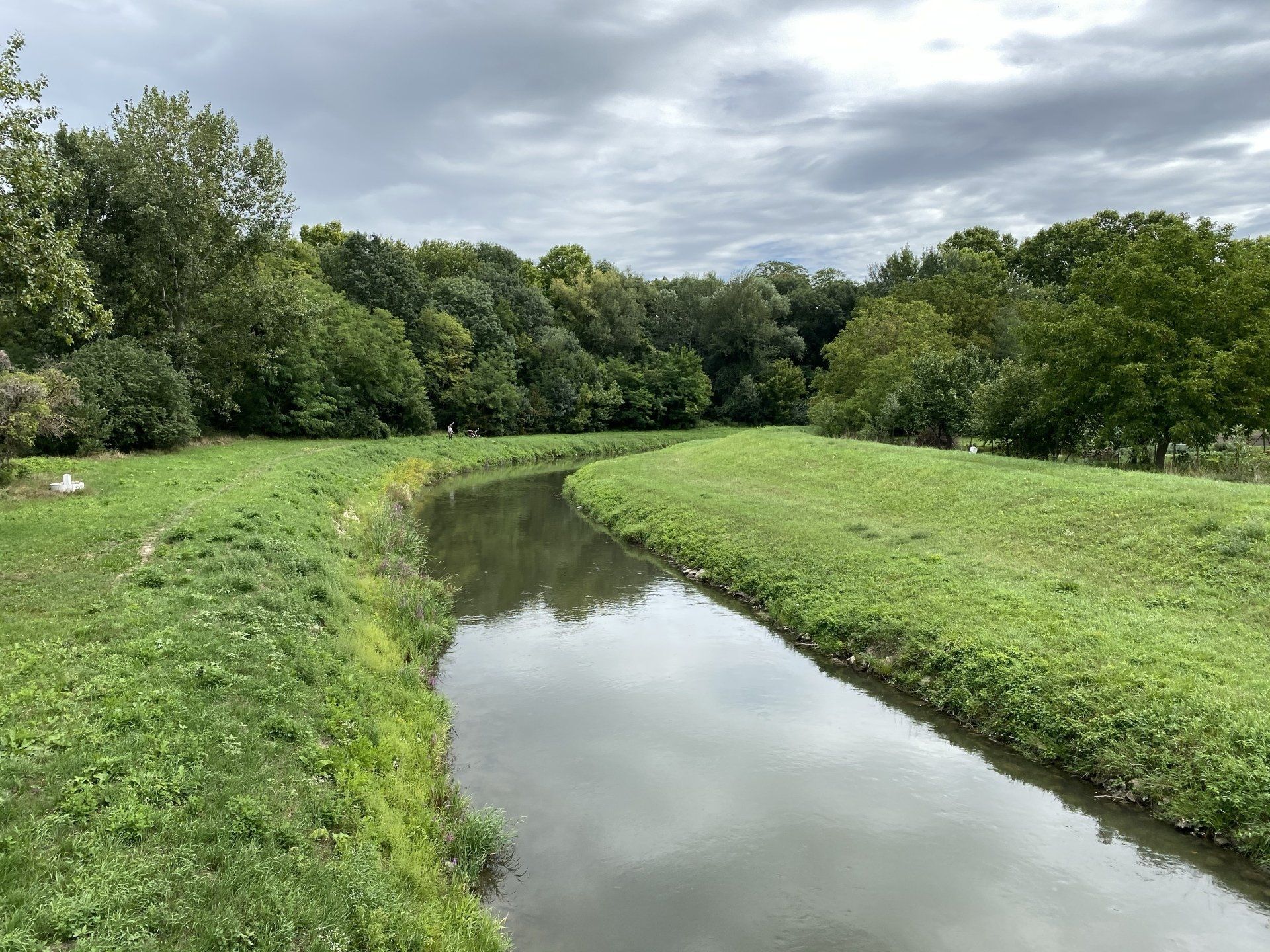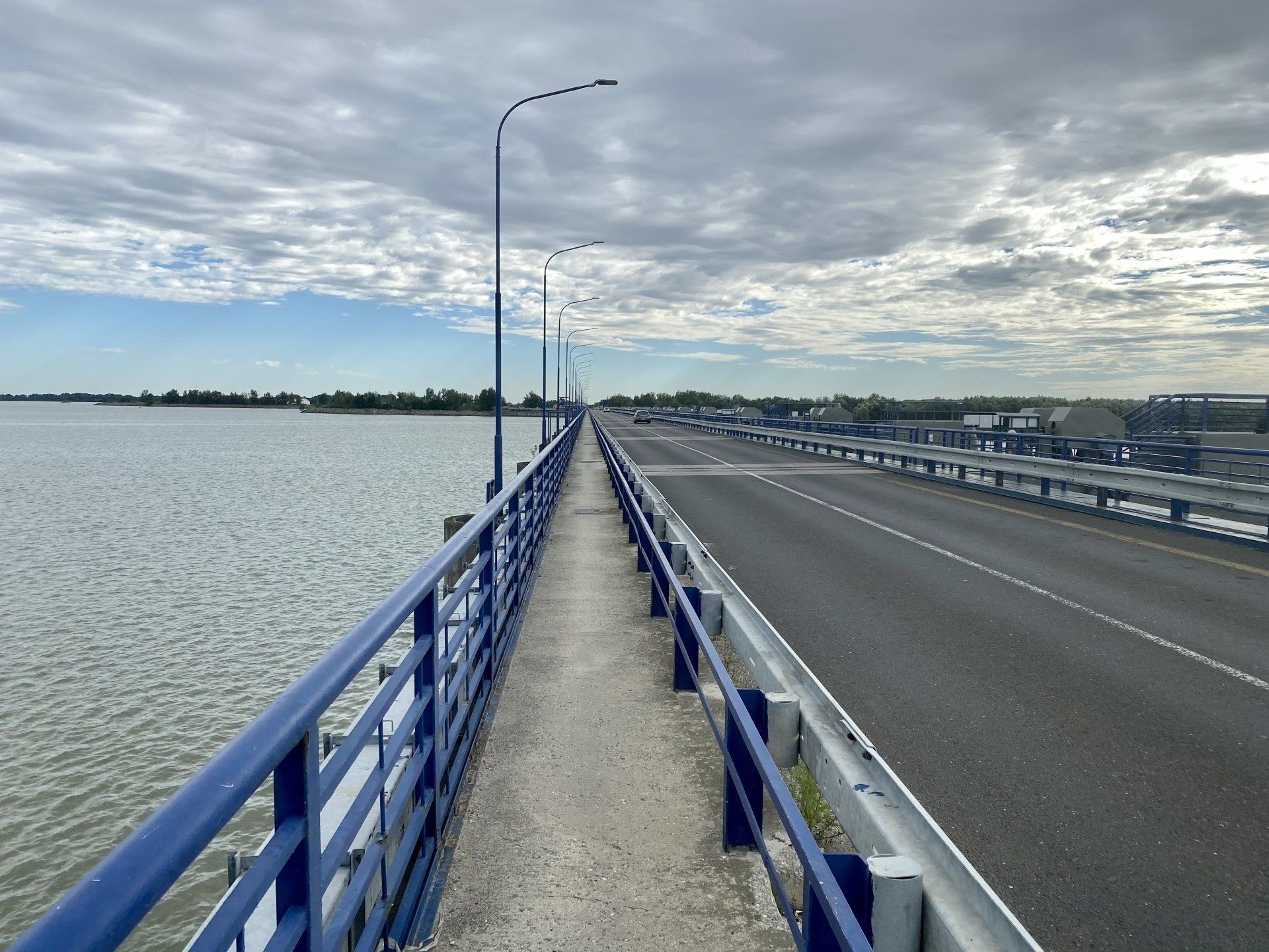 Wie gesagt, der Radweg ist ein Traum. Nachdem ich mich jetzt auf der Südseite der Donau befinde, ist die Donau in meinem linken Gesichtsfeld. Zwischen den Uferbäumen sehe ich, dass sie plötzlich sehr weitläufig ist und eher den Eindruck eines Sees macht. Ich nehme den nächsten Abzweig vom Radweg auf die Straße, die zu der nächsten nördlichen Donaustadt führt und bewundere die Weite des Stroms. Ein Teil der Donau dient zur Elektrizitätsgewinnung, es ist eine kleine Staumauer vorhanden. Andere Teile dieses Areals mit Einbeziehung des Stauwerks sind dem Freizeitvergnügen gewidmet. So finden sich hier ein Jachthafen, eine Wildwasser Raftinganlage und eine Flußsurfanlage, am Ende der Staumauer gibt es noch das Danubia Meulensteen