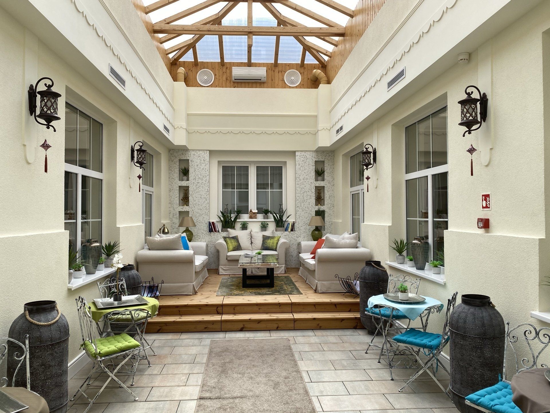 an und versorge mich mit einem Stückchen Käse und einem Kornweckerl, welches dann auf einer Parkbank unweit vom Schloss verzehrt wird. Um 13 Uhr starte ich den nächsten Versuch und siehe da, ich kann mein Zimmer beziehen. Ich habe die Deluxe