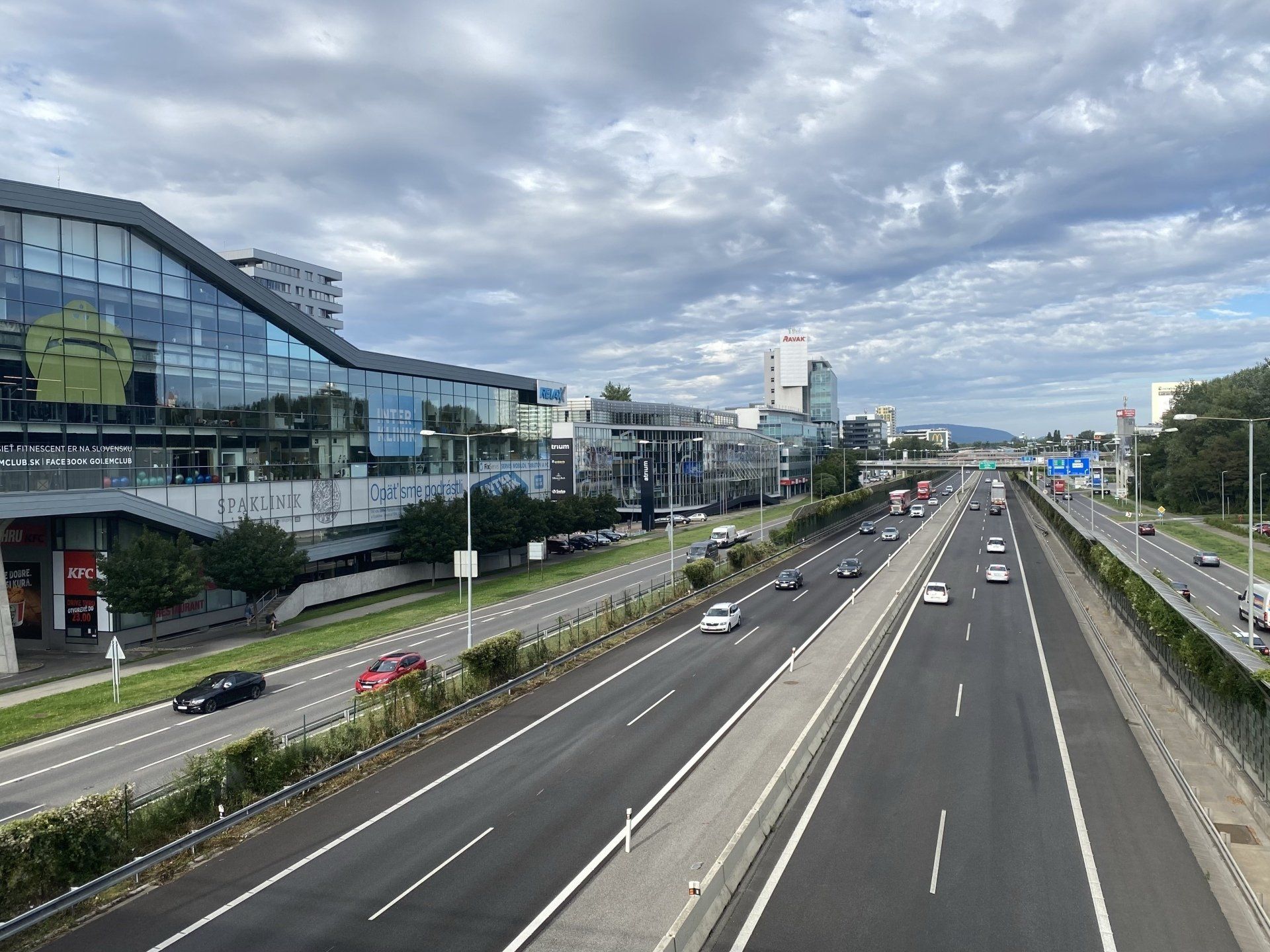 Vorbei an ein einem Einkaufszentrum, ein letzter Blick auf die Außenbezirke von Bratislava, es sind hier die typischen sozialistischen Plattenbauten zu sehen und es geht bei herrlichstem Wetter, leicht bewölkt und angenehmen Temperaturen bei leichtem Rückenwind fast wie von selbst - diesmal keine Plagerei.
