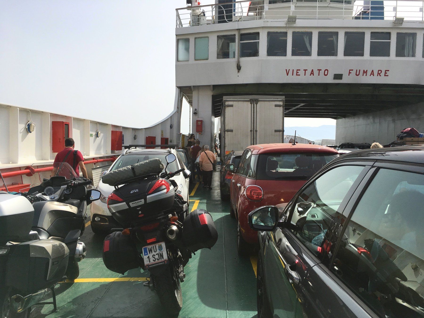 ... echt warmes/heißes Wetter ist für unterwegs heute angesagt, daher mache ich mich nach dem üblichen Frühstück - langsam gewöhne ich mich daran - um fast pünktlich 8 Uhr auf den Weg nach Pompeji. Es hat erfrischende 26°, Catania lasse ich recht schnell hinter mir, erstaunlicherweise ist wenig Verkehr. Ich ziehe mit der erlaubten Höchstgeschwindigkeit dahin, meistens also 130 km/h und nach einer guten Stunde erreiche Messina. Dort kaufe ich ein Ticket für die Fähre zum "echten" Italien und wie es bei Motorradfahren so üblich ist, schlängele auch ich mich an den Autos vorbei und lasse mich von einem Hafen-/Fährenmitarbeiter auf die Fähre winken. Das ist echt super und funktioniert eigentlich immer - der Sonderstatus der Motorradfahrer - keine Ahnung warum das so ist, aber es ist allgemein akzeptiert und keiner regt sich auf - zumindest bekomme ich davon nichts mit ;-).