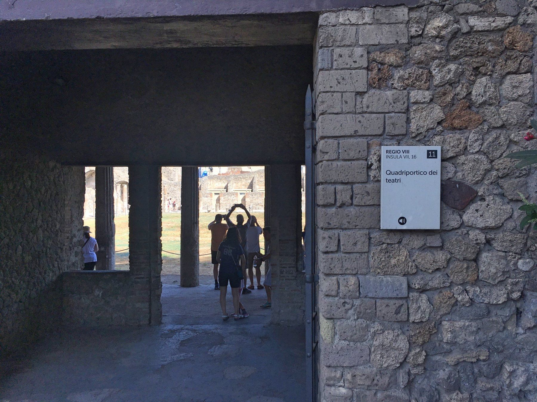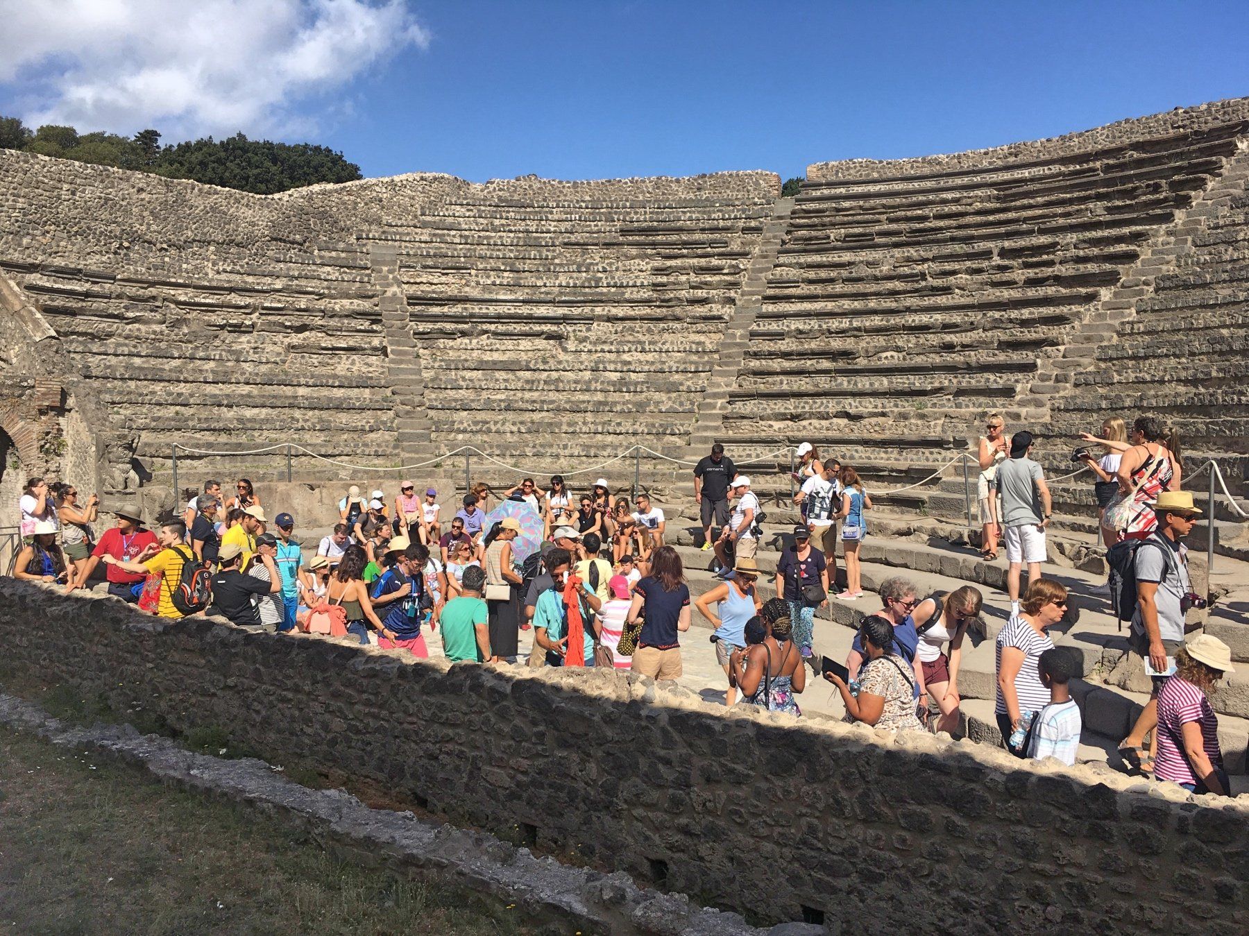 Die Menschenmassen schieben sich von einer Stelle zur nächsten, es ist viele geführte Gruppe unterwegs. Leute mit Fähnchen oder Schirmen gehen vor Menschentrauben voraus, es herrscht ein irrsinniges Sprachengewirr. Nach kurzer Zeit geht es zum "eigentlichen" Eingang der Ausgrabungsstätte. Ein Torbogen öffnet den Weg zu einem Forum, von dem es zum ersten Theater geht. Langsam fangen die Massen an, sich zu verteilen und die ersten Blicke auf das gigantische Ausmaß dieser einstigen Stadt werden sichtbar.