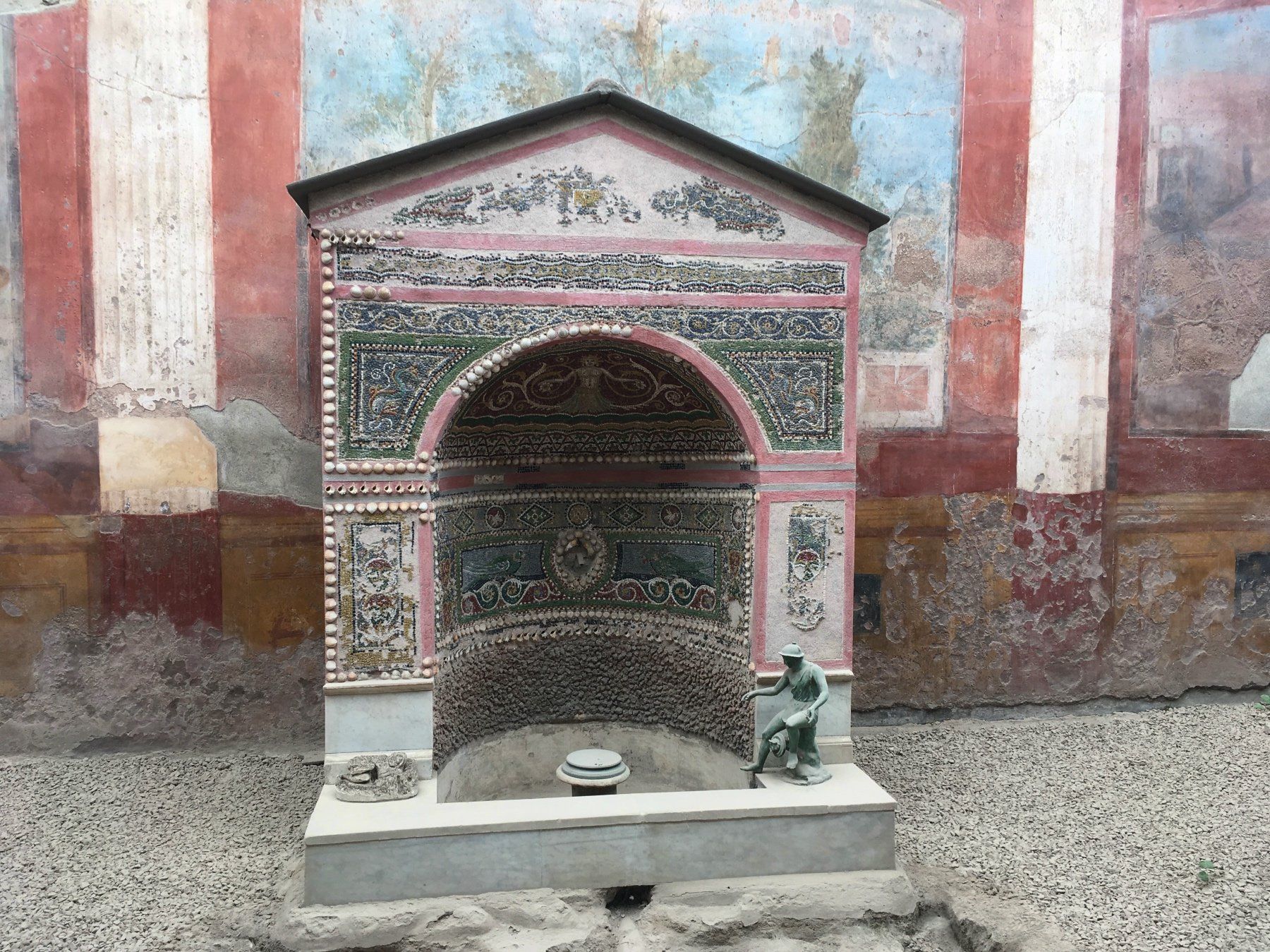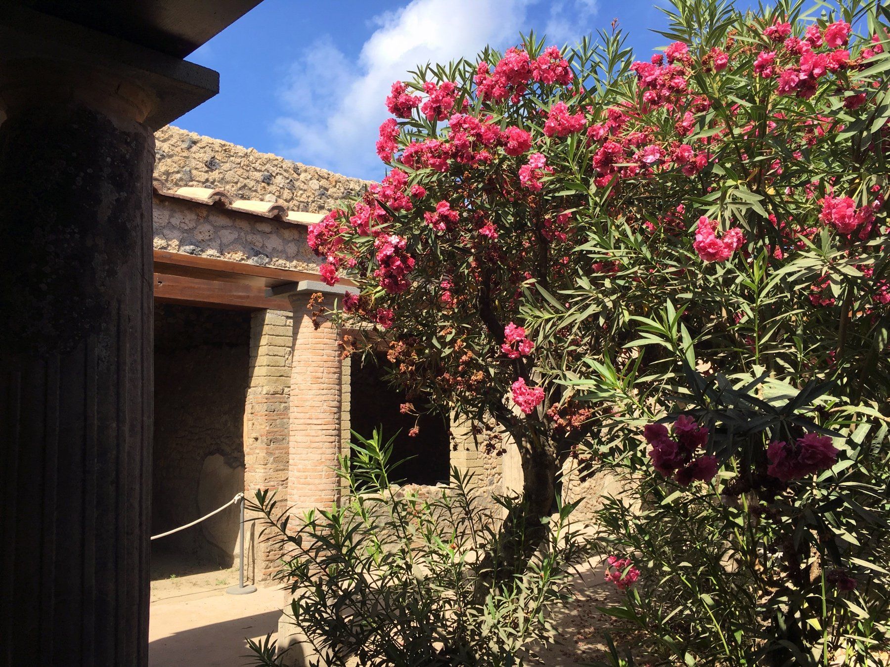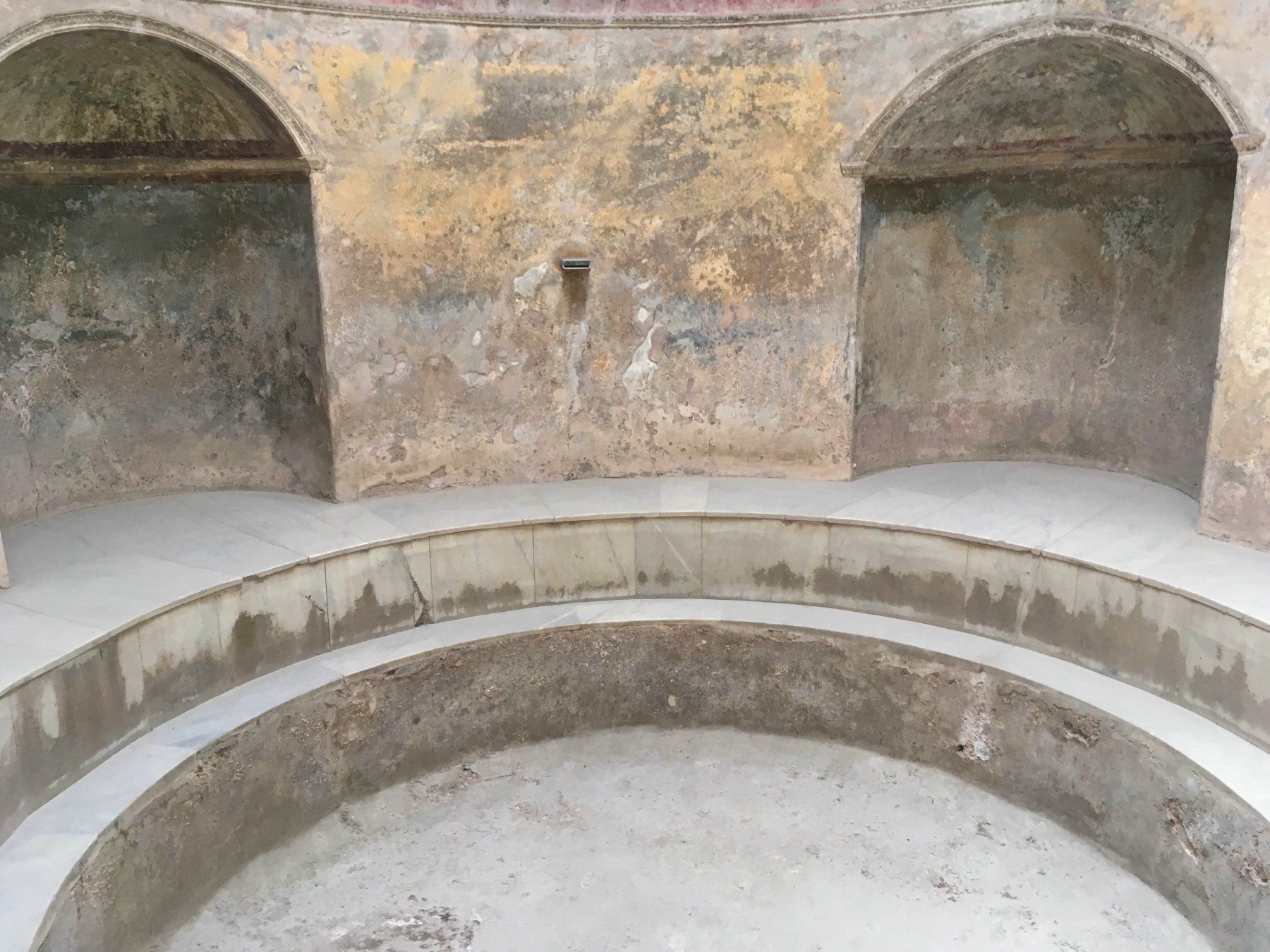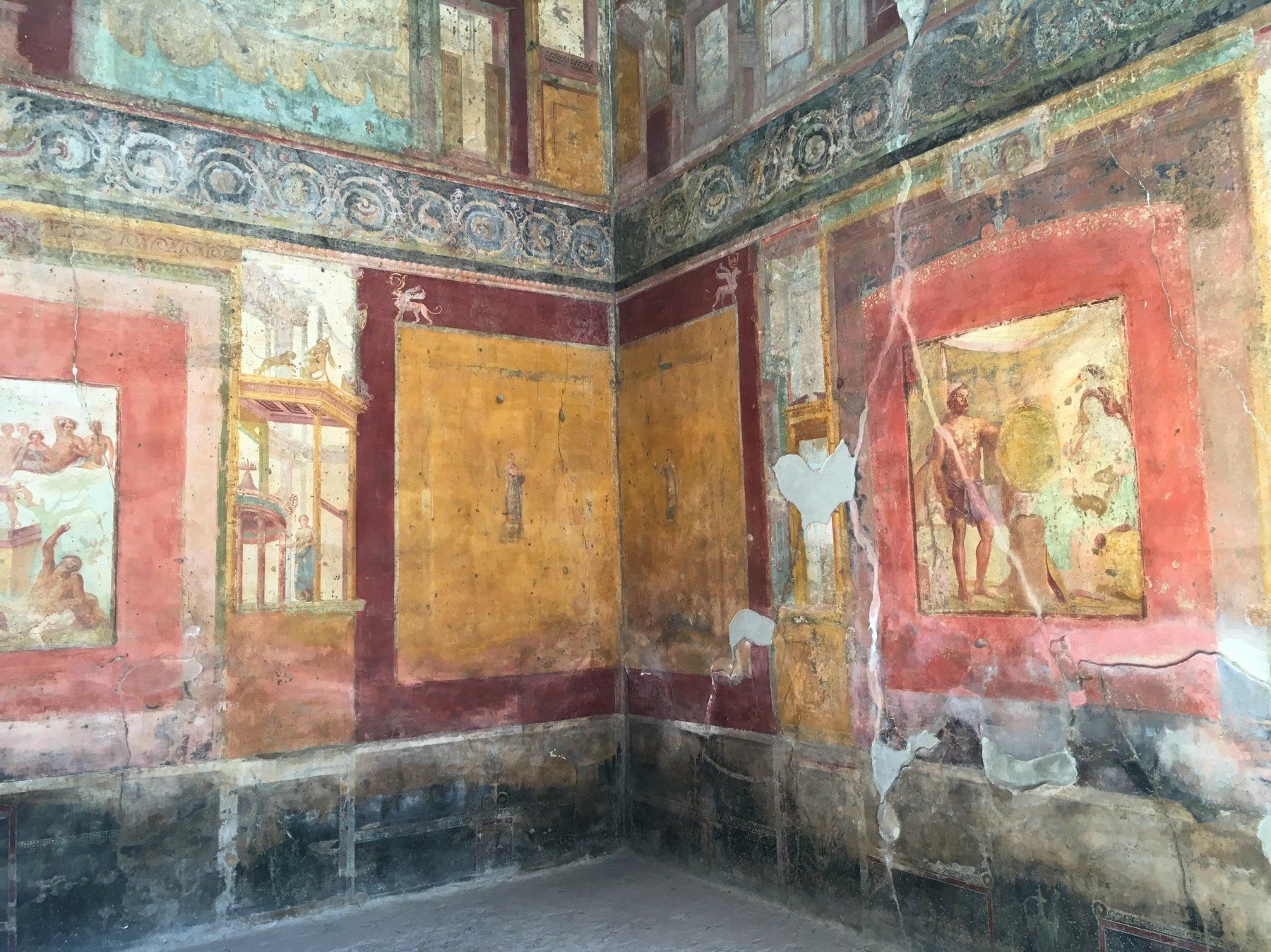 Es geht über breite Straßen, die Pflasterung der Straßen ist übrigens aus Lavasteinen, durch schmale Gassen. Es können Häuser in noch recht gutem Zustand besichtigt werden. Die Wandmalereien sind Originale - also ca. 2.000 Jahre alt. Diese sind nicht sonderlich geschützt. Es sind tolle Innenhöfe und Gärten zu besichtigen. Und natürlich dürfen auch die Bäder nicht fehlen. Die Dimension und Weite dieser ehemaligen Stadt überrascht mich - je weiter ich in Richtung "Stadtgrenze" komme, umso leerer werden die Straßen, bis ich mich dann tatsächlich alleine auf einer wiederfinde.