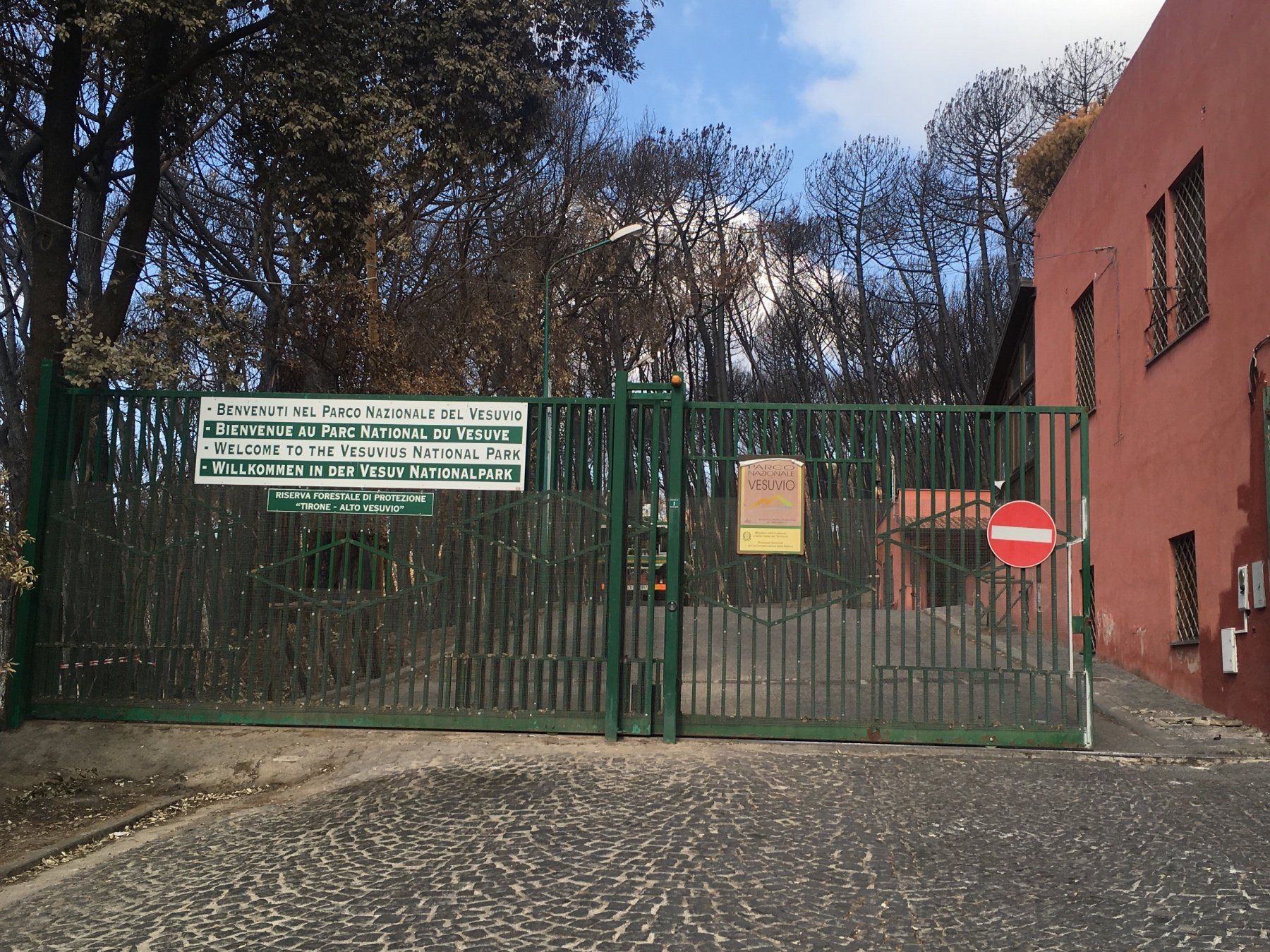 Tatsächlich geht die ansteigende Asphaltstraße nach wenigen Kilometern in eine Straße mit Kopfsteinpflaster über - wie ich das liebe ... steile Straßen und dann abgewetztes und spiegelglattes Kopfsteinpflaster mit Lücken, Löchern, Aufwölbungen und sonst alle möglichen Widrigkeiten. Es heißt also langsam und mit Bedacht fahren. Bei Regen sicher ein Höllenkommando ;-) - aber es ist ja schön. Nach weiteren 3 Kilometern kommt ein Zaun und ein Tor, das mir die Durchfahrt verwehrt. Dies ist der Eingang zum Nationalpark des Vesuvs. Das Tor wird kurz geöffnet, ich fahre hinein und man sagt mir, dass der Nationalpark gesperrt ist - fotografieren ist hier auch verboten. Insgesamt macht die Umgebung beim Eingang einen sehr gespenstischen Eindruck. Verkohlte Bäume, weiße Asche am Boden - es hat hier mächtig gebrannt!!! Ich drehe also um und weiter unten habe ich die Möglichkeit, das Trauerspiel und die Verwüstung zu fotografieren.