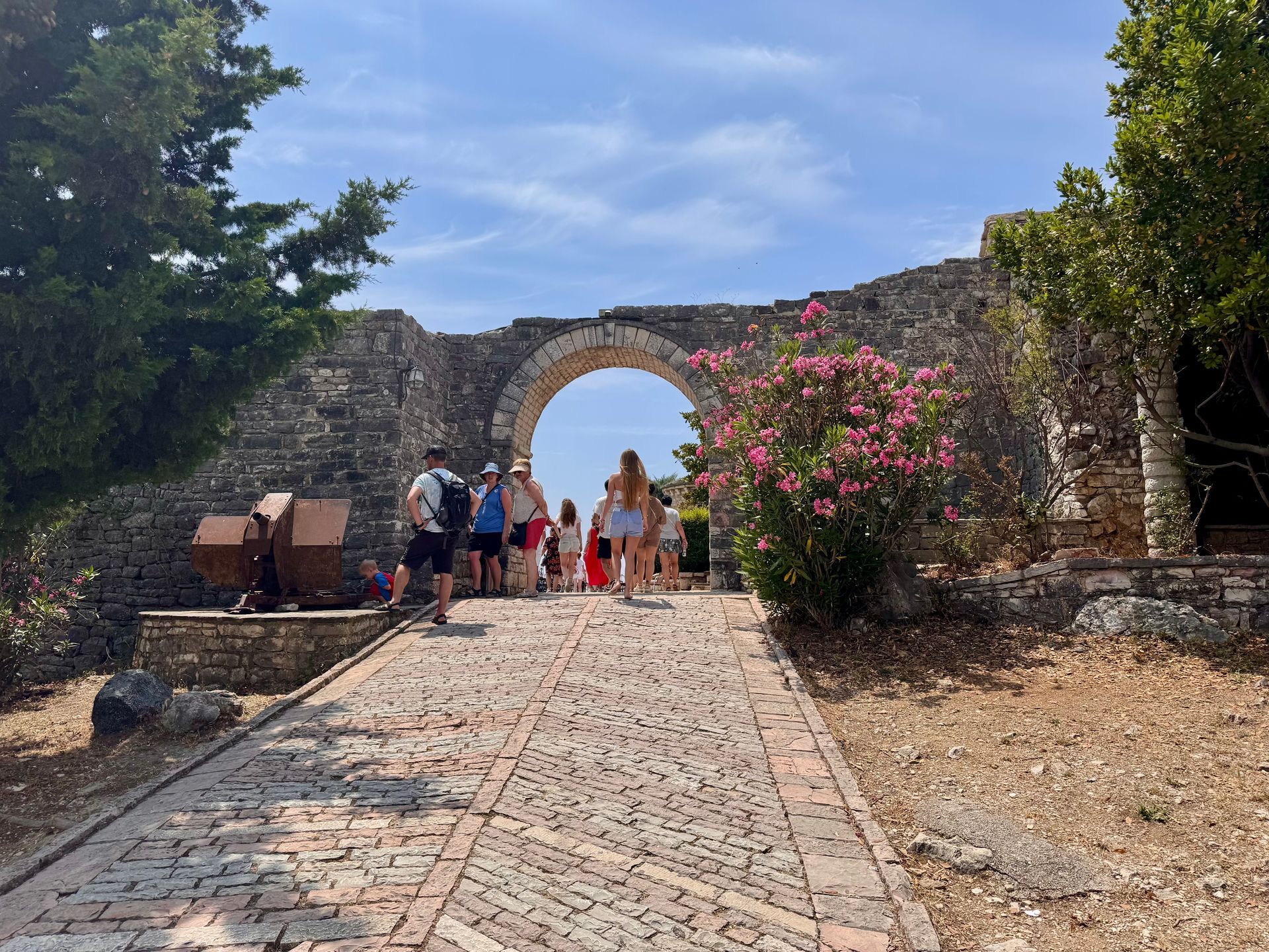 Zurück im Bus geht es zu unserem nächsten Punkt, der Burg Lekuresi. Diese befindet sich hoch über der Stadt Saranda im Süden Albaniens und trägt ihren Namen, weil sie im gleichnamigen Ort Lekures liegt. Von den Burgwällen hatte man früher genauso wie heute einen sehr weiten Blick auf die Umgebung. Die Burg stand somit an einem strategisch besonders wichtigen Punkt. Sultan Suleiman ließ die Festung im Jahr 1537 errichten, da er die griechische Insel Korfu attackieren wollte und dazu den Hafen sowie die Bucht von Saranda kontrollieren musste. Außerdem konnte so die bedeutende Straße nach Butrint überwacht werden. Die Burg als solches gibt nicht viel her, sie hat auch keine eigene Webpage, der Ausblick von hier oben ist aber grenzgenial - und das/die Restaurants und die Terrassen auf zwei Ebenen verteilt, werden beim abendlichen Sonnenuntergang sehr sehr gut besucht sein. Die Lage und das Ambiente sind schon ein Traum.