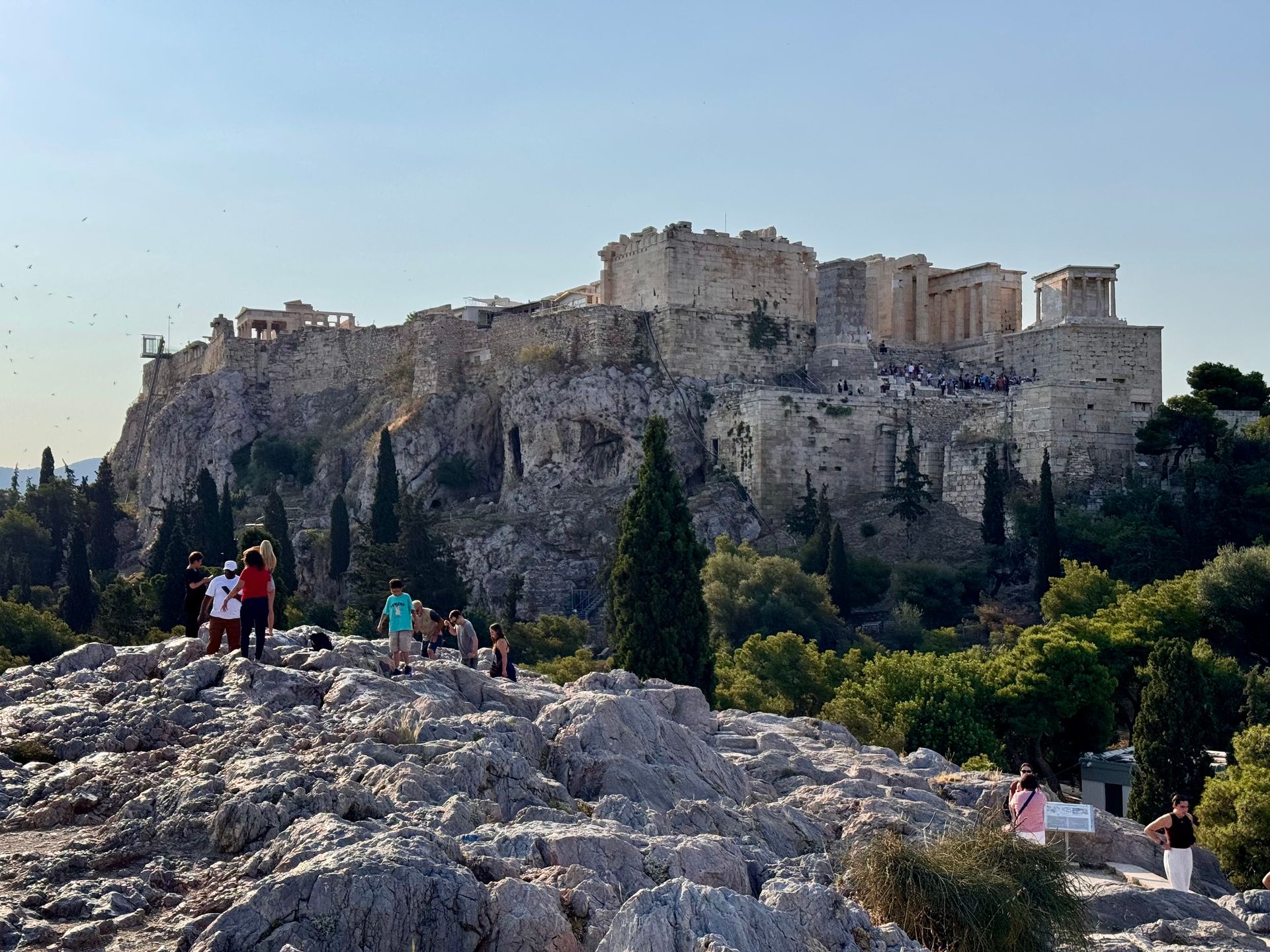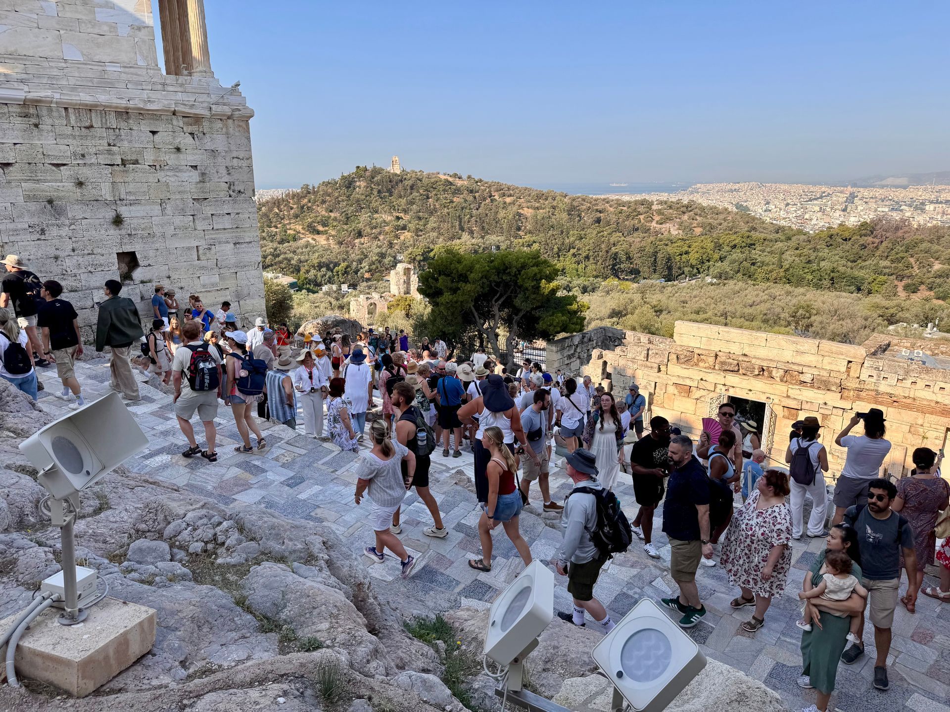 Erstaunlicherweise verteilen sich die vielen Menschen auf dem Plateau, sodass der Ausblick auf die Akropolis hervorragend ist. Wieder eine kurze Einführung zur Akropolis, den kompletten Artikel zum Nachlesen dann per Link unten 😄: "Die Akropolis in Athen (altgriechisch ἡ Ἀκρόπολις τῶν Ἀθηνῶν hē Akrópolis tôn Atʰēnôn; neugriechisch η Ακρόπολη της Αθήνας i Akrópoli tis Aθínas, „die Oberstadt Athens“) ist die wohl bekannteste Vertreterin der als Akropolis bezeichneten Stadtfestungen des antiken Griechenlands. Die Athener Akropolis mit ihren bemerkenswerten Gebäuden wird deshalb oft einfach „die Akropolis“ genannt.