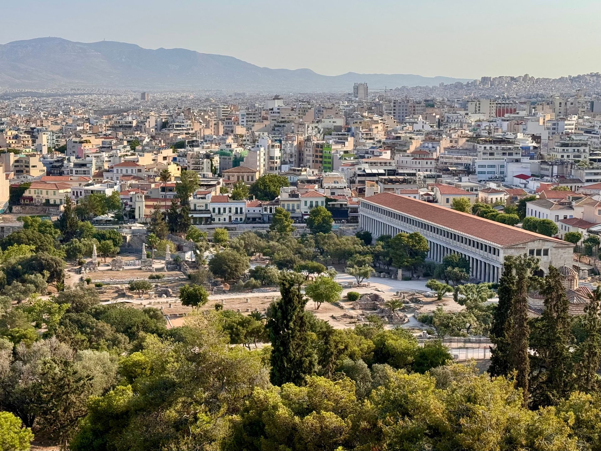 Blick über Athen und den Tempel des Hephaistos, über die Nachbildung eines früheren antiken Treffpunkts, welche heute ein Geschichtsmuseum beherbergt.