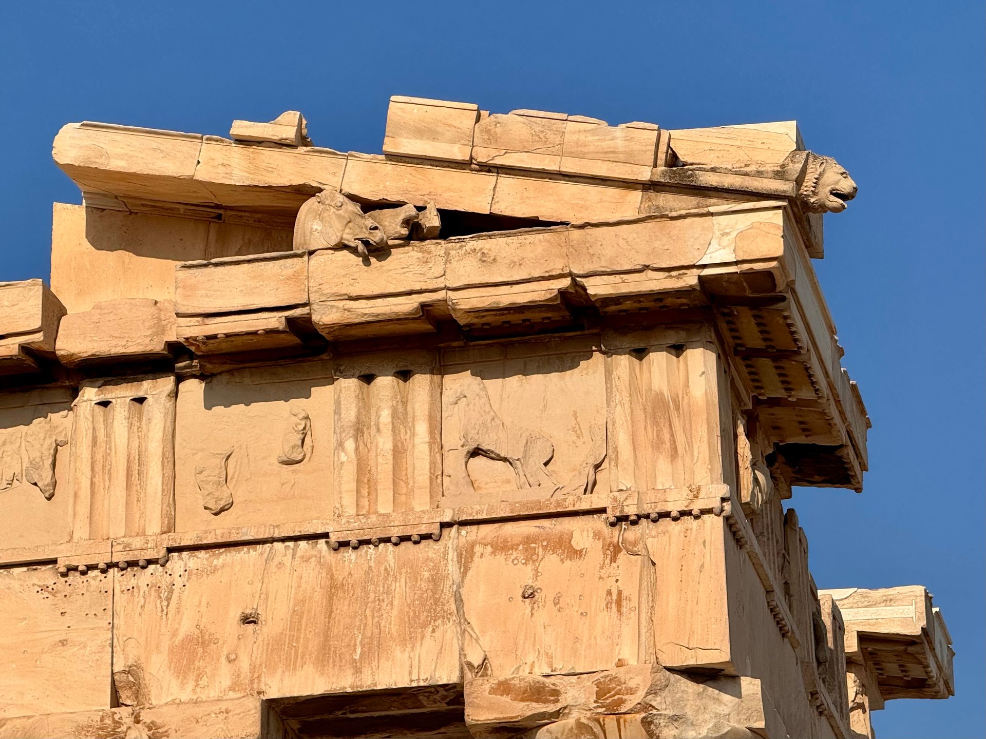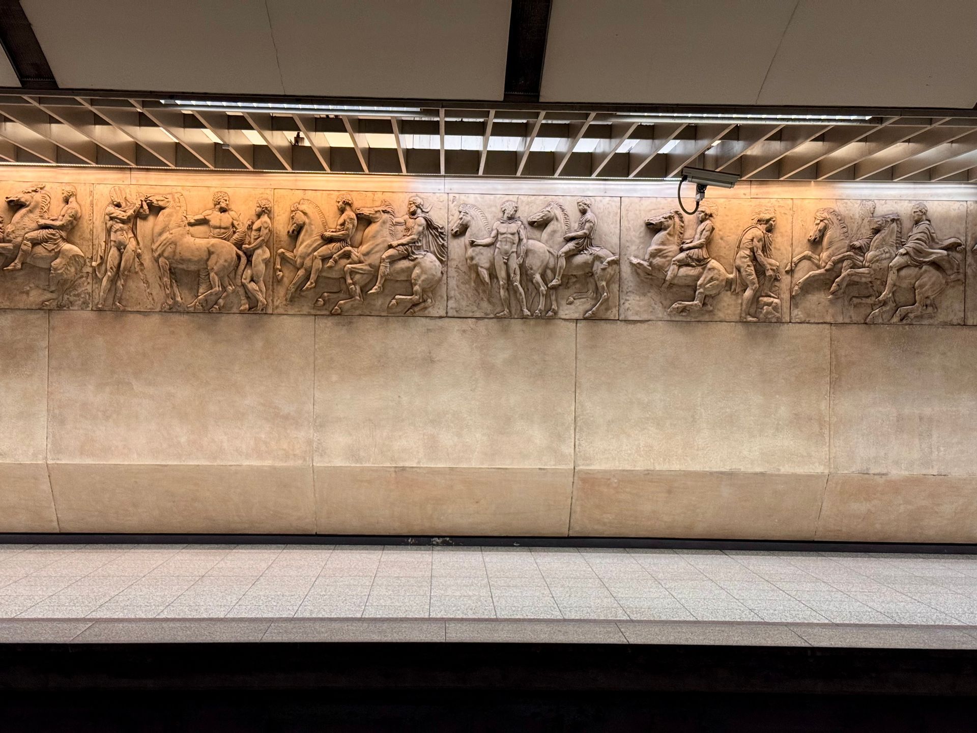 Zur Metro und dann zurück zum Zimmer und etwas Abkühlung. Die U-Bahnstationen sind mit allen möglichen Gemälden, historischen Nachbildungen künstlerisch gestaltet. Eine dieser Nachbildungen und deren Beschreibung, die dort ebenfalls an der Wand zu finden ist, ist auszugsweise die folgende: "Ein durchgehender Fries, in Flachrelief geschnitzt, vervollständigte die Dekoration des Parthenon und bildete gleichzeitig ein strukturelles Merkmal des Gebäudes. Es war 160 Meter lang und erstreckte sich über die Kolonnade der Pronaos und der Opisthodomos und den Wänden der Cella. Die Friesblöcke wurden zwischen 442 und 438 v. Chr. auf dem Gebäude platziert und wahrscheinlich in Position geschnitzt. Es wird angenommen, dass das Thema des Frieses von einem tatsächlichen Ereignis inspiriert wurde, der Prozession des Panathenaia-Festivals. Die Große Panathenaia wurde alle vier Jahre zu Ehren der Göttin Athena gefeiert und umfasste verschiedene religiöse Aktivitäten sowie Pferderennen, Musikwettbewerbe usw. Der Höhepunkt des Festes war die Prozession zur Akropolis und das Opfer eines neuen Peplos (Gewand) für die Votivstatue von Athena Polias an ihrem Geburtstag. ... Von dem Teil des Nordfries, der hier in der Reproduktion ausgestellt ist, befinden sich der zweite, dritte und vierte Block von links im Akropolismuseum. Die verbleibenden Reliefs, die von Lord Elgins Arbeitern ausgeschnitten wurden, sind jetzt in Form von Platten im British Museum ausgestellt."