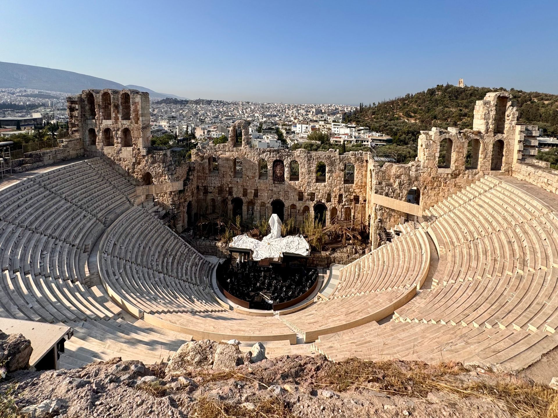 Auf dem Weg zum Ausgang passiere ich zunächst die sich hinauf kämpfenden Besucher (8 Uhr war eine echt gute Entscheidung) und anschließend das Theater Odeon des Herodes Atticus, Griechenland. Es wurde im Jahr 161 n. Chr. von Herodes Atticus zu Ehren seiner verstorbenen Frau erbaut. Es wird noch heute für Konzerte und Aufführungen genutzt, insbesondere während des Athener Festivals im Sommer. Es dürfte schon hergerichtet werden, das weiße Tuch in der Mitte soll keinen Vogel darstellen sondern ist eine Abdeckung 😂.