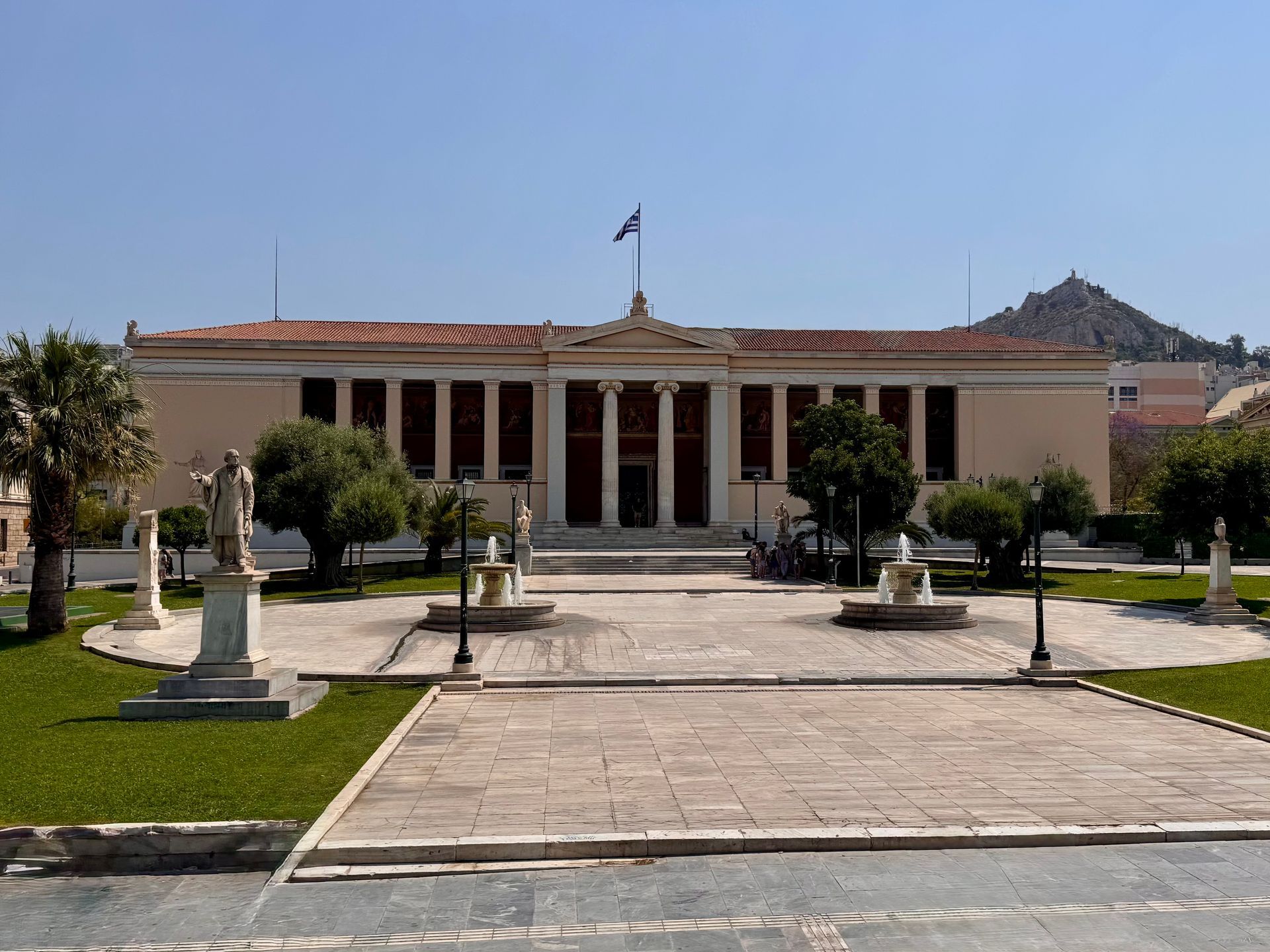 Vor dem Gelände befindet sich eine Haltestelle der Hop-on-hop-off Tour. Ich nehme den nächsten vorbeifahrenden Bus und drehe zunächst einmal eine komplette Runde. Wir passieren die Akademie von Athen. Sie ist ein bedeutendes Beispiel für den neoklassizistischen Architekturstil und wurde von Theophil Hansen entworfen. Die Statuen links und rechts auf den Säulen stellen Athene und Apollon dar. Die Akademie ist Teil der sogenannten "Athenischen Trilogie" zusammen mit der Nationalbibliothek und der Universität von Athen. Die Universität, Nationalbibliothek und Nationalmuseum passieren wir wenige Minuten später.