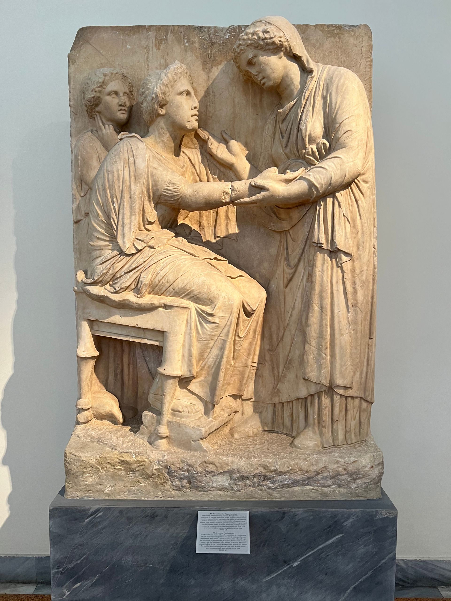 Nach einer Runde Busfahrt steige ich beim Nationalmuseum aus und erstatte diesem noch einen Besuch. Ihr könnt euch vielleicht an den Bericht vom Topkapi-Palast in Istanbul erinnern, die unglaubliche Vielfalt an Sehenswürdigkeiten und Schätzen. Ähnlich ist es auch in diesem Museum. Unfassbar viel zu sehen, zu bewundern und zu versuchen, in den Kopf zu bekommen. Es ist einfach erschlagend. So ist hier wieder nur eine kleine Auswahl an ausgestellten Gegenständen zu sehen. Eingehen möchte ich auf die goldene Maske, die sogenannte "Maske des Agamemnon", eine berühmte goldene Totenmaske aus der mykenischen Kultur (ca. 1550–1500 v. Chr.). Sie wurde von Heinrich Schliemann 1876 in Mykene, Griechenland, entdeckt. Die Maske wurde in einem königlichen Grab gefunden und soll laut Schliemann das Gesicht des legendären Königs Agamemnon darstellen, obwohl dies historisch nicht belegt ist. Sie besteht aus reinem Gold und ist ein herausragendes Beispiel für die Kunstfertigkeit der mykenischen Goldschmiede. Weiter unten unter anderem die Statuen von der griechischen Göttin Athena, die Göttin der Weisheit, des Krieges und der Strategie. Dann die antike Marmorbüste vom "Kopf des Dionysos", gefunden im Theater nahe dem Zea-Hafen in Piräus.