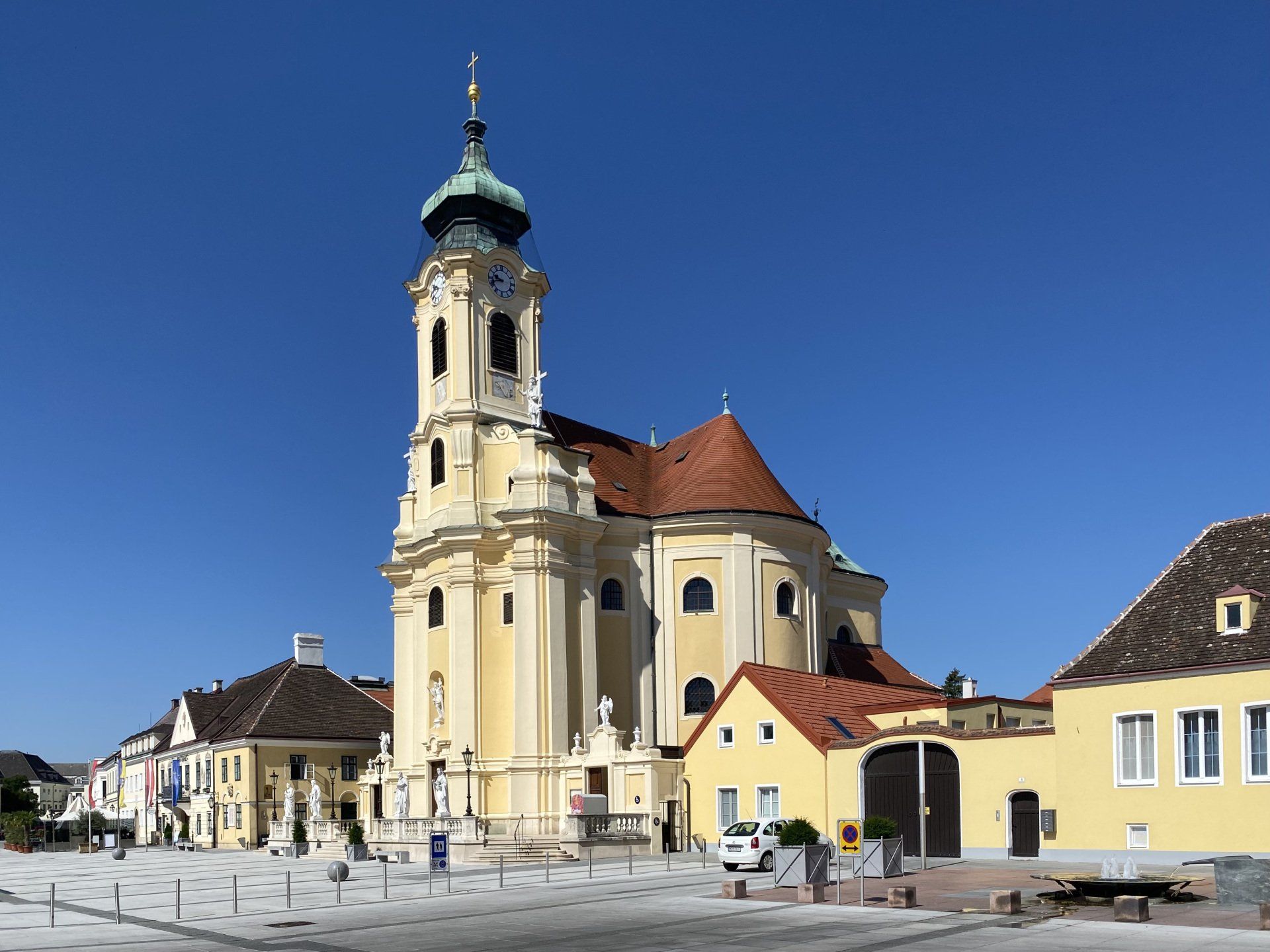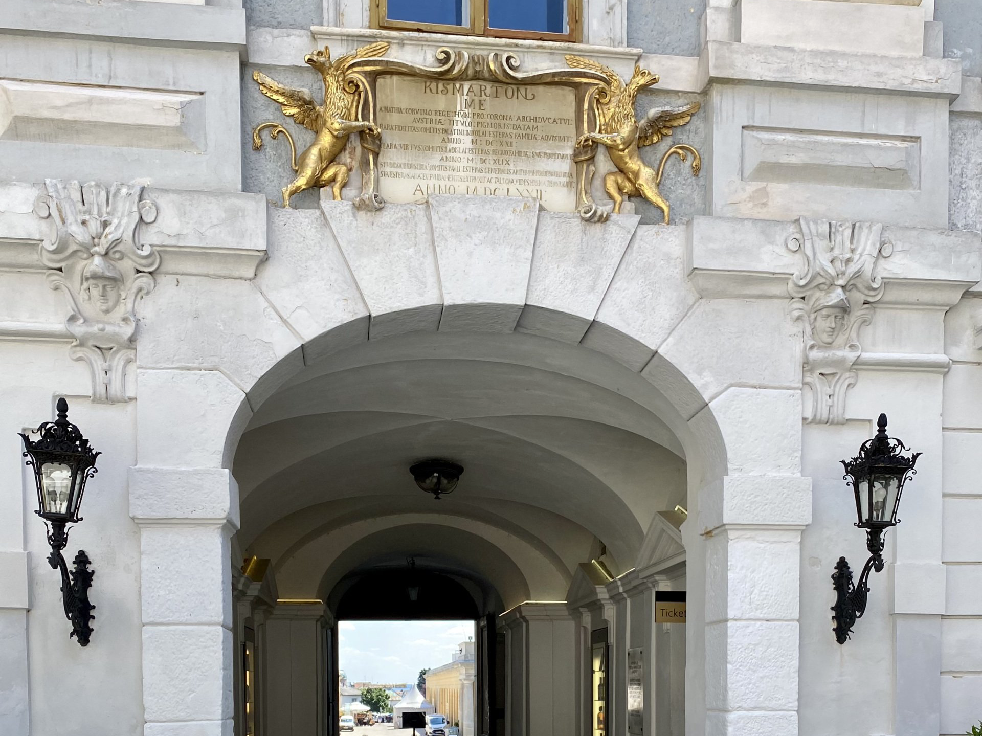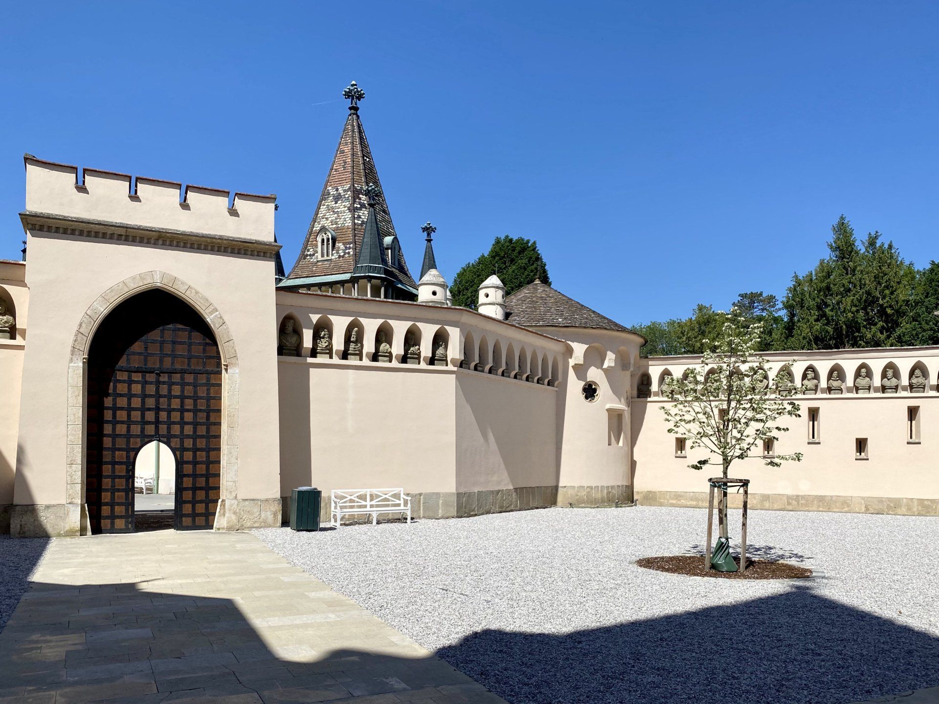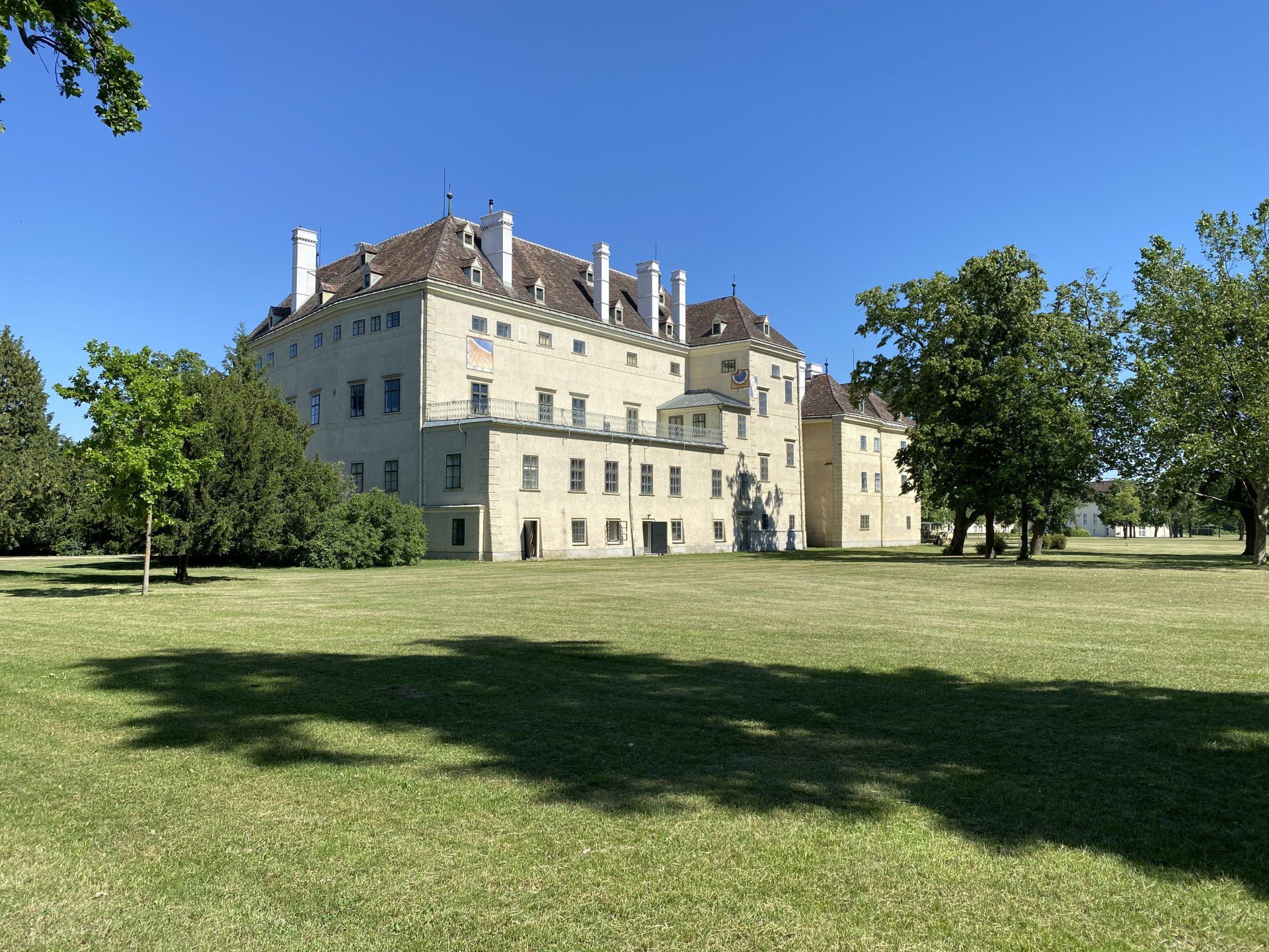 Es ist mittlerweile kurz nach 11 und ich schwinge mich wieder auf mein Rad. Nachdem ich Komoot eine Pause gegönnt habe, starte ich die App neu und möchte meine Tour fortsetzen. Irgendwie passt da etwas nicht, ich fahre in Richtung Norden, denke mir zunächst nichts, als ich aber wieder bei Biedermannsdorf ankomme, vergesse ich das Fortsetzen der Tour und gebe einfach nochmals als Ziel das Schloss Esterházy ein - und tatsächlich es geht wieder zurück, also insgesamt 8 Kilometer umsonst. Naja, denke ich mir, halb so wild, dann sind es halt am Ende nicht 90 Kilometer, sondern 98 gefahrene Kilometer. Doch der Schein trügt - die Sonne wird stärker, meinen ersten Liter habe ich schon getrunken und ich werde bald das nächste Geschäft anfahren müssen. Nachdem es mittlerweile herunterbrennt, im Laufe des Tages wird es ca. 33 Grad geben, kommt zu allem Überfluss noch heftiger Südostwind auf. Bei diesen Wetterbedingungen zwar keine Überraschung, aber doch recht unerwünscht. Er bläst mir mit ca. 25 Km/h frontal entgegen. Es bringt zwar eine leichte Abkühlung, aber die Aussicht auf die nächsten 60 Kilometer Strampelei lassen die Freude doch etwas sinken. Insgesamt entwickelt sich die Fahrt dann trotz Pedelecs - aber voll beladen - zu einem Kraftakt. Doch was soll's ... nach einigen Stops bei Supermärkten, um meinen Flüssigkeitsverlust auszugleichen - insgesamt habe ich auf der Tour heute 6 Liter Wasser getrunken - taucht in Eisenstadt plötzlich das Schloss Esterhazy auf. Es bietet eine willkommene Pause, immerhin waren es bis hierher (mit dem Umweg) 78 Kilometer. Auch dieses Schloss kann nicht von Innen besichtigt werden, sodass ich es nur von der Vorderfront bewundere und mir kurz den Innenhof anschaue.