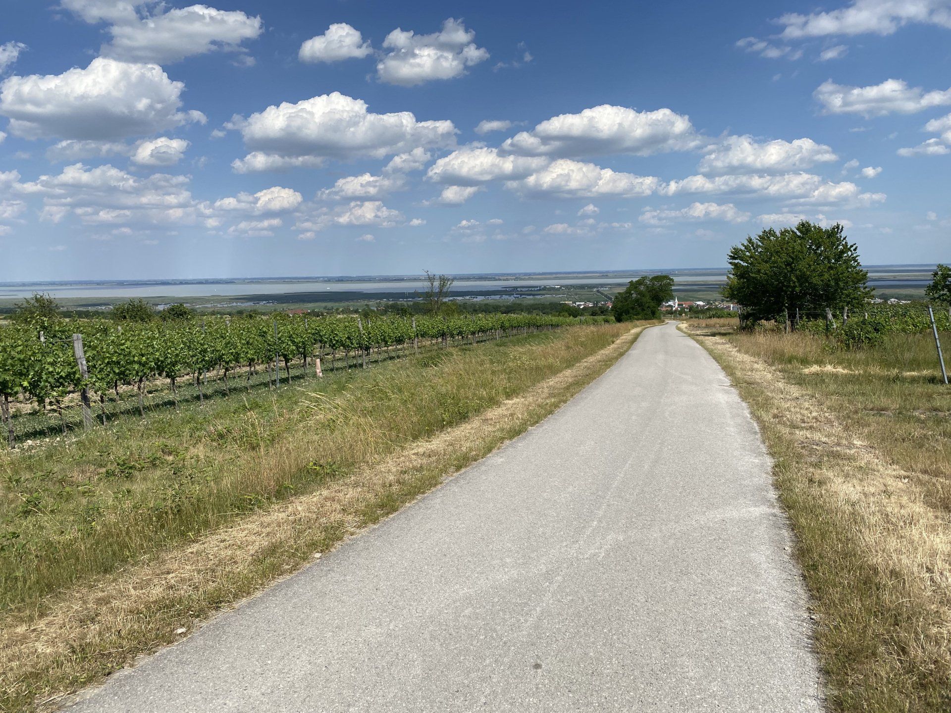 Der Rest des Tages ist recht schnell erzählt. Sturm, Sonne ohne Ende - die 30iger Sonnencreme kommt mehrmals zum Einsatz, ich möchte ja nicht verbrennen. Ein kleines Nickerchen auf einer Bank, 10 Kilometer vor Mörbisch, dann komme ich zur Österreich-Ungarischen Staatsgrenze - das wundert mich zunächst, denn durch Ungarn wollte ich eigentlich nicht nach Mörbisch. Kurz auf meine Komoot App geschaut und tatsächlich biegt der Weg vor der ungarischen Kontrolle ab und führt ein paar Kilometer entlang im Niemandsland in Richtung Mörbisch am See. Mörbisch ist von einer Anhöhe zu erreichen und tatsächlich, ein Kilometer vor meiner Unterkunft, liegt das Örtchen am Neusiedler See vor mir. Es ist ein toller Anblick, von der Anhöhe aus; ab heir geht es durch Weinberge nur noch bergab und ich erreiche mein Ziel kurz vor 16 Uhr. Meine Ankunftszeit hatte ich mit 17 - 18 Uhr bekanntgegeben, und nachdem ich eine Ferienwohnung im Ödenburger Hof gewählt habe, werde ich mich wohl gedulden müssen, da es keine Rezeption gibt. Pünktlich um 17 Uhr trifft meine Vermieterin Sandra ein, zeigt mir meine Bleibe und ich relaxe erst einmal.