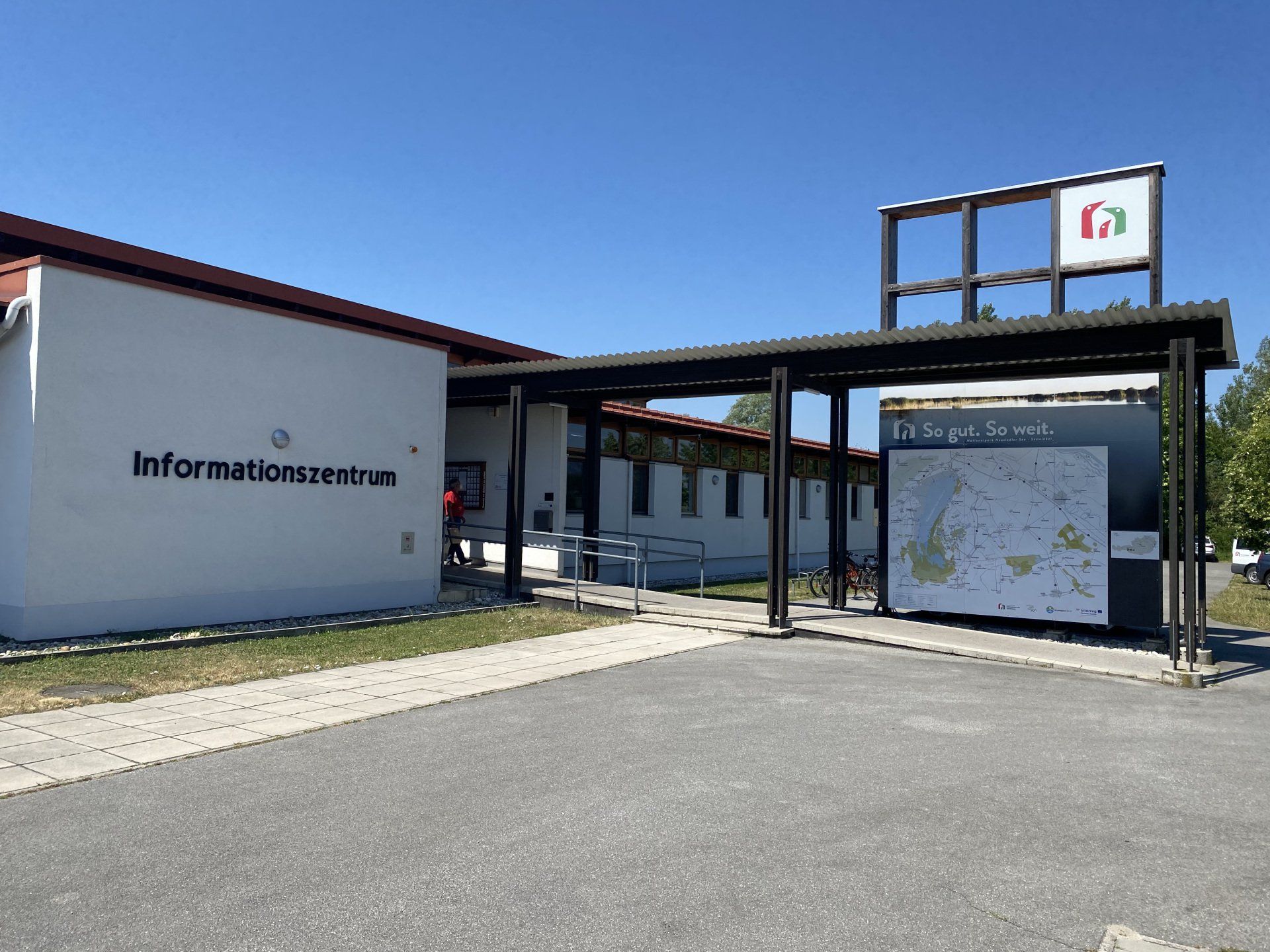 Thematisches Ziel des heutigen Tages ist das Informationszentrum des Neusiedler See Nationalparks. Das Hauptgebäude ist sehr schön gestaltet und bietet einen Haufen an Informationen. Eine dieser Infos ist, dass es auf einer Fläche von 25 km2 noch etwa 40 kleine, salzhaltige Seen/Lacken gibt. Diese sind in Europa mittlerweile sehr sehr selten geworden. An einer diesen kleinen Salzlacken werde ich später bei meiner Rückfahrt noch vorbeikommen. Die Außenanlagen laden zum Beobachten der Tierwelt ein, jedoch dürfte es auch den lieben Tierchen mittlerweile zu heiß werden, sie haben sich versteckt. Ich verweile einige Zeit in einer Art Hochstand - der Innenraum liegt im Schatten und ist super durchlüftet; das hat sogar etwas von einer erfrischenden, kühlenden Brise. Obwohl ich dort eine zeitlang verbringe, lässt sich kein Vogel blicken.
