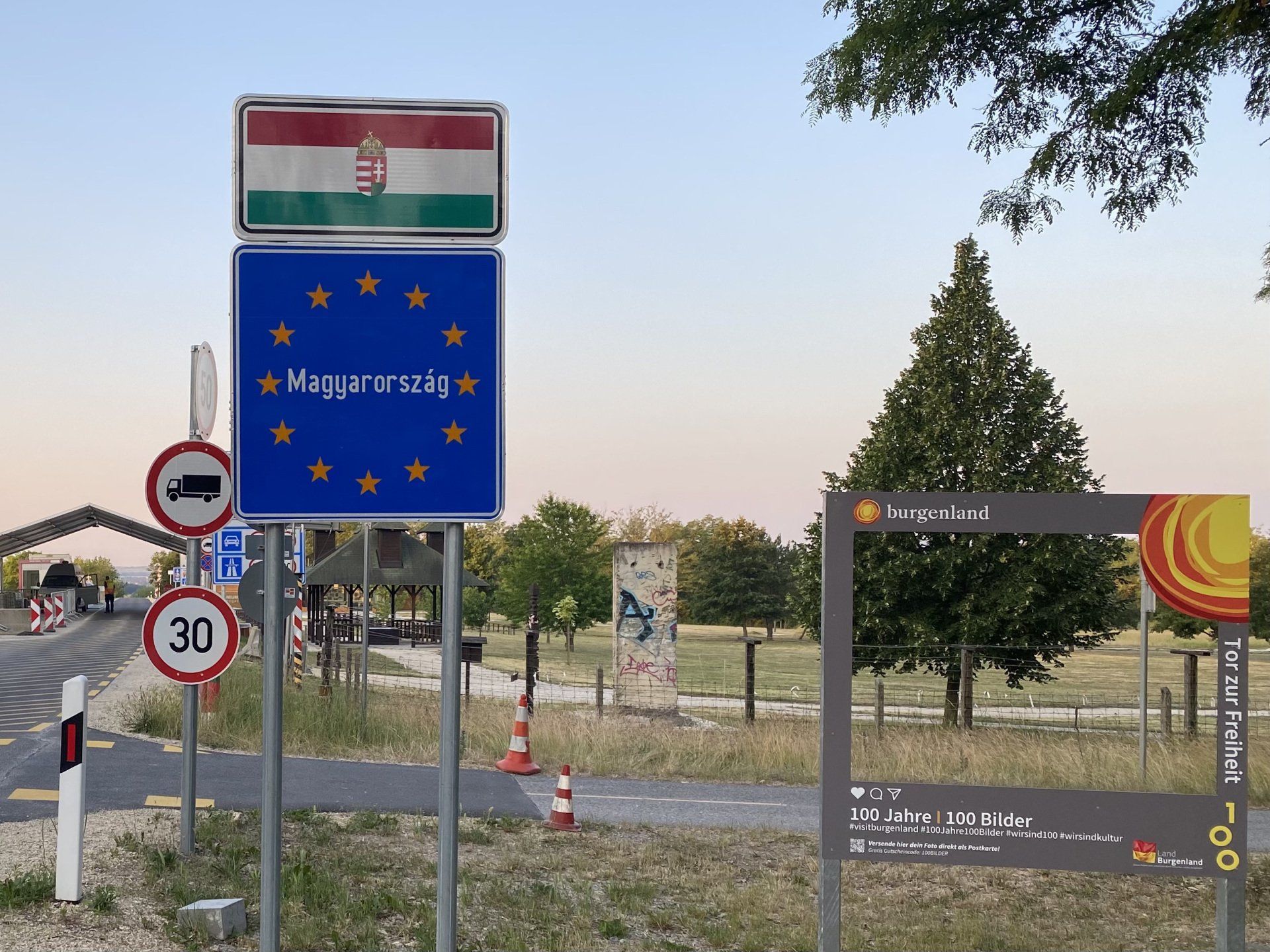 Das erste Ziel ist der gestern angekündigte Grund für die Mitnahme meiner Spiegelreflex Kamera: die Bienenfresser - sie heißen wirklich so, aber dazu dann gleich. Der Weg dorthin führt mich zunächst wieder zurück durchs Niemandsland Österreich - Ungarn und vorbei an den Grenzübergängen. Dann folgt ein wundervoller Radweg durch Wald und über Wiesen und Felder, bis der Weg geradeaus von einem großen österreichischen Bundesheer Kraftfahrzeug blockiert wird. Der Soldat hinter dem Steuer ist wach, sein Beifahrer schläft; sie haben sich die Nacht wohl aufgeteilt. Ich muss ohnehin direkt vor dem Fahrzeug links abbiegen und nach einem kurzen "Guten Morgen" schlage ich den Haken ums Eck. Warum diese Kontrolle hier aufgebaut ist, weiß ich nicht, ich kann's noch nicht mal vermuten.