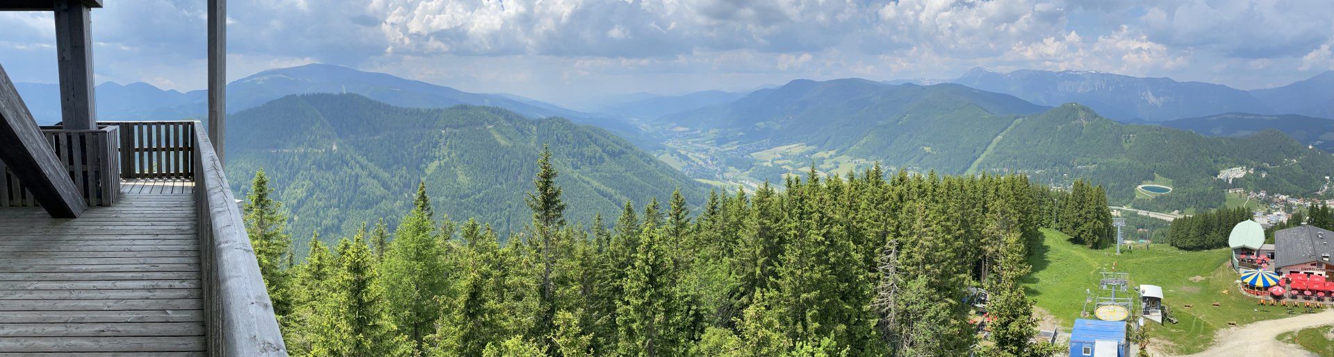 Jetzt nur noch den Berg hinauf und ich bin da. Das Pedelec macht seine Sache bisher sehr gut - um ehrlich zu sein, vollbeladen würde ich das mit einem "normalen" Fahrrad nicht hinbekommen - aber so ist es fast ein Genuss. Na ja, ganz so ist es auch nicht, ich muss immerhin doch ordentlich strampeln und die "Alte Semmering Passstraße" hat es ordentlich in sich. Steigungen bis 17% - nicht ohne. Mittlerweile um kurz vor 11 knallt auch die Sonne herunter und ich lege nochmals ein kleines Trinkpäuschen ein. Ab hier sind es nur noch 3 Kilometer ... 2 Kilometer ... 1 Kilometer ... und 500 Meter vor dem Ziel dreht sich der Motor ab. Er lässt sich nicht mehr reaktivieren. Irgendwie habe ich das Gefühl, ich habe ihn bei der aufkommenden Hitze zu sehr strapaziert. Entweder den Motor oder den Akku oder beides. Es ist jetzt nicht mehr sonderlich steil und ich strample mir bei hängender Zunge die Lunge heraus - tja, wenn das vorher passiert wäre ... ich hoffe nur, dass ansonsten alles okay ist und die Elektronik nicht spinnt, der Akku nicht hinüber ist oder eventuell sogar der Motor defekt. Aber das werde ich später sehen. Vor meiner Unterkunft, dem Hotel Belvedere auf der Semmering Passhöhe, lasse ich mich zunächst mal ausdampfen, bevor ich mich anmelde und mein Zimmer beziehen kann. Es ist ja doch noch recht früh und ich hätte Verständnis gehabt, wenn das Zimmer noch nicht bezugsfertig gewesen wäre. So aber schnell unter die Dusche, ein kurzes Ausrasten auf dem Bett - vom Balkon kann ich den Zau[ber:]g sehen ... da gibt es doch einen Ski Weltcup Slalomhang - somit beschließe ich, mich ein wenig später aufzumachen und mit der Gondel auf den Berg zu fahren und dort oben, beim Liechtensteinhaus mein verspätetes Mittagessen einzunehmen. Oberhalb der Bergstation steht die "Dr. Erwin Pröll Milleniumswarte". Eine prachtvolle Holzkonstruktion, die dem ehemaligen Landeshauptmann von Niederösterreich gewidmet ist. Von hier oben hat man einen traumhaften Ausblick und ich kann meine morgige Tour direkt nachzeichnen.