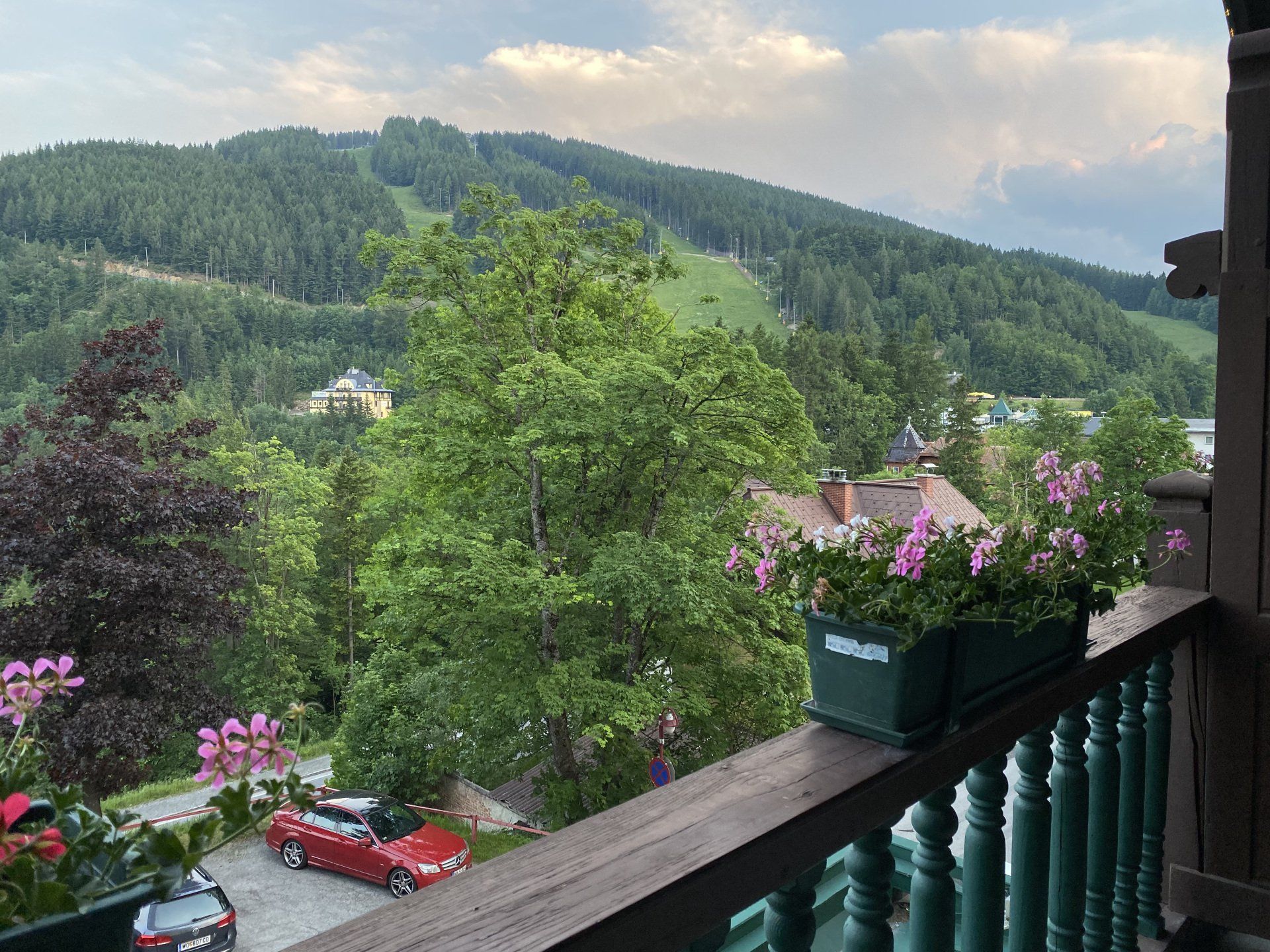 ... und jetzt ein Nachtrag, der nach dem Schreiben des Tages entstanden ist und den ich euch nicht vorenthalten möchte. Zwei Bilder, die die Dämmerung beim Hotel und den Ausblick von meinem Balkon auf den Weltcup Hang zeigen ... es war ein durchaus gelungener Tag!