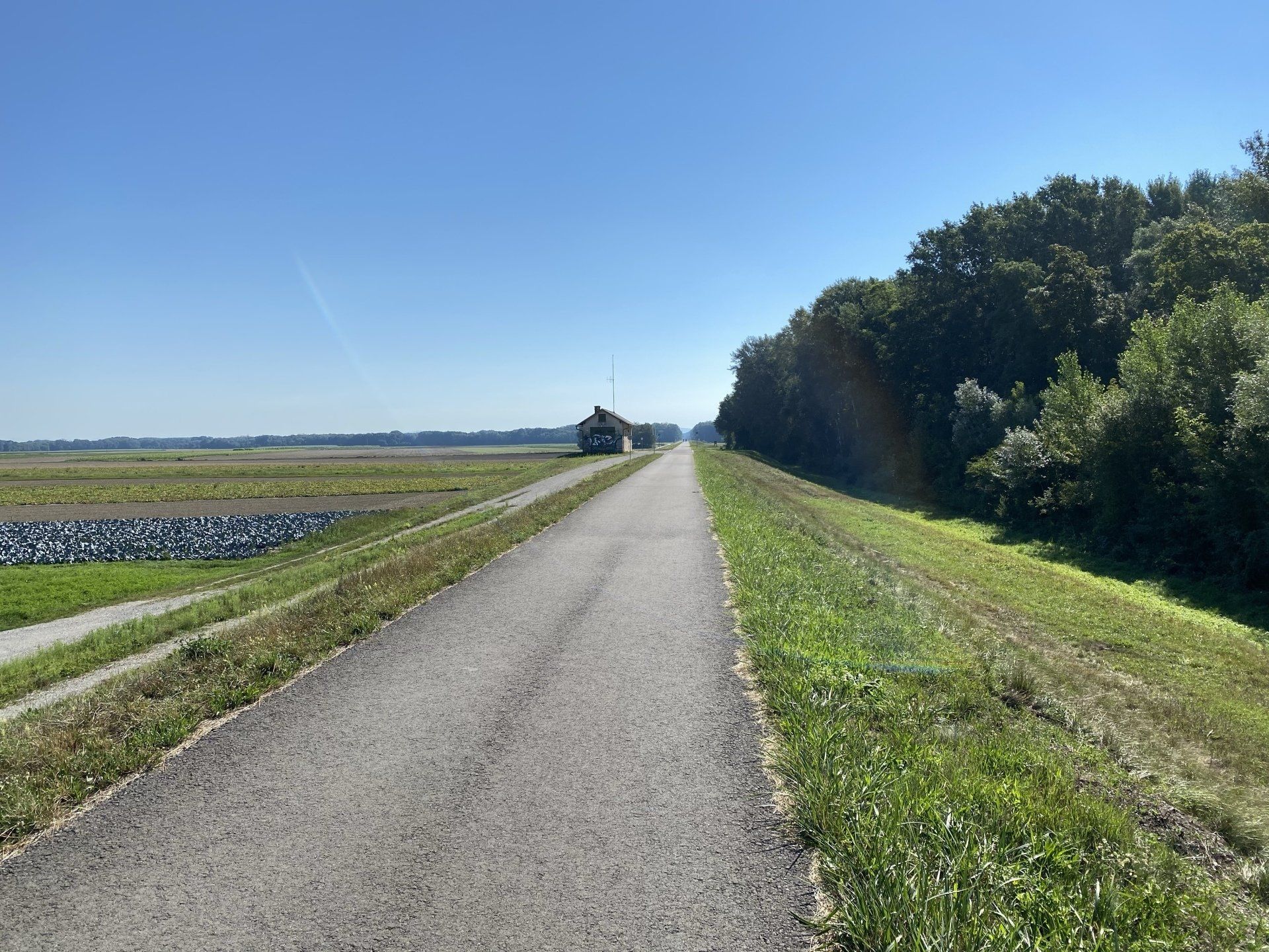Es folgen endlose Kilometer dieses europäischen Radwegs. Auf diesem Abschnitt ist er nicht besonders abwechslungsreich ... auf dem Hochwasserdamm entlang der Donauauen geht es wie am Lineal gezogen in Richtung Bratislava ... bis ... ja, bis der Radweg plötzlich gesperrt ist. Ein Zaun verhindert die Weiterfahrt und es ist eine Umleitung angezeigt. Nun gut, es wird wohl nicht so arg werden. Die neue Route führt über Eckartsau, über Loimersdorf und durch Stophenreuth (ein geschichtsträchtiger Ort, da im Dezember 1984 bei Stophenreuth die Besetzung der Hainburger Au erfolgte, was dann wiederum zur Gründung des Nationalpark Donau-Auen führte).