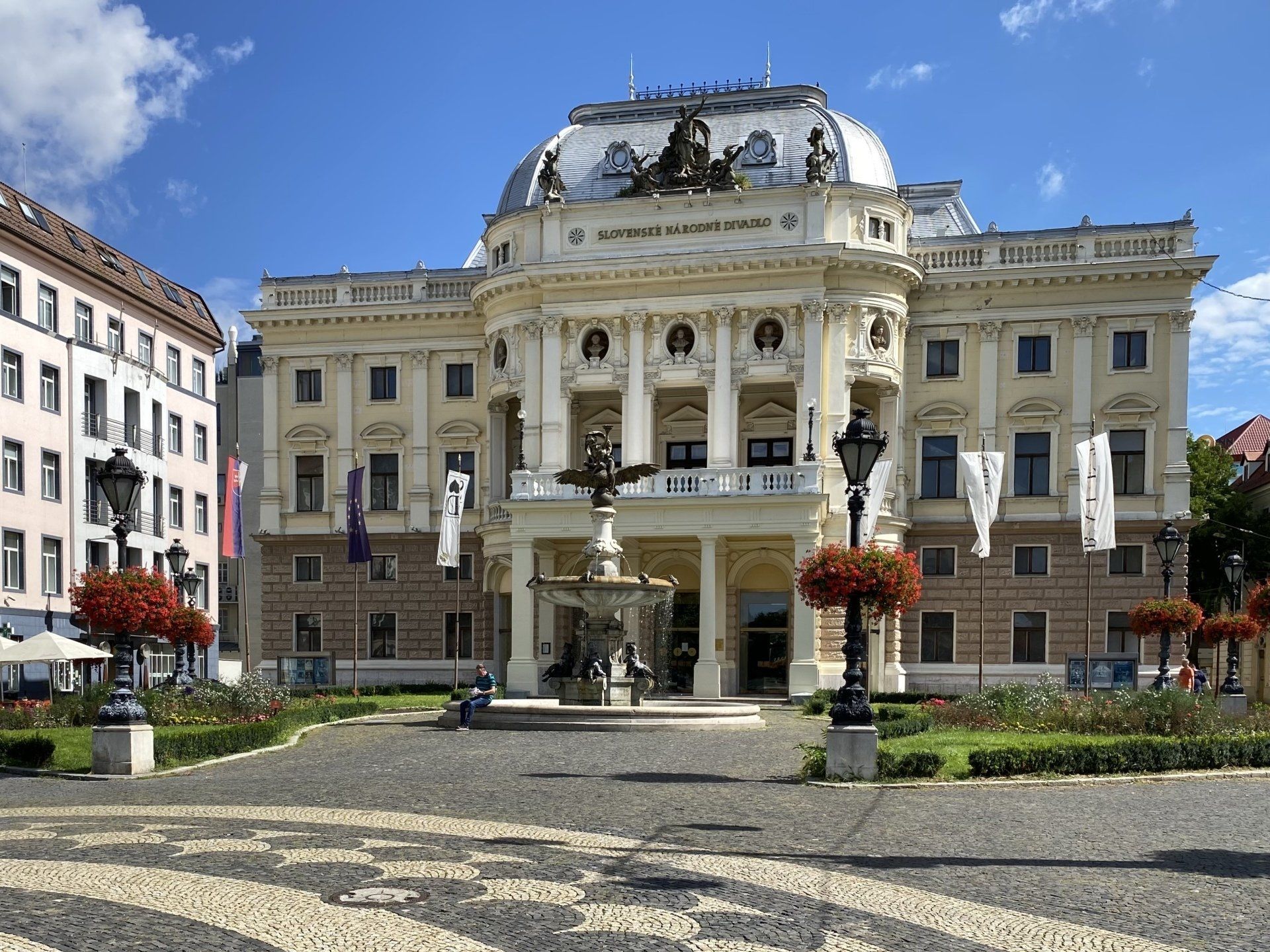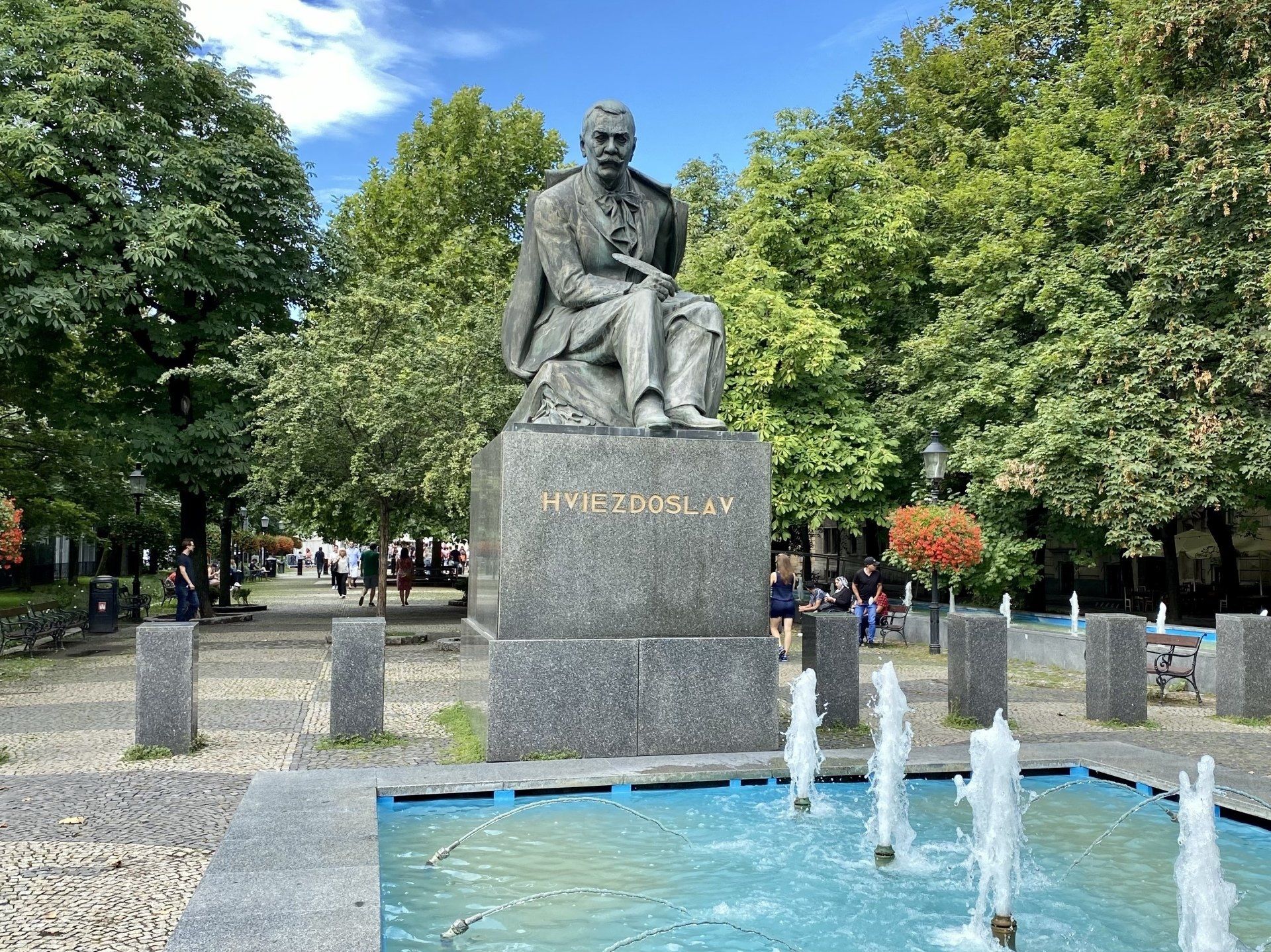 Dann an der Oper vorbei und die Philharmonie gekreuzt und ich mache eine kleine Pause in der Fußgängerzone, die die Statue des berühmtesten Dichters der Slowakei zeigt - Pavol Országh Hviezdoslav. "... Hviezdoslav war ein (anfangs von Romantikern beeinflusster) Realist, der die slowakische Literatur um neue Formen und neu geprägte slowakische Wörter bereicherte. Er schrieb lyrische und epische Gedichte, behandelte in Dramen und Verserzählungen biblische Stoffe und Themen aus dem Leben des slowakischen Volkes, und übersetzte auch die Werke von prominenten deutschen, englischen, russischen, französischen, ungarischen und polnischen Dichtern (Johann Wolfgang von Goethe, William Shakespeare, Alexander Sergejewitsch Puschkin etc.) in die slowakische Sprache. Als sein Hauptwerk gilt das epische Versepos Hájnikova žena (1886). Hviezdoslav war in slowakischen und tschechischen Kreisen schon zu Lebzeiten sehr bekannt. Sein Werk wurde noch nicht ins Deutsche übersetzt, was aber auch aufgrund seiner zahlreichen Neubildungen und Wortspiele eine große linguistische Herausforderung sein dürfte. ..." https://de.wikipedia.org/wiki/Pavol_Országh_Hviezdoslav, Wikipedia, 23.08.2020