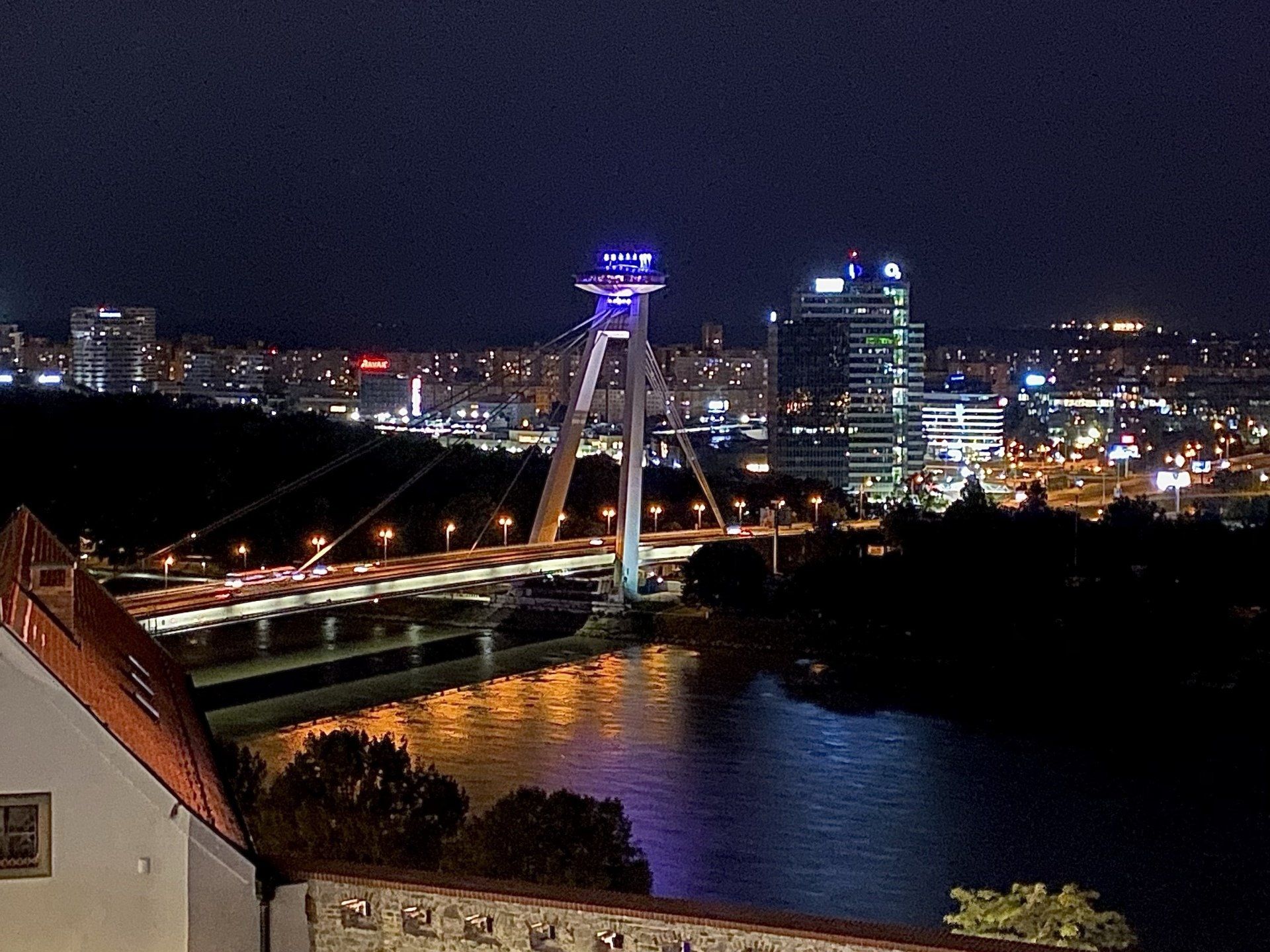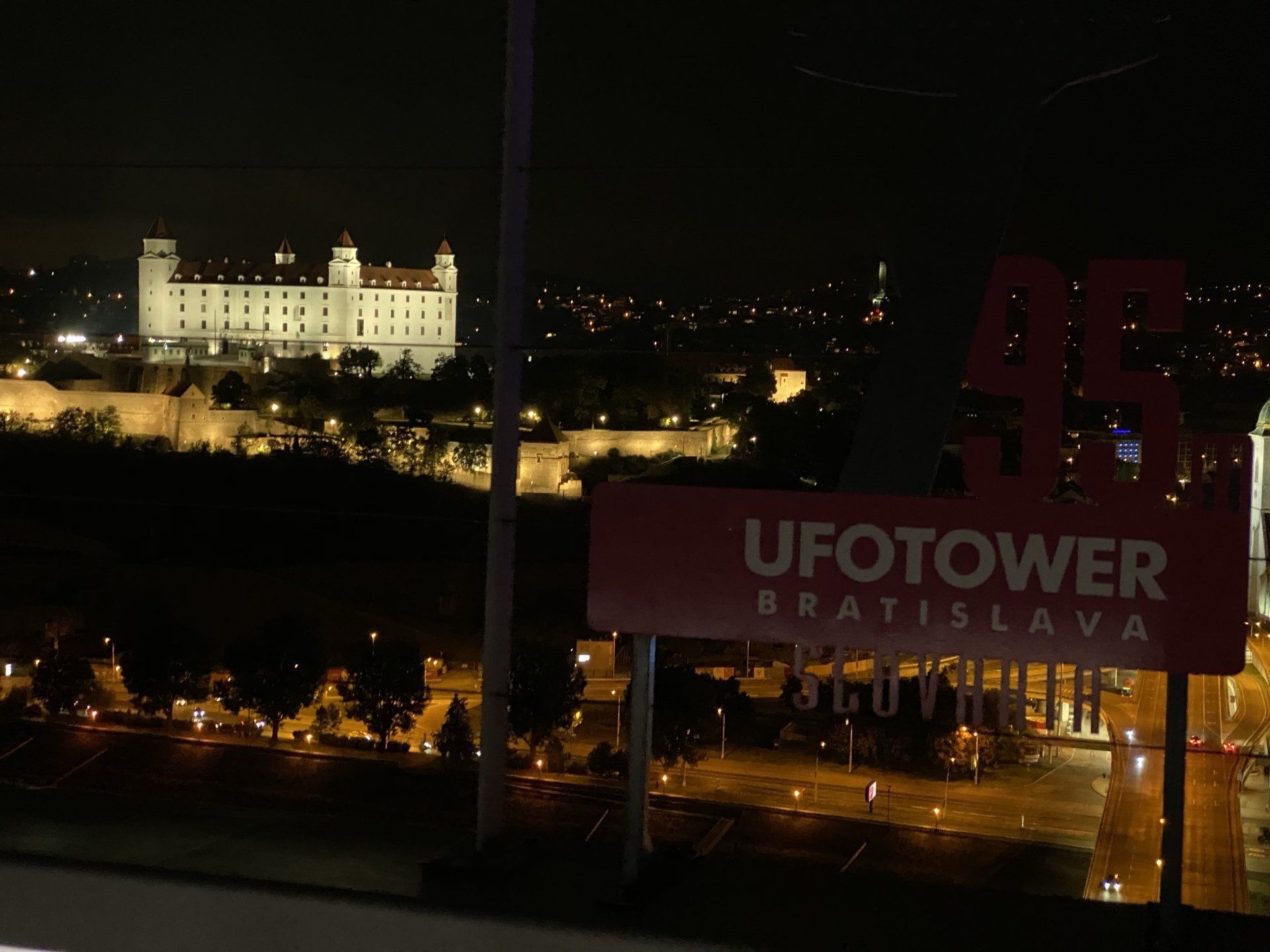 Von hier oben hat man einen tollen Ausblick auf unser nächstes Ziel - den UFO Tower. Dieses Restaurant ist um ein paar Meter höher als die Burg und befindet sich über einer Brücke hoch über der Donau. Die Tour beinhaltet neben der "klassischen" Stadtführung auch die Besichtigung des Turms mit einem Gratisgetränk im Restaurant. Die Innenstadt von Bratislava ist ja nun nicht sehr groß, sodass wir nach wenigen Metern den UFO Tower erreichen. Alena berichtet, dass die Stadtfläche von Bratislava ca. 320 Quadratkilometer umfasst und etwa 450.000 Menschen hier leben. Inoffiziellen Schätzungen zufolge sollen es ca. 600.000 sein. Ein Aufzug bringt uns zum Restaurant und über eine Treppe erreichen wir die Aussichtsplattform auf der Sturm herrscht. Es ist tatsächlich schwer zu fotografieren, da ich zu jeder Zeit damit rechnen muss, dass mir der Wind das Handy aus den Händen reißt. Trotzdem sind ein paar Bildchen zustande gekommen, die die wunderbare Aussicht von hier oben zeigen.