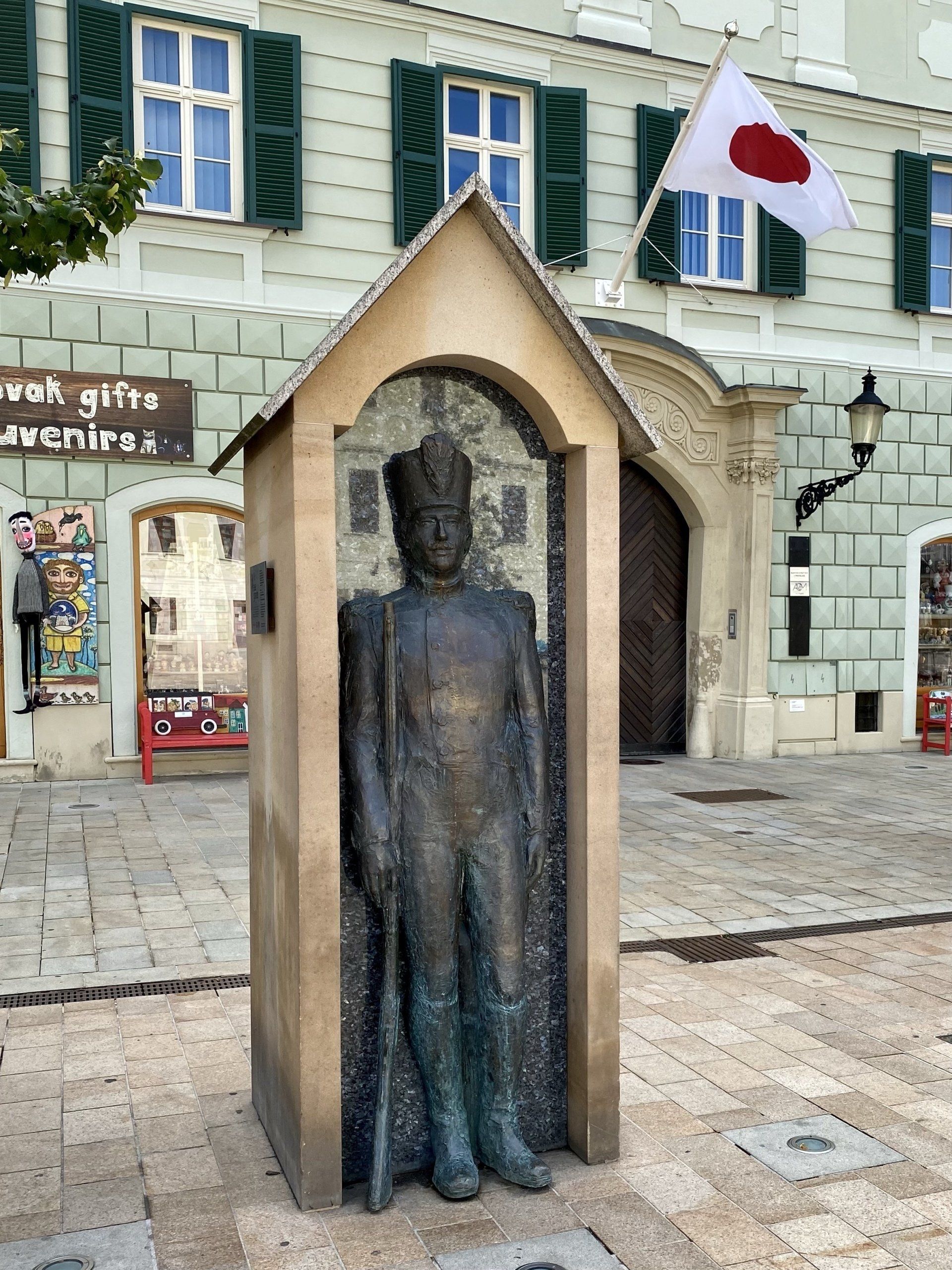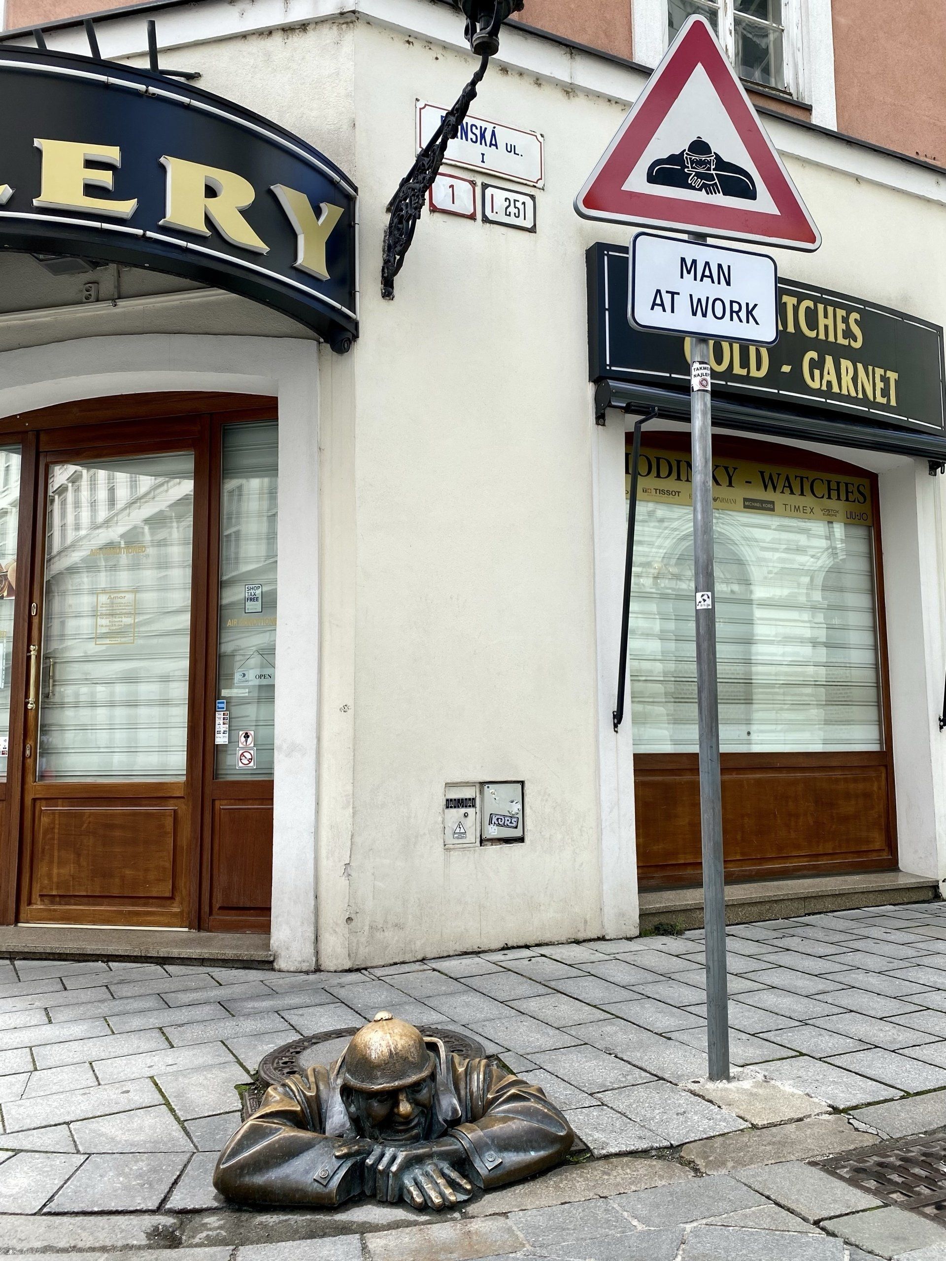 Nun geht es wieder hinunter in die historische Altstadt und es folgt der versprochene, in Bildern wiedergegebene Rundgang. Ein Hinweisschild zeigt den Weg in die Altstadt mit kleinen Gässchen und es scheint, als ob Bratislava um kurz nach 10 Uhr noch nicht erwacht ist. Okay, es ist Sonntag, die meisten Geschäfte und Kaffeehäuser öffnen erst um 10 Uhr und ich bin ja der notorische Frühaufsteher; das Stadtbild wird sich dann am Nachmittag doch noch deutlich wandeln, jetzt aber ist nichts los. Ich passiere wieder das alte Rathaus, die gestern angesprochenen Statuen, eine davon ist durch das "Straßen-Verkehrsschild" selbsterklärend - übrigens ganz toll gemacht, wenn sie nicht des öfteren schon entwendet oder beschädigt wurde (hat Alena gestern Abend erzählt). Die zwei anderen Statuen befinden sich zum einen vor der französischen Botschaft, diese zeigt einen französischen Soldaten über der Bank lümmelnd (auch dieser wurde schon in zwei Teile zerstört), die andere stellt einen Wachposten vor der japanischen Botschaft dar. Statuen gehören in Bratislava eindeutig zum Stadtbild und es sind an vielen Ecken solche zu sehen; so auch Hans Christian Andersen am Beginn der Fußgängerzone.
