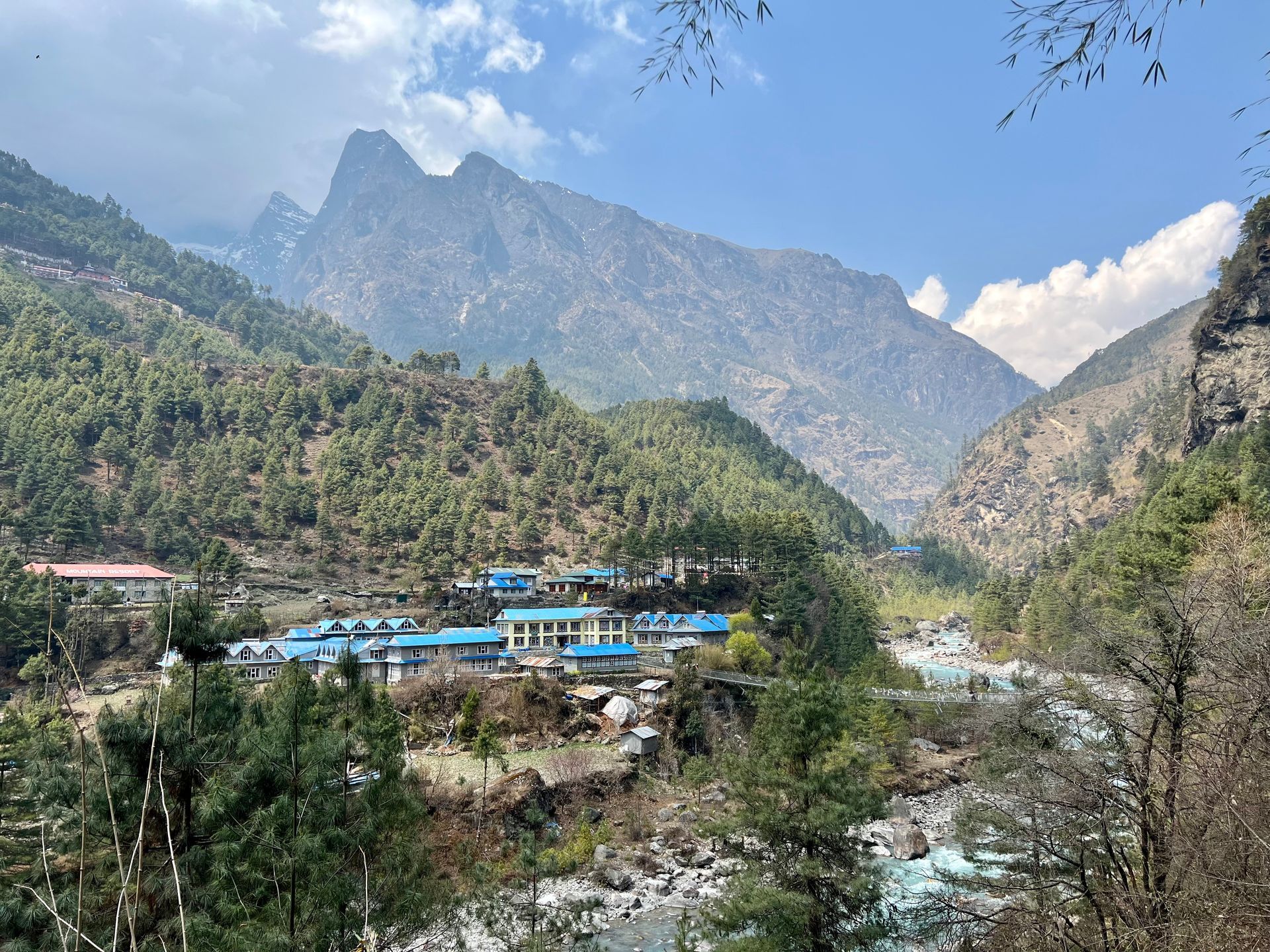 Die Morgenstimmung mit der aufgehenden Sonne und den hinter den Bergen vorkommenden Sonnenstrahlen ist atemberaubend; es könnte wohl ein Kalenderblatt werden. Um 7:45 sind wir „marschbereit“, noch ein Foto der fast vollständigen Mannschaft (mich hat der Fotograf abgeschnitten 😏) und wir brechen auf. Zunächst mal wieder hoch und runter, auch registrieren an einem Checkpoint ist wieder einmal angesagt. Ein Blick zurück ins Tal und wir trekken gemütlich unseres Wegs. Heute habe ich das Gefühl, dass die halbe Welt unterwegs ist, es sind sehr sehr viele Trekker anzufinden, derzeit noch bergauf - im Laufe des Tages kommen uns dann immer mehr Wanderer auch bergab entgegen. Wir passieren wundervoll blühende Bäume und machen schon kurz vor 11 Uhr Rast an einem Restaurant, welches ein wenig abseits der überbevölkerten Trekkingroute liegt. Immer in Blickrichtung liegen die Anfänge der höchsten Berge der Welt - wir nähern uns langsam.