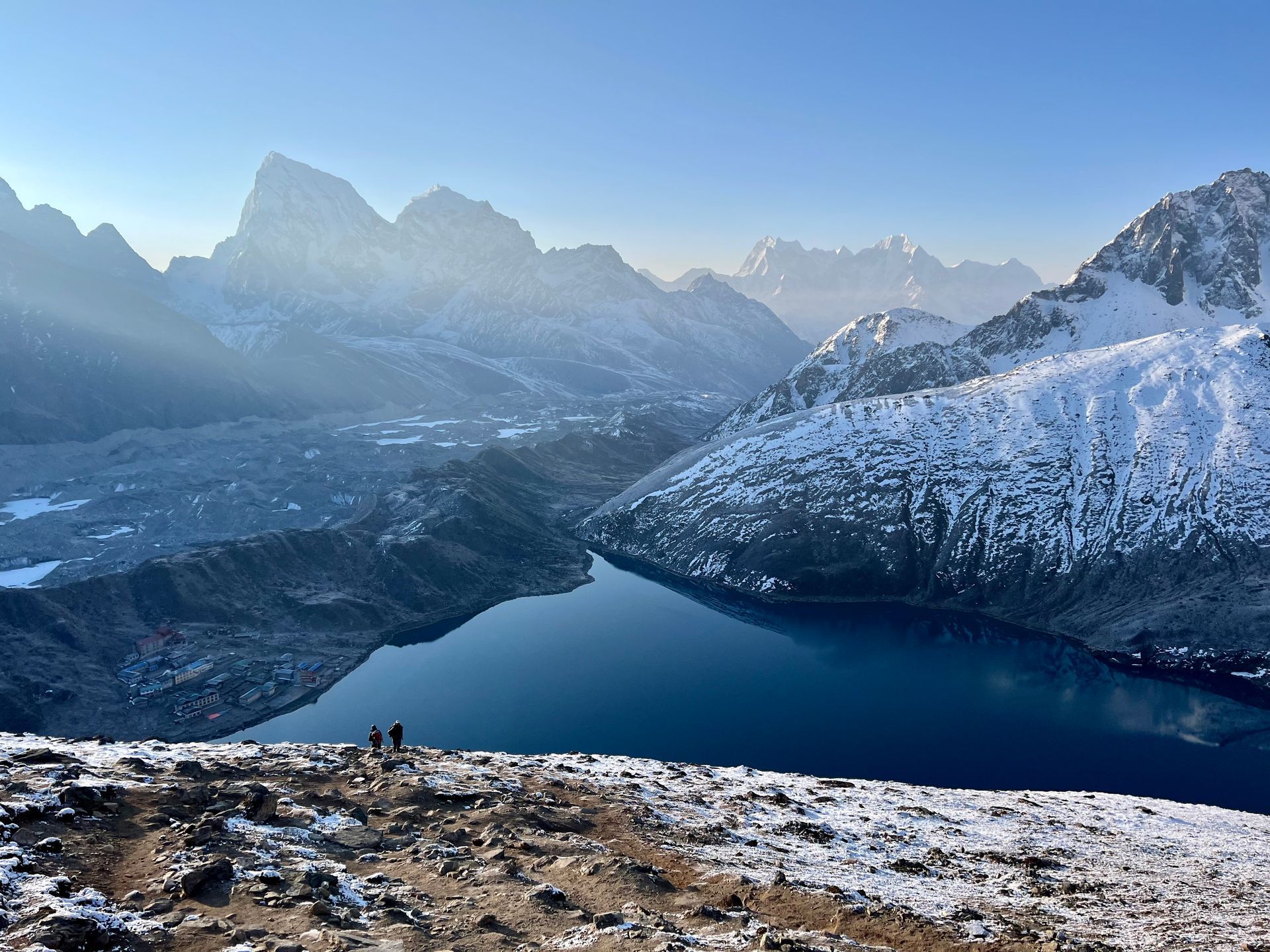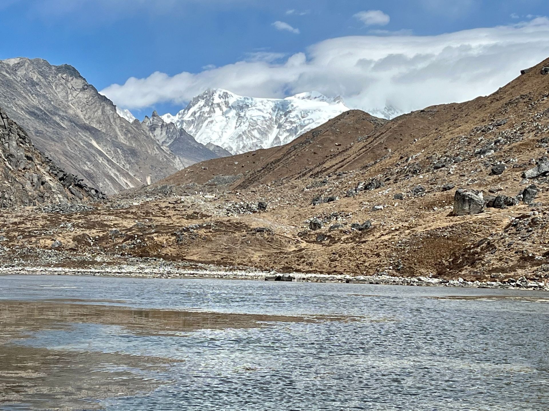 Tja, und jetzt haben wir den dritten See fast erreicht, nur noch ums Eck und wir sind da. Seit einiger Zeit haben wir auch den Gokyo Ri mit seinem Aufstiegsweg in unserem Blickfeld, beeindruckend – wir werden es morgen sehen.