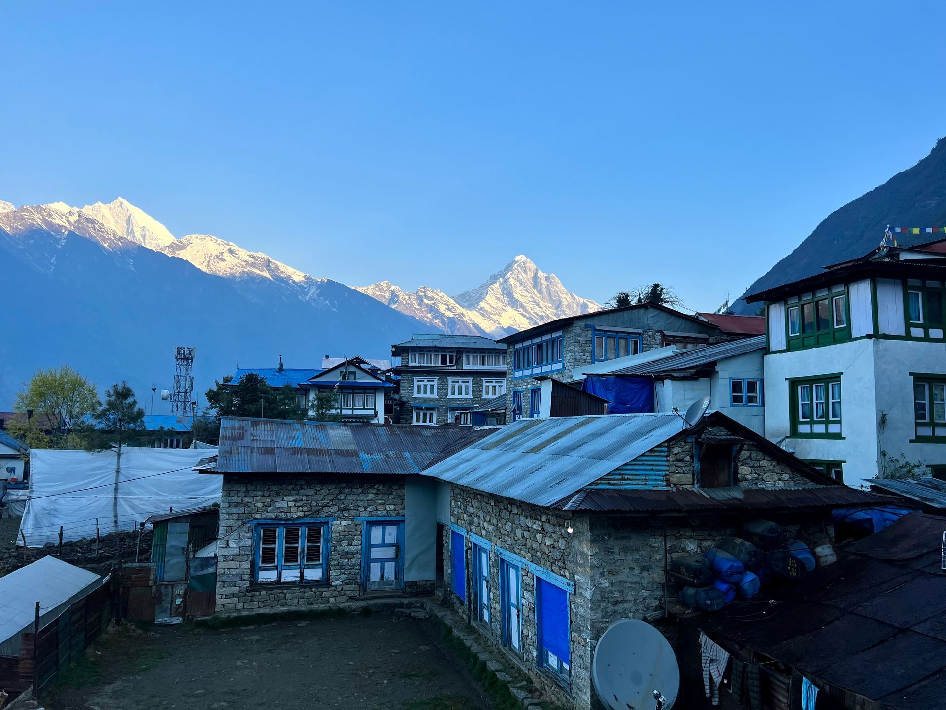 In der Unterkunft angekommen gibt es zunächst einmal einen Tee, uns werden die Zimmer zugewiesen und ich gehe noch ein wenig hinaus, um zum einen mit meinem Bruder Thomas zu Facetimen und zum anderen diese tolle, beginnende Abendstimmung unten zu fotografieren mit dem Kangtega (6.783m) (Wikipedia, 6.5.2023) im Hintergrund. Alleine von hier aus ist die Aussicht schon sensationell und in Namche Bazaar auf 3.400 Metern zu übernachten und dann morgen weiterzuziehen, ist ein ganz ganz tolles Gefühl ….