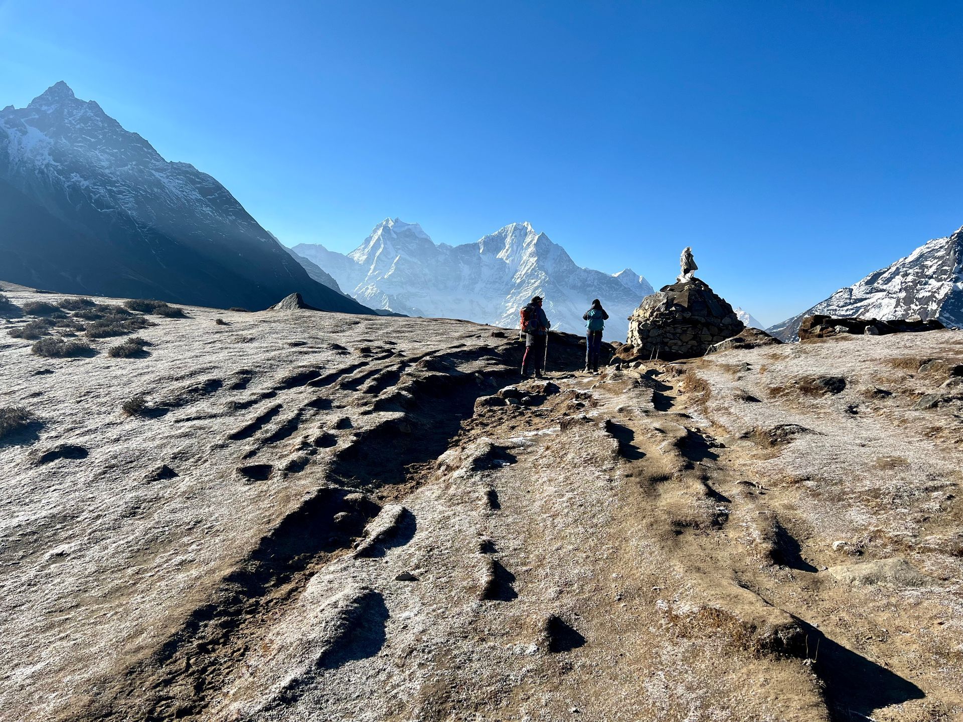 Eine ganz große Besonderheit gibt es noch zu berichten. Auf 4.300 Metern legen wir auf einer „Wiese“, ein wenig windgeschützt, eine Mittagspause ein - und jetzt kommt es …. wir bekommen zum Mittagessen Schwarzen Tee, gebratene Kartoffeln und als Nachtisch einen Apfel serviert - und mit serviert ist tatsächlich auch Servieren gemeint. Mingma und Revin haben unser Mittagessen von Pangpoche hier in Wärmebehältern hinaufgetragen, Mittagessen auf 4.300 Metern mit Blick auf die Ama Dablam ist sensationell - doch, wenn ich ehrlich bin, ist mir das doch ein wenig peinlich - TAUSEND DANK euch beiden!!!