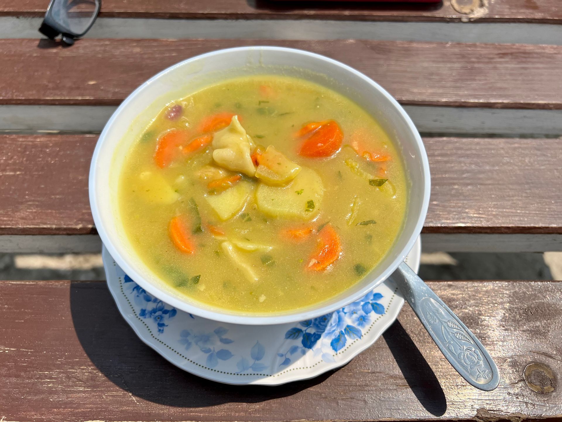 Ein Mittagessen bei bestem Wetter vor dieser Bergkulisse - Herz, was willst du mehr! Wir dürfen auch einen kurzen Blick in die Küche machen und stellen fest, dass die Nudelsuppe frisch zubereitet wurde - das scheint übrigens für alle Speisen zu gelten, zumindest habe ich es bisher noch nicht anders erlebt.