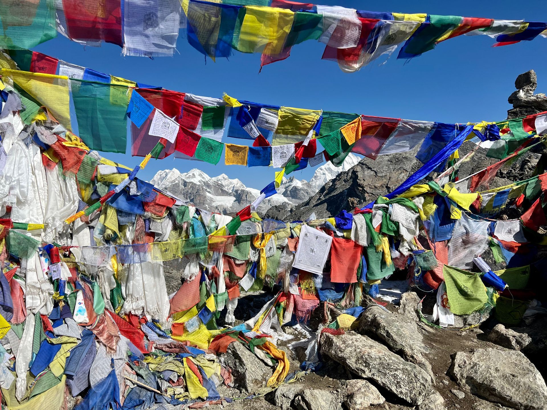 Aufbruch, 300 Höhenmeter noch, Schnauferei (aber wie gesagt, das steht uns zu) und wir haben das Ama Dablam Basecmp erreicht. Die Apple Watch zeigt als Höhenangabe 4.596 Meter. Im windgeschützten Bereich ist es echt warm. Wir genießen die sensationelle Aussicht, wandern durchs Camp und lassen es uns echt gut gehen.