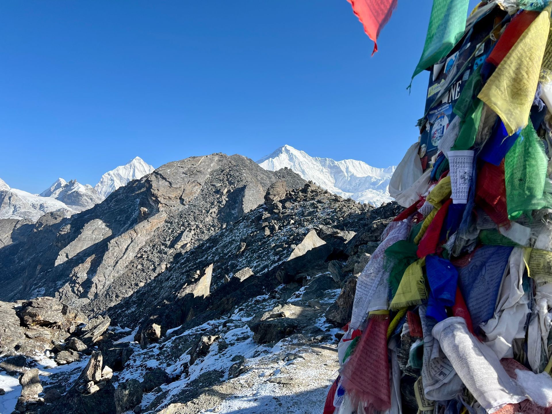 Wenn ich ganz ehrlich bin, ist es doch anstrengend, in dieser dünnen Luft aufzusteigen. Auch wenn wir sehr langsamen Schrittes unterwegs sind, werde ich doch zeitweilig zu kleineren Pausen gezwungen. Wie auch immer, nach ziemlich genau zwei Stunden erreichen wir den Gipfel des Gokyo Ri, was im Grunde bei dieser Höhenlage keine schlechte Zeit ist; es sind immerhin nahezu 300 Höhenmeter pro Stunde.