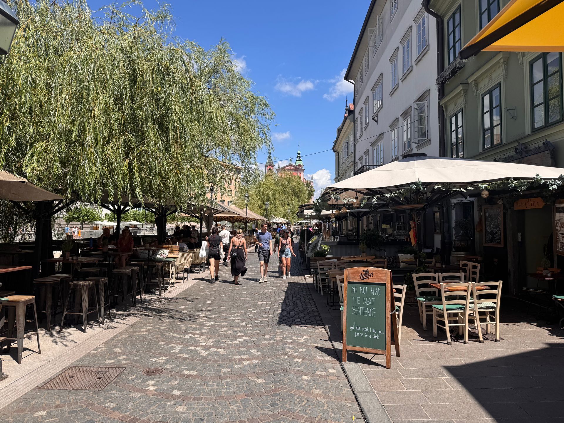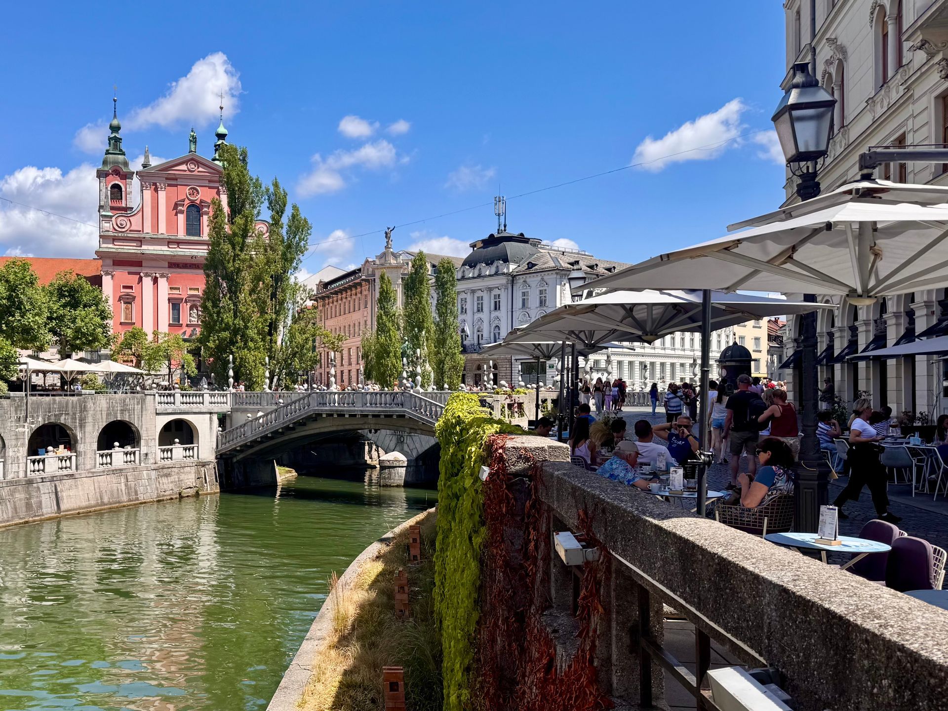 Nach ziemlich genau der Hälfte der Strecke werde ich Ljubljana, die Hauptstadt von Slowenien passieren. Dieser Stadt werde ich einen Kurzbesuch abstatten, ich mag sie einfach, besonders die Tromostovje, die drei miteinander verbundenen Brücken über die Ljubljanica, die Konstruktion sieht man aus der Fotografensicht nicht, meine Drohne auspacken wollte ich bei den vielen Menschen nicht, das wäre unpassend gewesen. "Tromostovje (deutsch Drei Brücken) ist ein Komplex aus drei Brücken in Ljubljana, der Hauptstadt Sloweniens, die den Fluss Ljubljanica vom Prešerenplatz, dem Hauptplatz der Stadt an der Biegung des Flusses unter dem Burgberg überqueren. Das Bauwerk ist eines der Wahrzeichen der Stadt. Es wurde im Jahr 2021 in die UNESCO-Welterbeliste als Teil des Werks von Jože Plečnik in Ljubljana – am Menschen orientierte Stadtgestaltung aufgenommen." Wikipedia, 27.6.2025