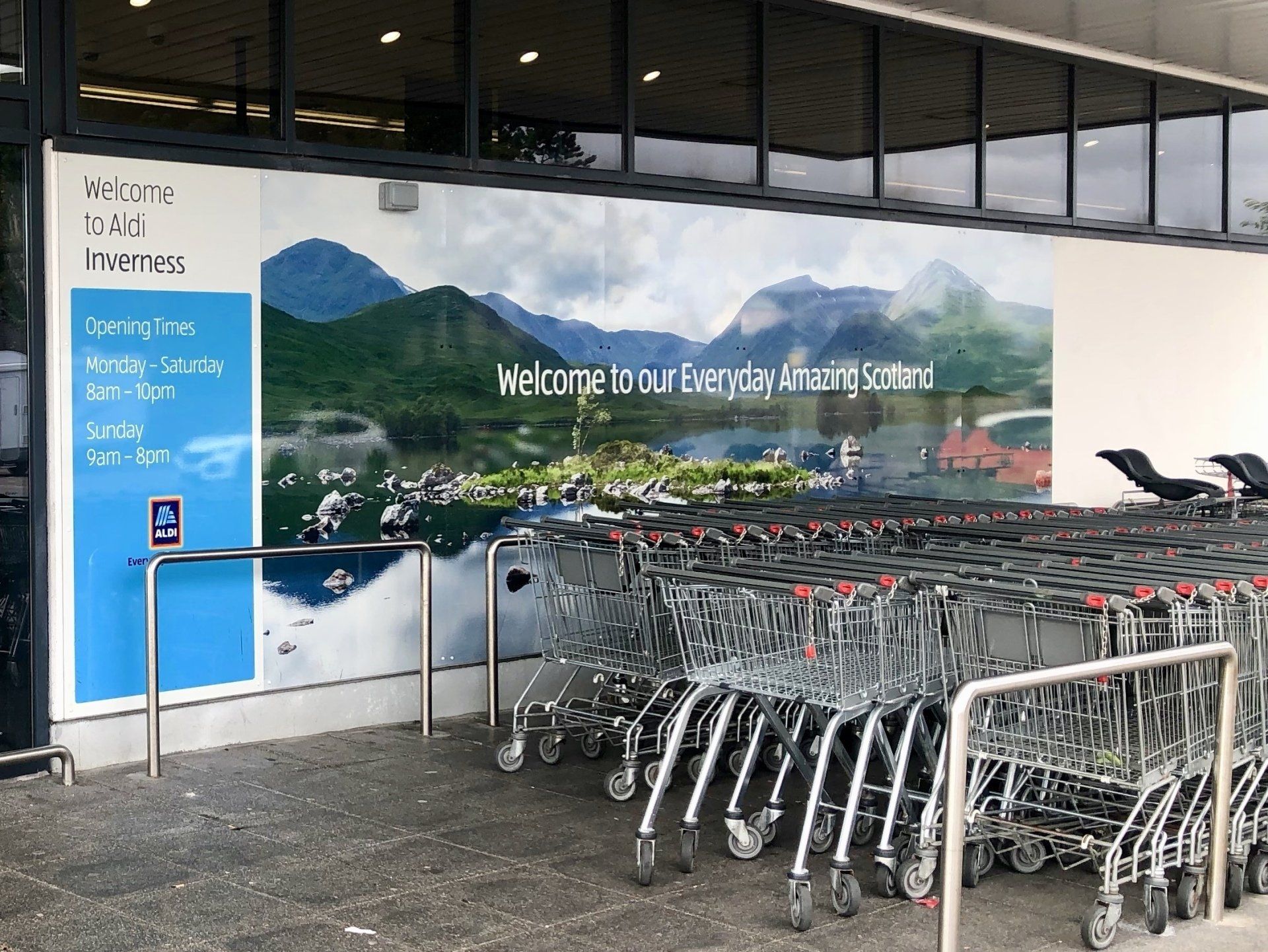 So habe ich den dann doch halbwegs trockenen Vormittag genutzt und bin zum 30 Kilometer entfernten Inverness gefahren, immer endlang am Loch Ness - da war doch was - nein, ist mir bisher nicht begegnet - Nessi - kommt vielleicht aber noch. Einkaufen war ich dann beim Scotland Aldi und die Aufschrift hier (zu beachten sind auch die Öffnungszeiten), gefällt mir ebenfalls, sodass ich sie Euch nicht vorenthalten möchte. Ein kurzer Spaziergang durch die Innenstadt mit einem Abstecher zum Royal Post Office, dort habe ich in einem Royal Padded Envelope