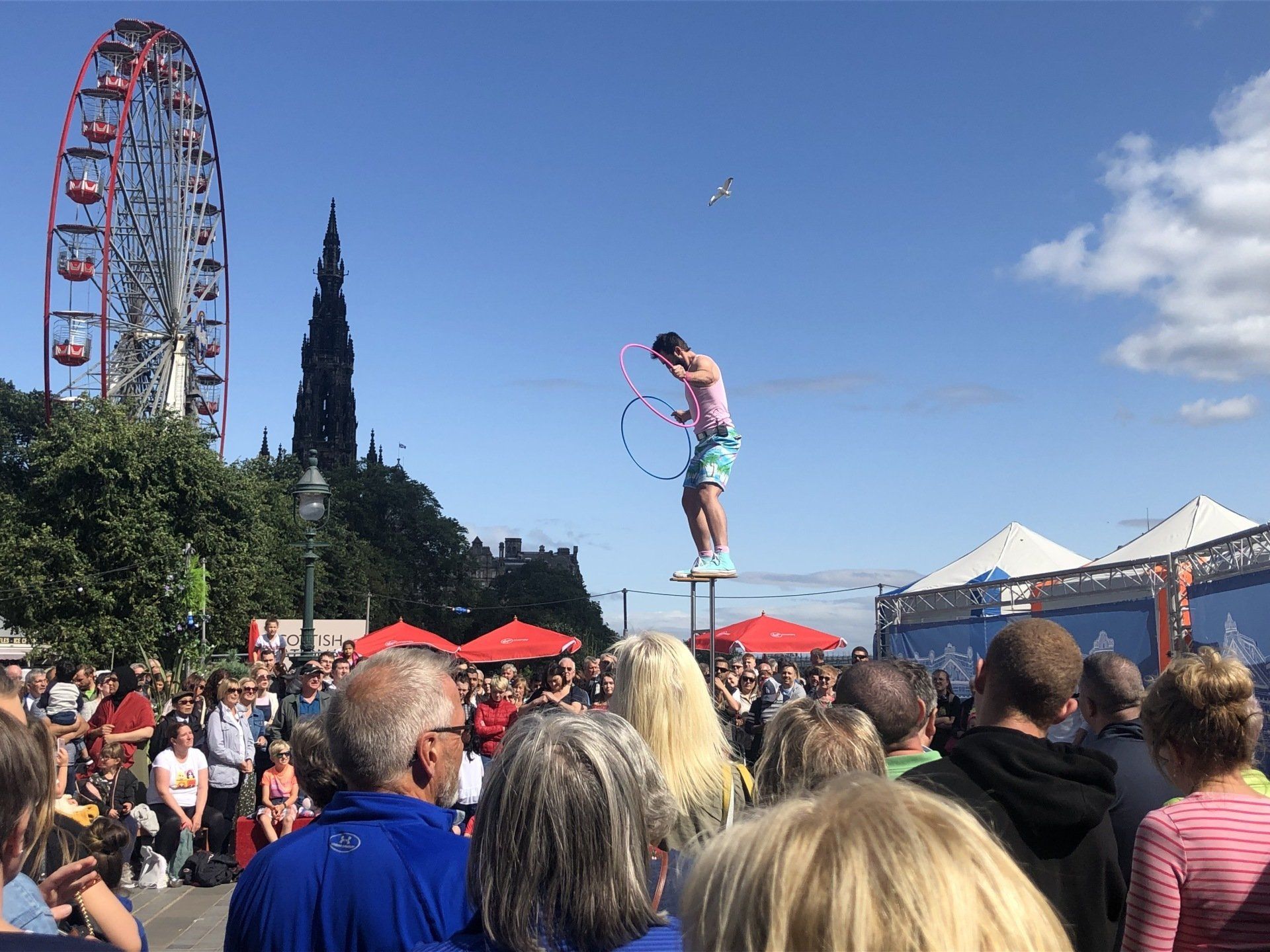 gut schmecken und dann ziehe ich zu den Vorstellungen weiter. An dieser Stelle war ich von 22 Jahren schon einmal, damals mit der Familie, es hat scih doch sehr viel verändert, auch die Darsteller sind andere geworden und den Jahrmarktcharakter (Zauberer und Gaukler), den ich in Erinnerung hatte, ist vollkommen verschwunden - leider. Dafür gibt es andere Attraktionen, die überwiegend aus Comedy bestehen. Die Künstler schaffen es alle, ihr Publikum mit einzubeziehen. Das ist bei allen Auftritte zu beobachten, ohne dem geht wohl nicht mehr. Wei Bilder unten sind Auftritte von zwei Künstlern an unterschiedlichen Orten, die beide jedoch auf Akrobatik setzen, wie gesagt, unter Einbeziehung des Publikums. Interessanter sind da schon die kleinen Stände on Künstlern, die ihre Ware an den Mann oder an die Frau bringen möchten.