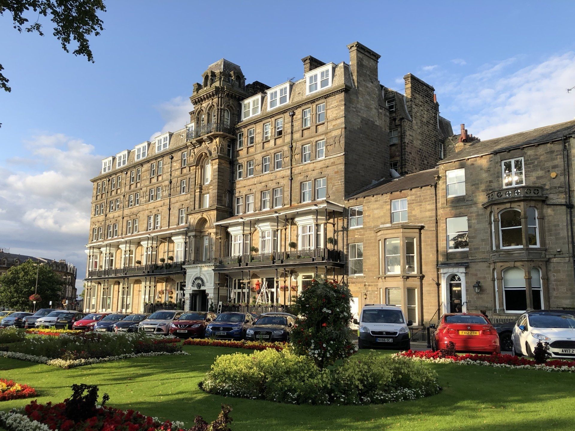 Um kurz nach 16:30 Uhr mache ich mich wieder auf den Weg, wir verabschieden uns, ins Navi ist Harrogate eingegeben und ich düse los. Gerade mal 40 Minuten und ich sollte in dem York - Nachbarort mein Hotel erreichen. Wenige Meter nach York beginnt sich ein Stau aufzubauen. Es geht nichts mehr, es kommen Autos entgegen, aber in meine Richtung bewegt sich nichts. Kurze Zeit später taucht ein Polizeiauto im Rückspiegel mit Alarmgeheul auf, dem folgt dann noch ein zweites und wenige Minuten später die Feuerwehr. Jetzt kommen auch aus der umgekehrten Richtung keine Fahrzeuge mehr. Es dürfte sich um einen heftigen Verkehrsunfall handeln. Ich drehe auf der Straße um und lasse mir von meinem Navi eine Alternativroute berechnen. Auch auf dieser Variante ist die Hölle los und kurze Zeit später kommt dann auch der Krankenwagen entgegen. Es dürfte also leider nicht bei Blechschaden geblieben sein. Nach ungefähr 30 Minuten Verzögerung erreiche ich "The Yorkshire", mein Übernachtungsquartier. Es scheint ein altehrwürdiges Haus zu sein (siehe unten: Haus und Lobby) was allerdings schon in die Jahre gekommen ist. Es ist mitten in der Stadt gelegen und ich erkunde gleich die Umgebung. In einem Pub mache ich halt, esse noch einen echt guten Cheeseburger mit Pommes, natürlich standesgemäß mit zwei Bier und gehe dann zu meiner Unterkunft.