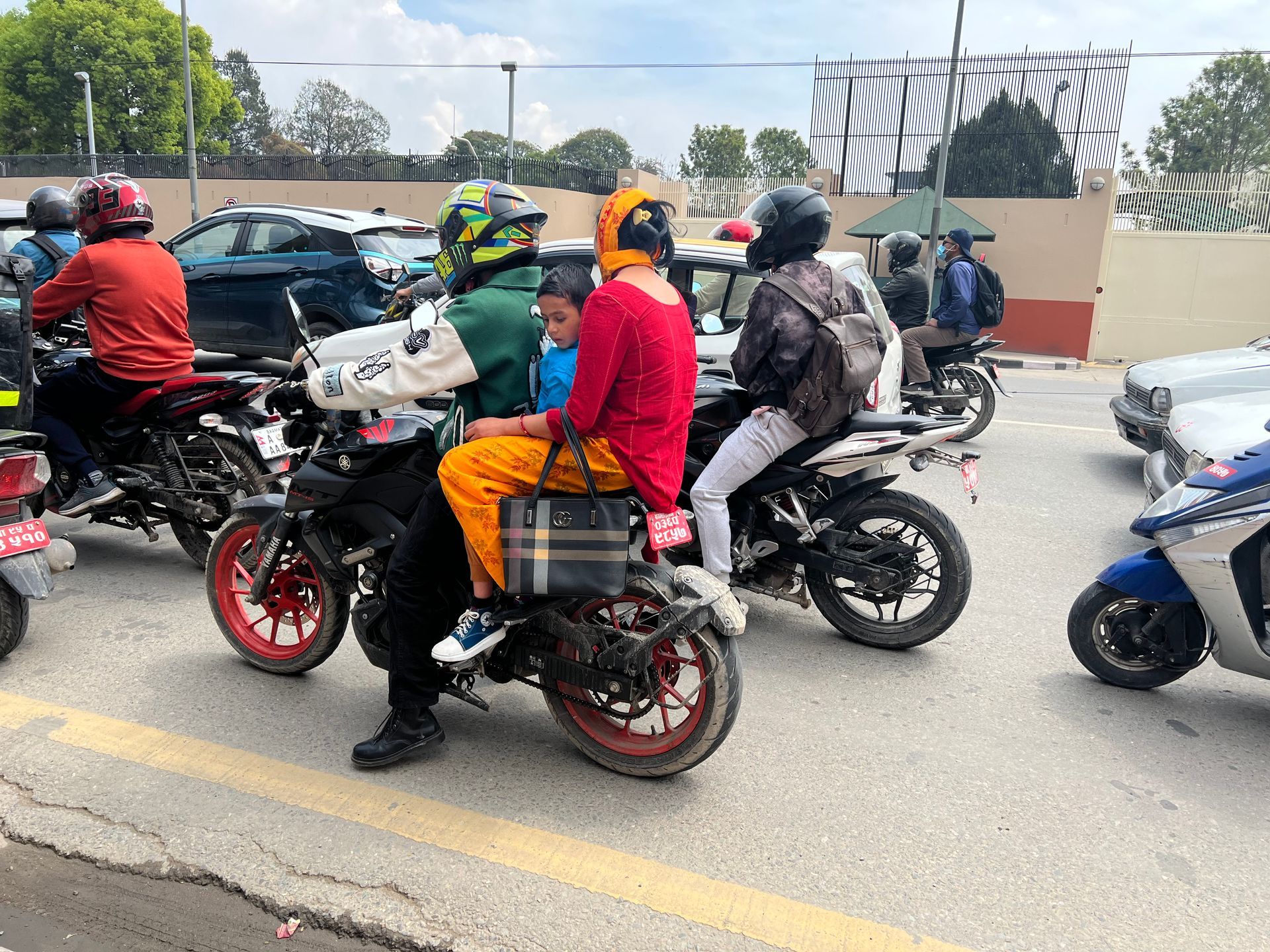 Ich begebe mich „in die Stadt“. Unterwegs begegnet man auch motorradfahrenden Kleinfamilien - und das gezeigte Beispiel ist bei weitem kein Einzelfall. Mein Ziel ist in die historische Altstadt. Zutritt zu dieser bekomme ich nur über ein entsprechendes Eintrittsgeld. Die Altstadt ist aber tatsächlich sehr sehenswert. Es reiht sich nahezu ein Tempel an den nächsten, betende Menschen sind davor anzutreffen, insgesamt ein beeindruckendes Bild. Gesammelte Informationen zu Kathmandu sind unter diesem Link zu finden