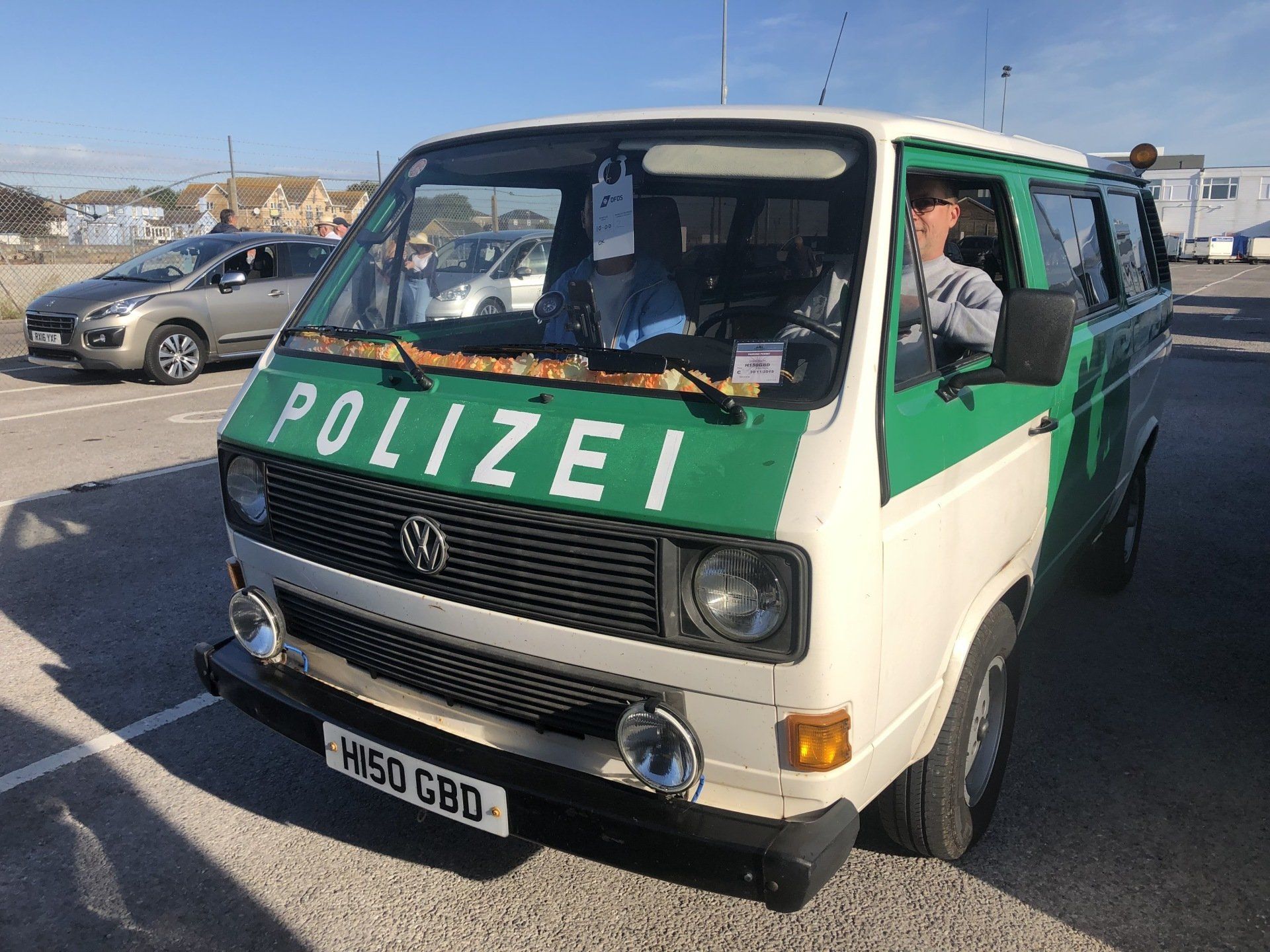 Dann biegt noch ein grün-weißes Polizei Auto um die Ecke. Ich traue meinen Augen nicht, denn das ist ja eigentlich unmöglich, ein deutsches Polizei Auto. Es verschwindet hinter Wohnmobilen und ich sehe es nicht mehr. Aber dieser "Erscheinung" muss ich nachgehen. Das weiß-grüne Auto hat ein britisches Kennzeichen, kann daher kein "offizielles" deutsches Polizei Auto sein. Nachgefragt und es stellt sich heraus, dass sie den VW Bus vor langer Zeit gekauft haben und mit diesem jetzt herumreisen. Sie sagen, dass das Grün typisch für Berlin war, ich habe aber in Erinnerung, dass diese Busse auch in NRW herumgefahren sind. Zu Bedenken gebe ich, dass Fahrten nach Deutschland mit diesem Bus wohl kaum möglich wären. Sie entgegnen, sollten sie in Deutschland damit fahren wollen, dann würden sie natürlich den Schriftzug "Polizei" abdecken - aber in UK ist es erlaubt und in Frankreich anscheinend auch, sie wollen ja dorthin. Ist schon witzig.