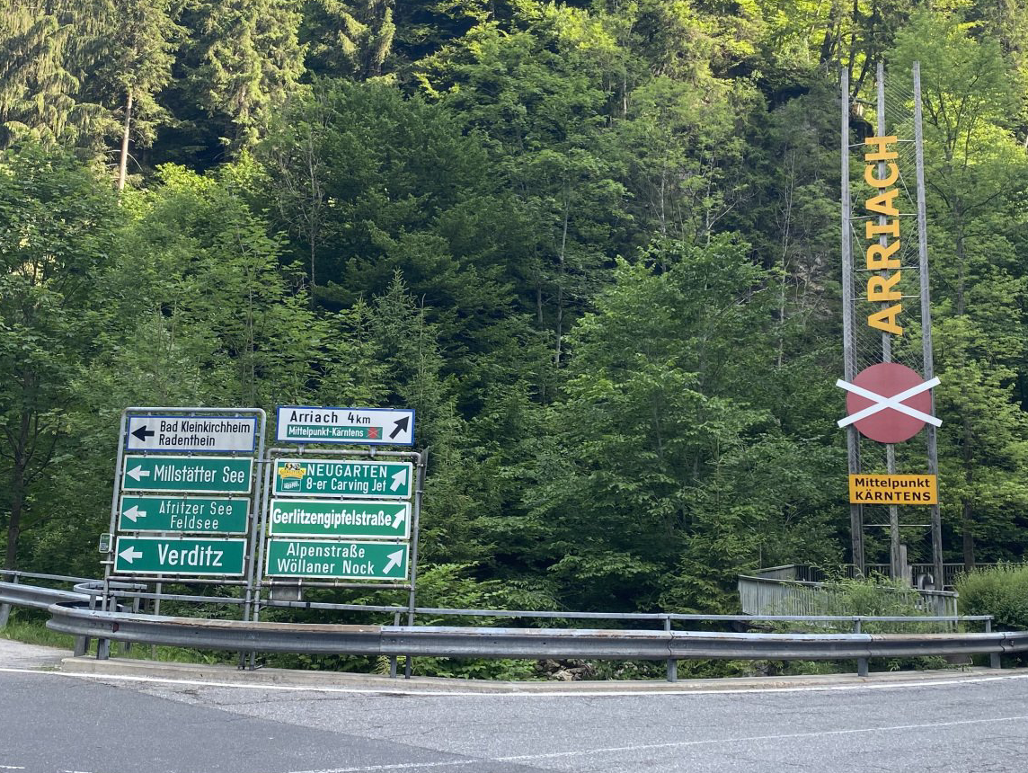 Wir fahren überwiegend auf Radwegen, teils auf Nebenstraßen und nur wenig auf Bundesstraßen zunächst 17 Kilometer den Wörthersee entlang, bis wir kurz vor Villach in nördlicher Richtung an der Burg Landskron vorbeikommen. Ein kurzes "Frühstück" bei einem Bild und wir erklimmen die Hochebene mit Affritzersee und Brennsee. Kurz vor dem Anstieg passieren wir noch den Mittelpunkt von Kärnten (die kleine gelbe Tafel unter dem Arriach Schild) und Affrtitz, den Heimatort von Mathias Mayer. Die Region Brennsee mit ihrem kleinen Örtchen Feld am See ist für mich ein persönliches Highlight. Ich habe hier meine allerersten Ferien in Österreich verbracht, damals mit meinen Eltern und Großeltern, sowie dem Bruder meines Vaters. Ich habe keine irgendwie geartete aktive Erinnerung an diesen Urlaub, ich kenne dies nur aus Erzählungen und von Bildern - zwei Bilder habe ich herausgesucht, die zum einen Feld am See zeigen und zum anderen den kleinen Andreas im zarten Alter von ungefähr 3 Jahren auf einem Heuwagen. Warum mir die Erinnerung fehlt ist ziemlich klar 😉, es ist immerhin ca. 58 her - wow eine kleine gefühlte Ewigkeit. Trotzdem sind dies meine ersten irgendwie gearteten Erfahrungen mit Österreich. Die damalige Anreise mit Zug und verschiedenen Bussen aus Wuppertal, war für die Verhältnisse der 60er Jahre eine mittlere Herausforderung und hat mehr als 24 Stunden gedauert.