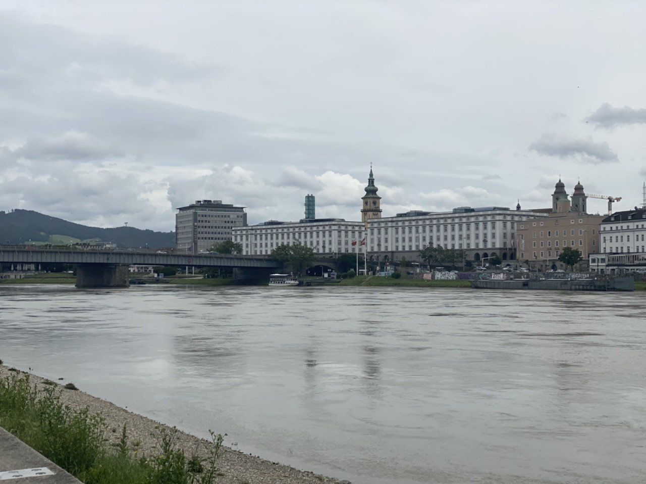Es geht weiter in Richtung Linz, an Wiesen und Feldern vorbei, das Wetter ist deutlich besser geworden und ich hoffe, es geht sich ohne Regengewand aus. Leider ist dem nicht so, kurz vor Linz beginnt es zu regnen und es bleibt mir nichts anderes übrig, als meine Regenjacke hervorzuholen. Es regnet nicht viel, aber eine Stadttour durch Linz, die ich ursprünglich mit eingeplant hatte, macht bei diesem Wetter nicht wirklich Sinn. Also erhasche ich einen kurzen Blick von der Nordseite der Donau auf das Linzer Stadtzentrum, passiere die Voest und dann sind es nur noch wenige Kilometer bis Mauthausen.