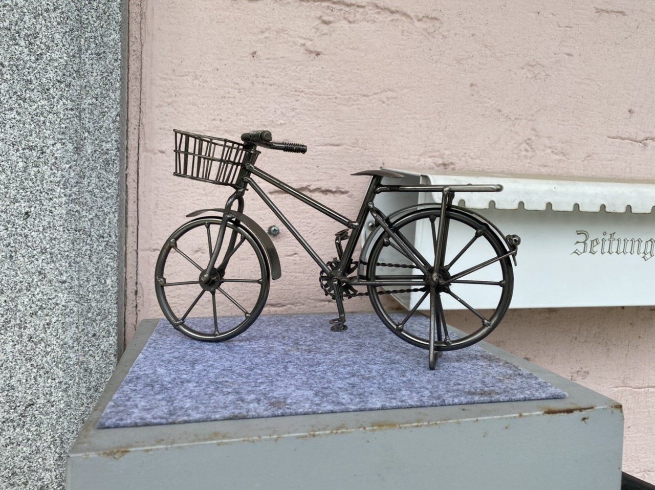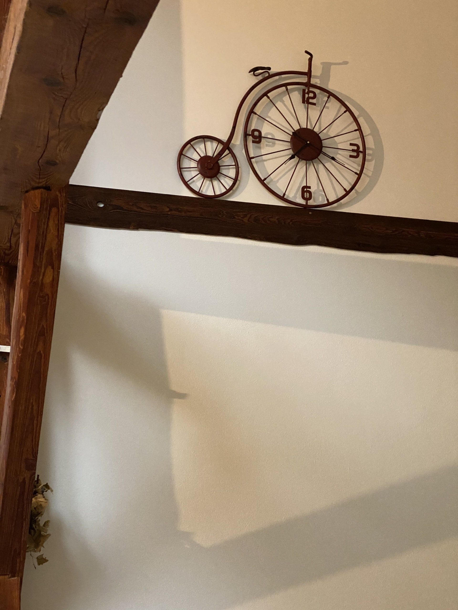 Schon die Rezeption ist im Grunde einzigartig, aber auch die kunstvoll gestalteten "Informationssteine" mit Info von WLAN Verbindung und Passwort auf dem Tisch im Zimmer sind erwähnenswert. Natürlich sieht man in vielem die Radverbundenheit und die Ausrichtung der Unterkunft für Radler. Besonders angetan haben es mir zwei Miniräder - soweit ich mich erinnern kann ein Mitbringsel aus Bolivien - sie sind voll funktionstüchtig. Die Kette lässt sich drehen, das Hinterrad bewegt sich dabei, sie haben Gummireifen und einen Ledersattel! Auch das originale Waffenrad aus dem Jahr 1929, was über dem Eingang zu meinem Zimmer steht ist sehenswert, genauso wie die Uhr im Frühstücksraum, ein Mitbringsel aus der tschechischen Partnerstadt. An vielen Stellen des Hauses und außerhalb des Hauses gibt es kleine Aufmerksamkeiten, die den Aufenthalt sehr angenehm machen. Die zwei kleinen Kätzchen auf der Bank beim Steinapfel, scheinen sich ebenso wohl zu fühlen.