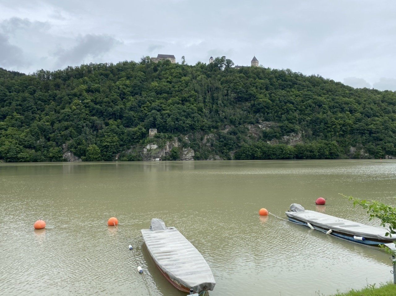 Ansonsten geht es ohne besonderen Vorkommnisse dahin. Es tauchen am Hang diverse Burgen auf, eine seht ihr unten und sehr viele Campingplätze mit überwiegend Dauercampern sind am Ufer zu finden. Bei Aschach wird von der südlichen auf die nördliche Seite der Donau gewechselt. Um über die Donaubrücke zu kommen, führt der Weg direkt hinter der Kirche hinauf in den Ort und von dort auf die Brücke. Von der Donaubrücke zeigt sich ein sehr schöner Blick auf den kleinen Ort.