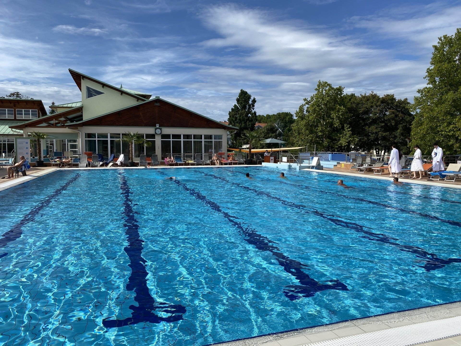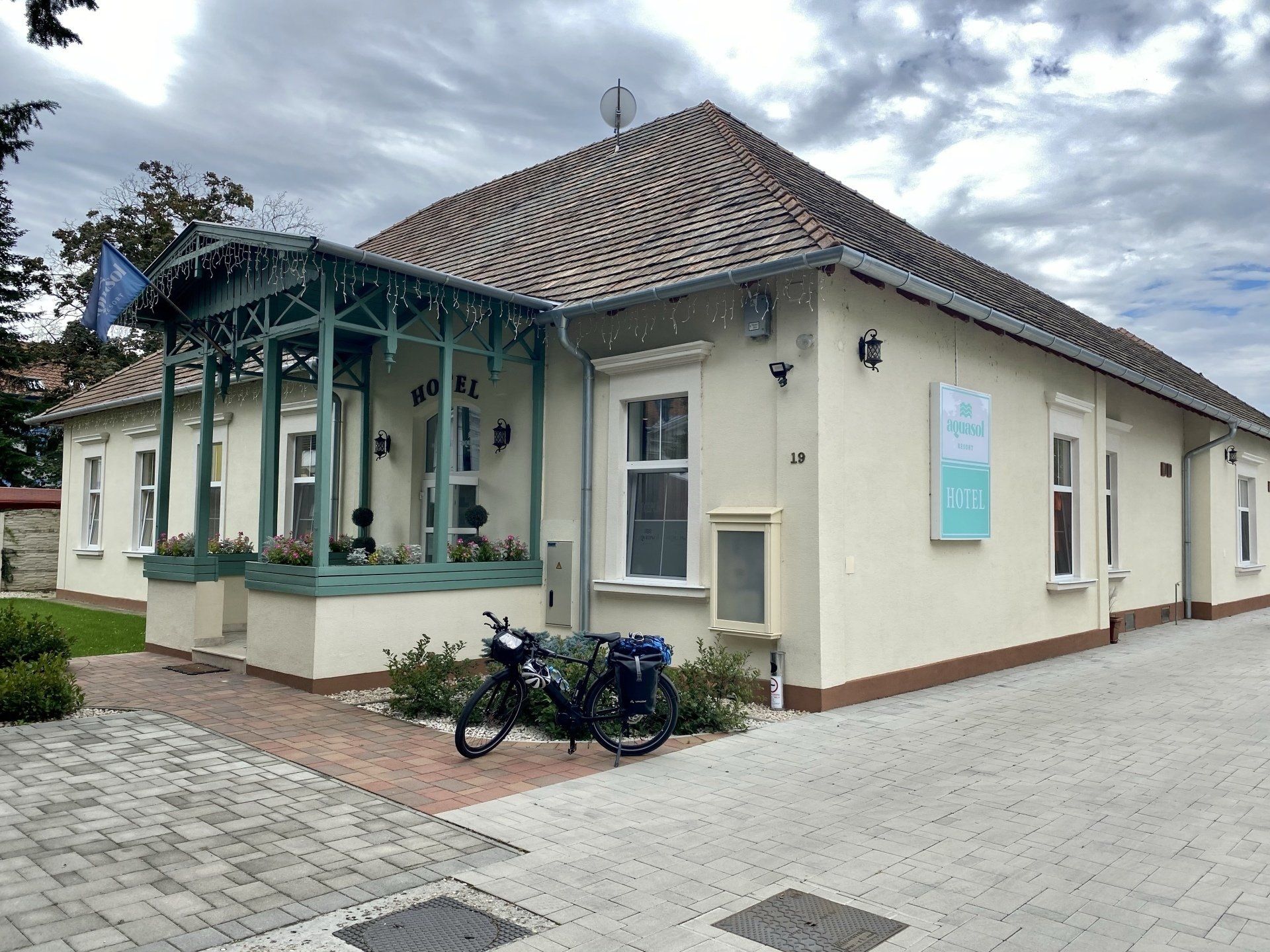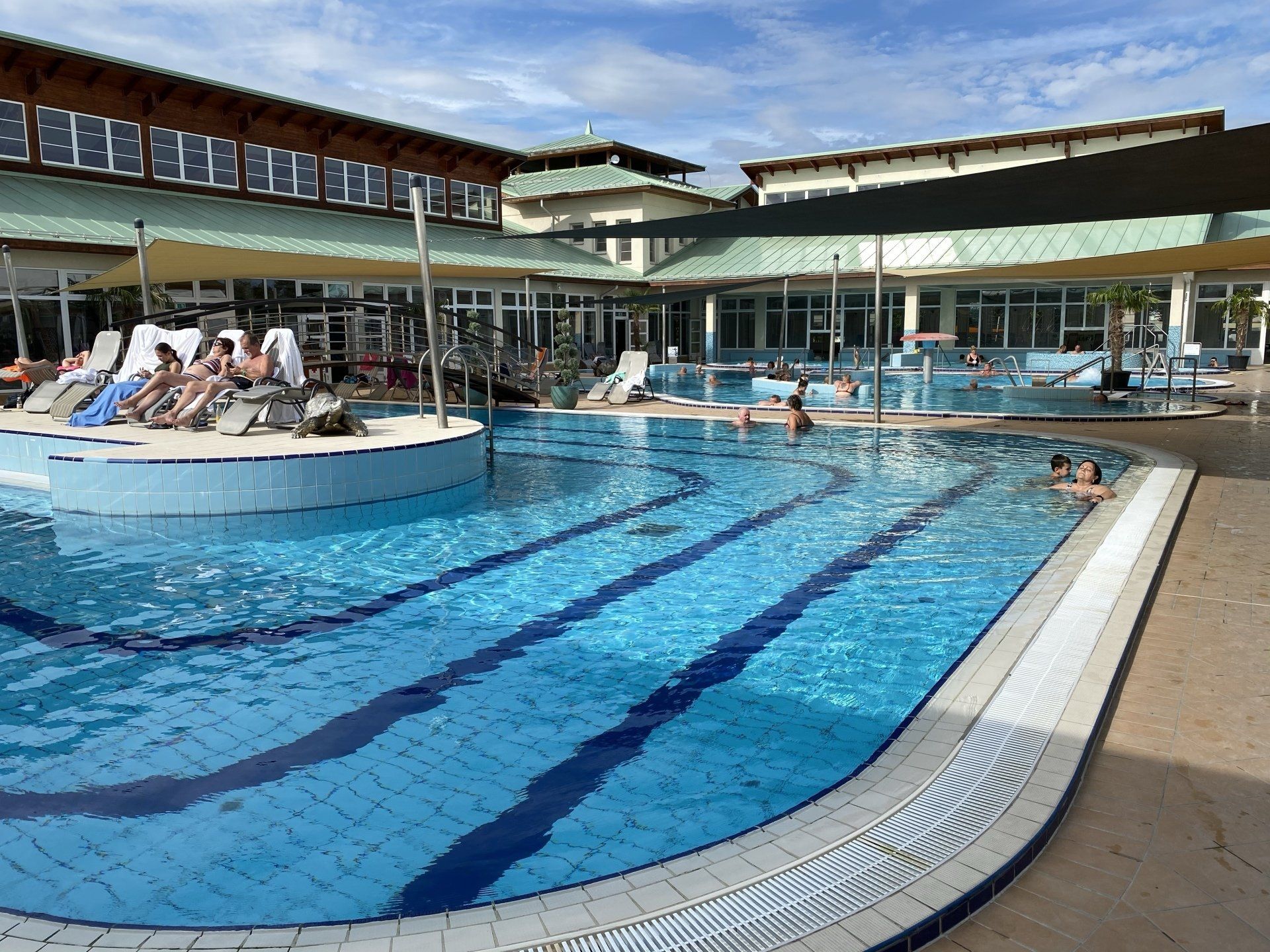 Nach einer kurzen Rast frage ich bei der Rezeption nach, wie ich denn zur Therme komme, direkt am Haus angegliedert ist ein kleiner Pool. Meine verständnisvolle Dame reicht mir einen programmierten Chip an einem Armband, mit dem ich die nächsten drei Tage (also auch am Abreisetag) kostenlosen Zugang zur Therme habe. Dieses werde ich gleich in Anspruch nehmen; ich schnappe mir mein Handtuch, meine Badehose und gehe die fünf Minuten zum Platsch- und Schwimmvergnügen. Tatsächlich öffnet der Chip am Eingang das Drehkreuz, ich suche die Kabinen und tauche ins kühle Nass ein, um 60 Längen der 25 Meterbahn herunterzuspülen. Irgendwie haben mit die 1,5 Kilometer Schwimmen in den letzten Wochen dann doch gefehlt - ich werde das hier täglich machen und sehr sehr wahrscheinlich auch am Abreisetag, bevor ich dann nach Györ radele. Die Therme ist perfekt, es macht Spaß, es sind wenige Menschen hier und ich habe eine Bahn für mich alleine, die ich die nächsten 40 Minuten nutzen kann. Neben dieser 25 Meterbahn gibt es noch eine Indoor 33 Meterbahn, aber heute, bei diesem Wetter, ist es im Freien ein Traum!