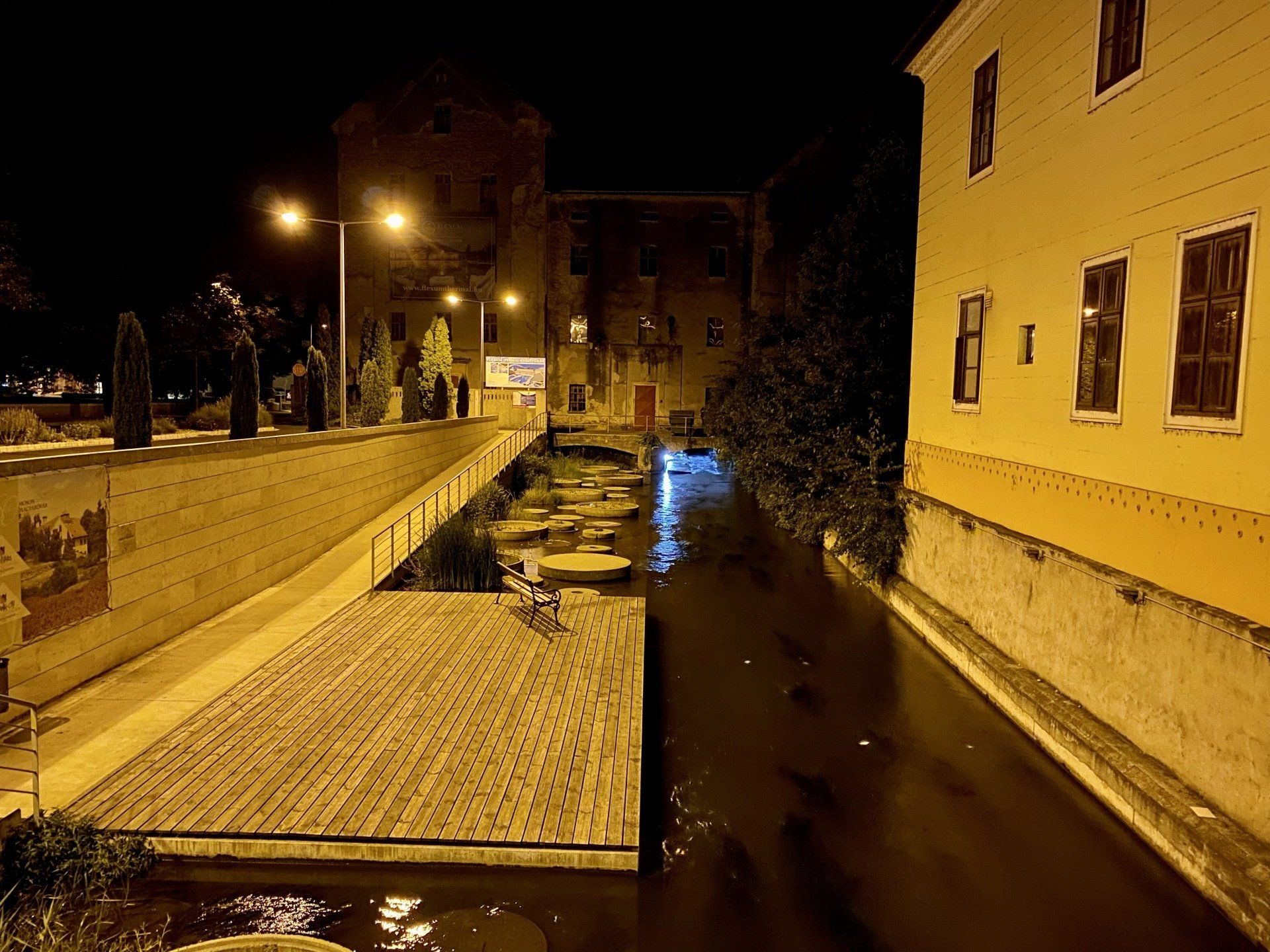 Nun, es ist jetzt kurz nach Halbzehn - da war der Wunsch wohl Vater des Gedanken. Als ich mich vor zwei Stunden zum Pool aufgemacht habe, war dieser, wie erwartet hell beleuchtet ... das Restaurant war aber geschlossen. Dann gibt es also einen abendlichen Stadtspaziergang mit netten Bildchen, soll auch sein ;-). Ich denke nicht, dass Ungarn nach 20 Uhr eine Ausgangssperre hat, zumindest habe ich nichts in dieser Richtung gefunden, es fühlt sich aber so an. Es muss wohl daran liegen, dass spätestens um 20 Uhr die Bürgersteige hochgeklappt werden und kaum ein Mensch mehr auf der Straße anzutreffen ist. Fast kein Mensch - ich habe noch ein tschechisches Pärchen entdeckt, die auch im Thermalbad waren und in einem Restaurant zu sehr späten Stunde noch etwas Essen waren. An einem Nachbartisch habe ich mit ihnen noch gemeinsam ein Bier (ich), sie einen Wein getrunken. Die Bilder unten sind eindrucksvoll, doch mit Bratislava verglichen, wo ich um 23 Uhr nichts mehr ausgeschenkt bekam, sehr verlassen. Dieser Ort ist wohl nicht der typische Touristenort, auch wenn vor "meinem" Hotel Autokennzeichen aus Schweden, Niederlande, Österreich, Deutschland, Slowakei und natürlich Ungarn zu finden sind. Warum dies möglicherweise so ist, den Versuch einer Erklärung liefere ich morgen ;-) ...