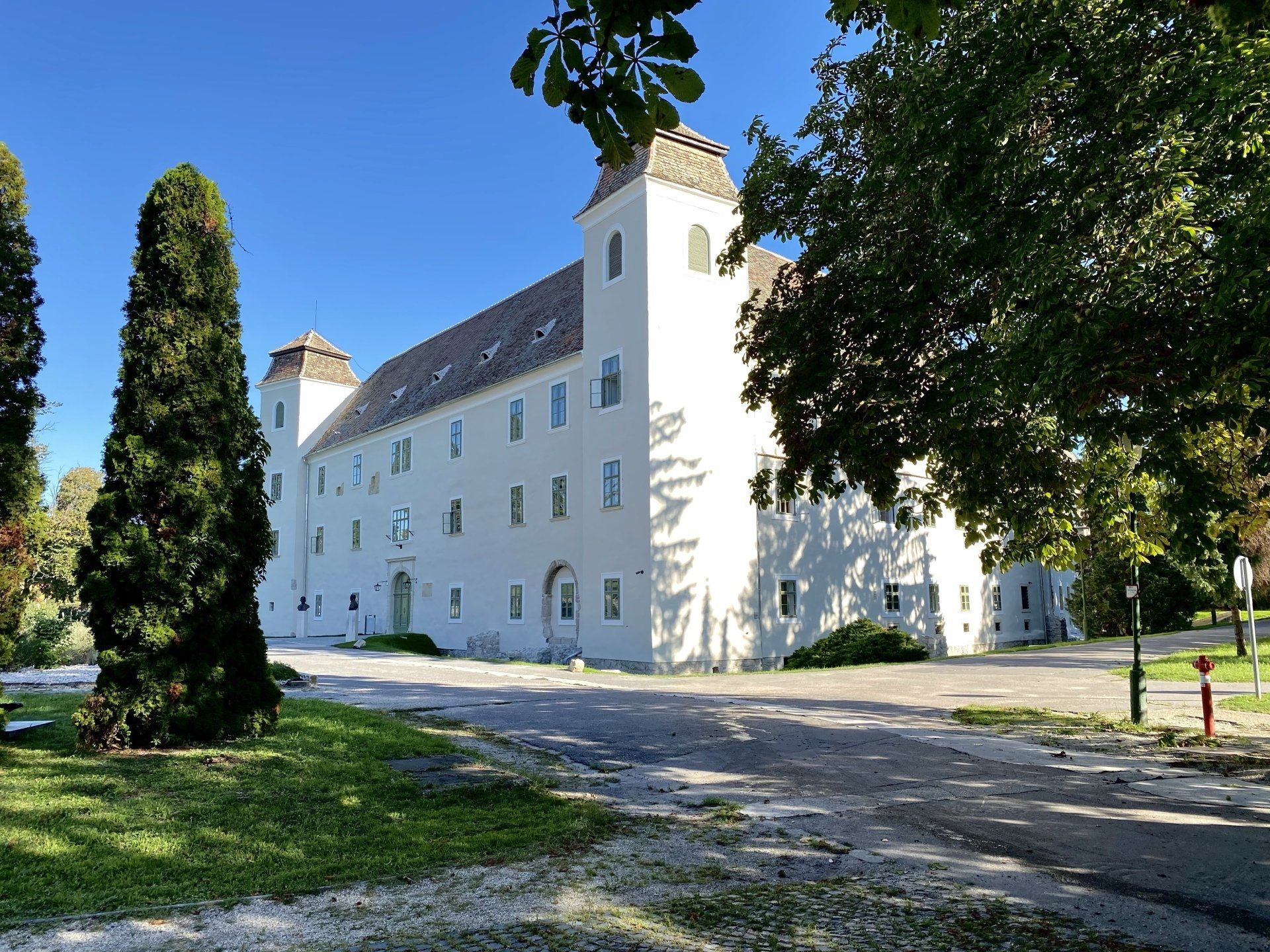 an und versorge mich mit einem Stückchen Käse und einem Kornweckerl, welches dann auf einer Parkbank unweit vom Schloss verzehrt wird. Um 13 Uhr starte ich den nächsten Versuch und siehe da, ich kann mein Zimmer beziehen. Ich habe die Deluxe