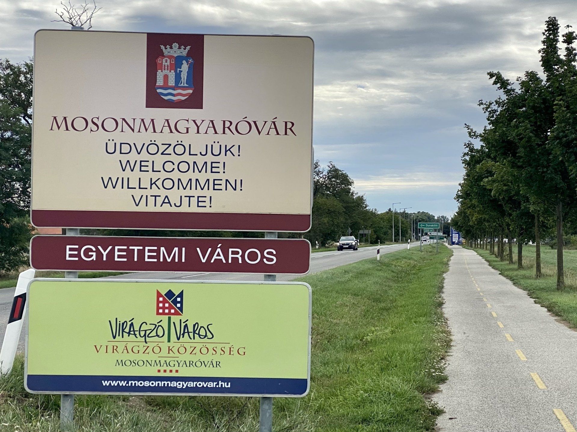 eingefügt - tja ... Tatsächlich erscheint nach den besagten fast 10 Kilometern die Willkommenstafel des Ortes und gleich danach das eigentliche Ortsschild, was doch eine Überraschung bringt. Ich hatte es zwar schon gelesen, dass der Ort in Deutsch Wieselburg-Ungarisch-Altenburg