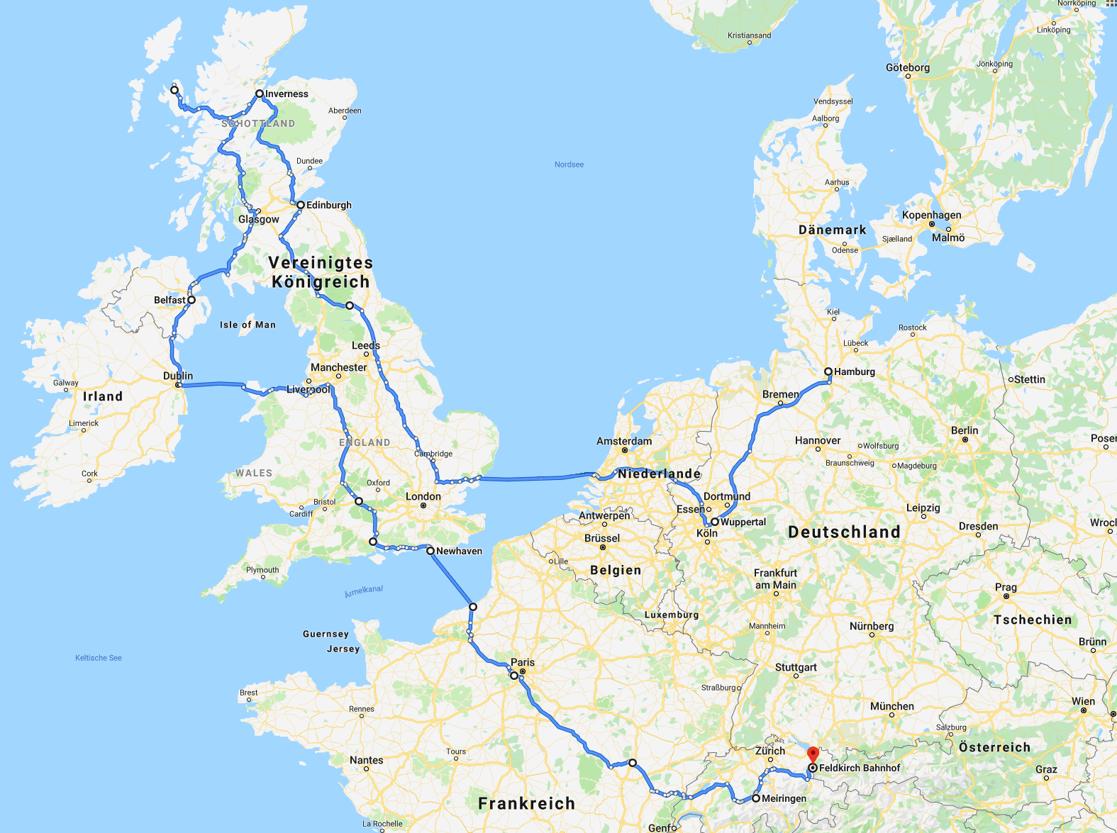 gefahrene Gesamtstrecke aufgezeichnet. Diese wurde diesmal in Google Maps "nachgezeichnet" und entspricht zu mehr als 95% der gefahrenen Strecke. Entsprechende Ausflüge etc. fehlen auf dieser Karte. Google Maps gibt bei dieser Planung 4.700 Kilometer an; wie gesagt, es fehlen sämtliche Ausflüge.