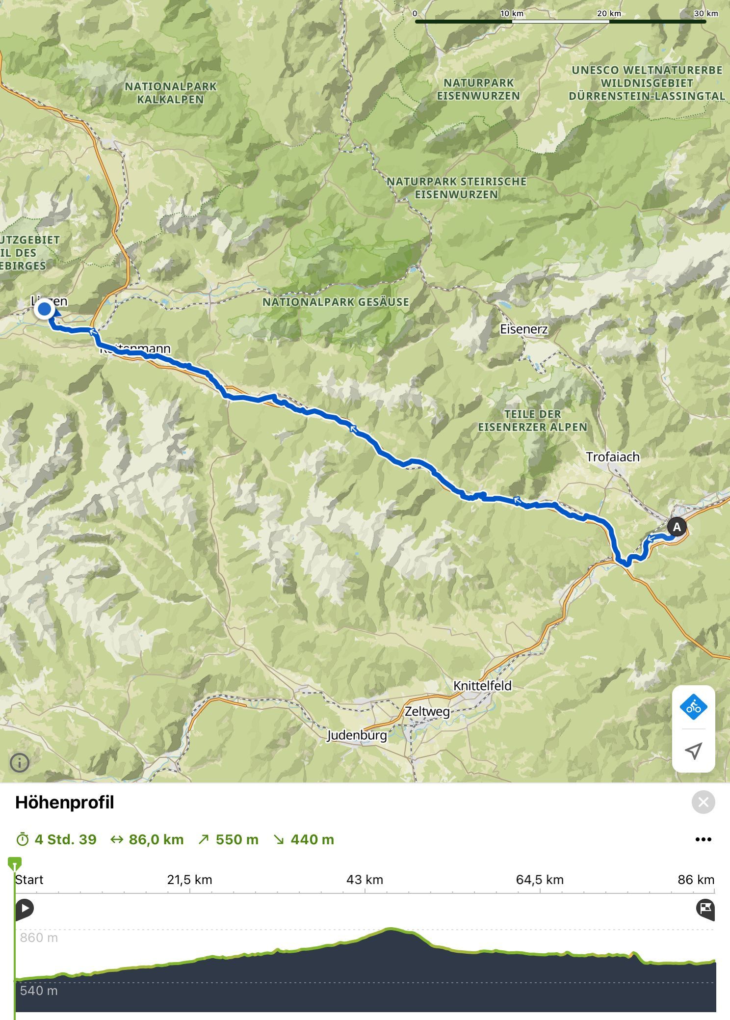Gefahrene Strecke: 86 Kilometer, Fahrzeit: 3:52 Stunden, Unterwegs mit Pausen: 4:39 Stunden, Höhenmeter: 550m