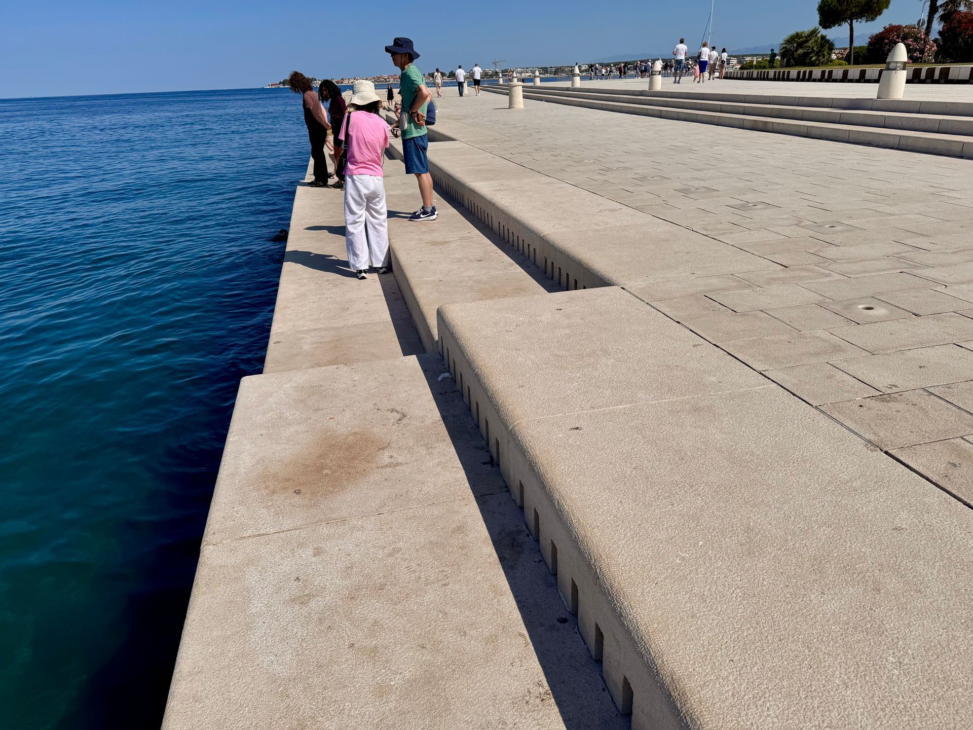 Um 8:30 geht's los, es ist sehr sehr angenehm, 24 Grad und für Zadar wird eine Höchsttemperatur von 28° vorausgesagt. 25 Minuten Fahrt, zunächst die Küste entlang und dann quer durch die Stadt bis zur "Alten Stadt" und meinem ersten Highlight, ist ein echtes Highlight, das Wahrzeichen dieser Stadt, die Meeresorgel - Morske orgulje. Zunächst einen Parkplatz gesucht, eigentlich direkt beim Kunstwerk, umgezogen, alles verstaut und gesichert. Die Meeresorgel wurde 2005 eröffnet und ist ein weltweit einzigartiges Kunstwerk, das Natur und Musik auf beeindruckende Weise vereint. Die Morske orgulje befindet sich an der Uferpromenade am Nordwestende der Altstadt von Zadar. Die Meeresorgel besteht aus einer 70 Meter langen Treppe, die sanft ins Meer abfällt. Unter den Stufen liegt ein System von 35 Röhren, das durch die Wellenbewegungen des Meeres Töne erzeugt.
