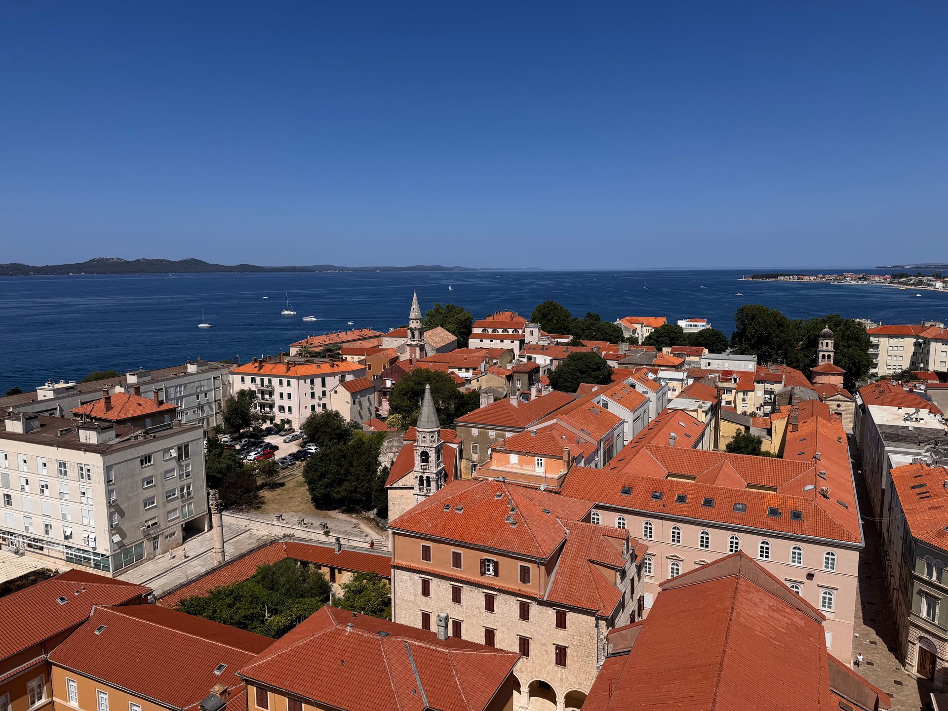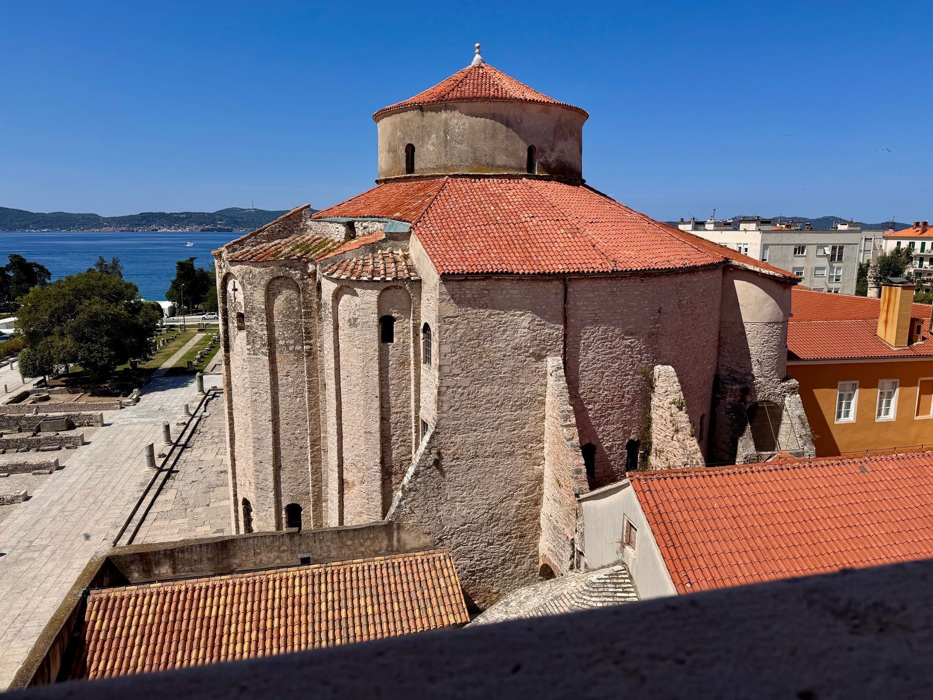 Der hinter der Kirche in den Himmel ragende Turm kann bestiegen werden, die viele Stiegen andauernde Fitnessübung kostet 4€, bietet aber einen hervorragende Blick über di Altstadt und die gesamte Stadt Zadar, sowie der wunderschönen Küstenlandschaft mit dem tiefblauen Meer.