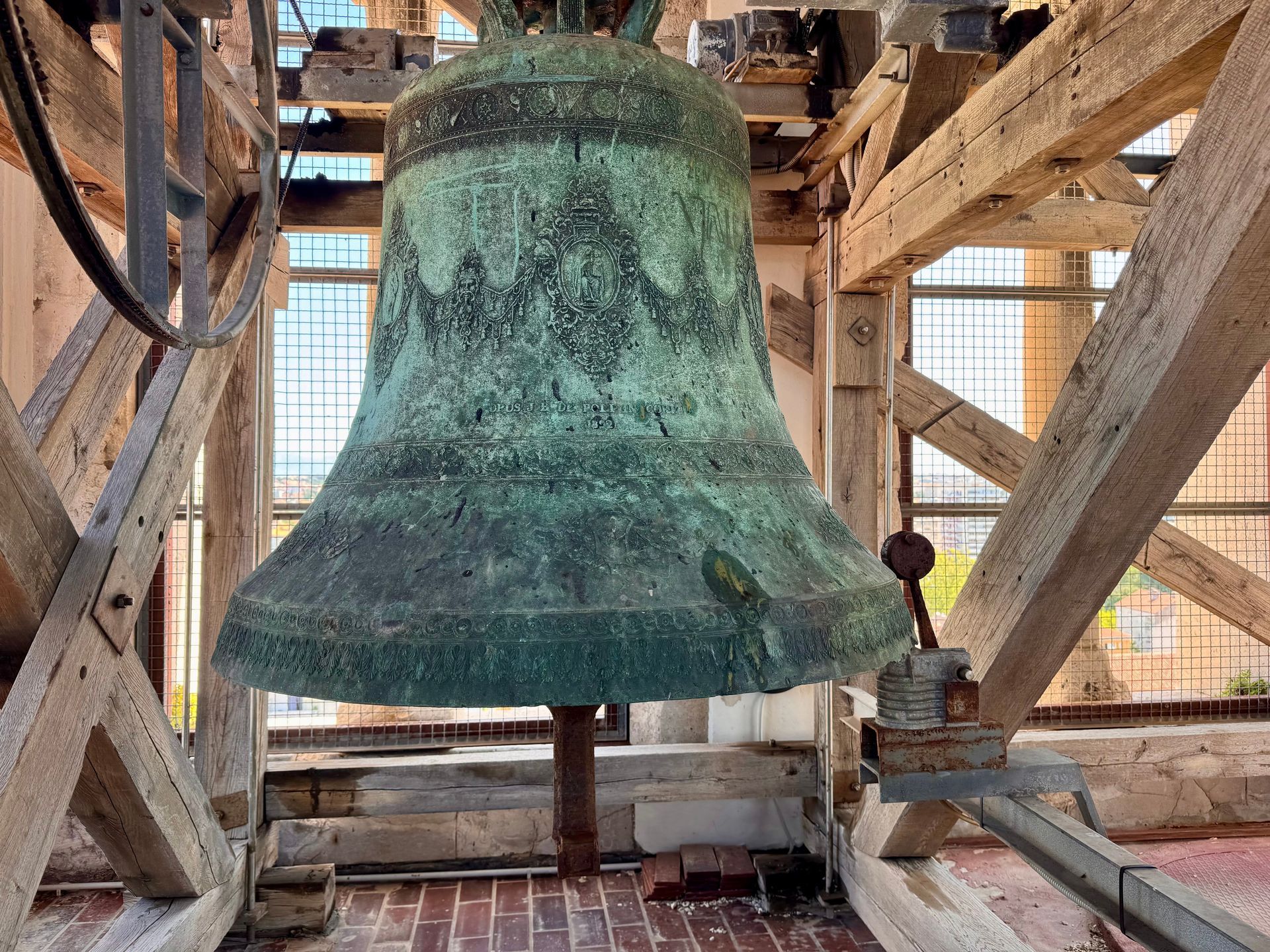 Am Anfang der Besteigung dachte ich mir, wenn das mit den engen Stegen so weitergeht, wird es schwierig mit dem Gegenverkehr, ab der zweiten Ebene öffnet sich der innere Turm etwas und die Stiegen sind deutlich breiter, bis sie beim letzten Stock, zur Aussichtsplattform, in eine schmale und enge Wendeltreppe übergehen, aber seht selbst. Von einem Zwischenstock hat man eine hervorragende Aussicht auf das Hauptgebäude. Die Stiegen gehen direkt an den Glocken vorbei und diese sind in Betrieb, dass heißt, es kann jederzeit ein Glocke einem das Trommelfell reizen. Den Plan und die Beschreibung des Turms findet ihr zum Nachlesen ebenfalls eingefügt.